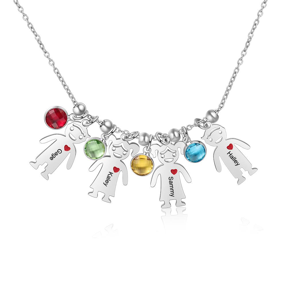 Collar para mujer personalizado con 5 nombres en dijes de niño y 5 piedras de nacimiento