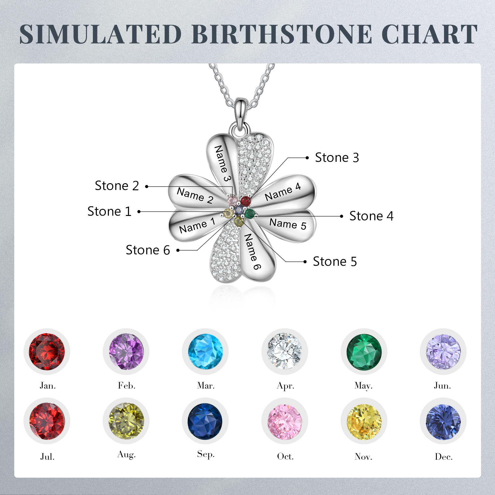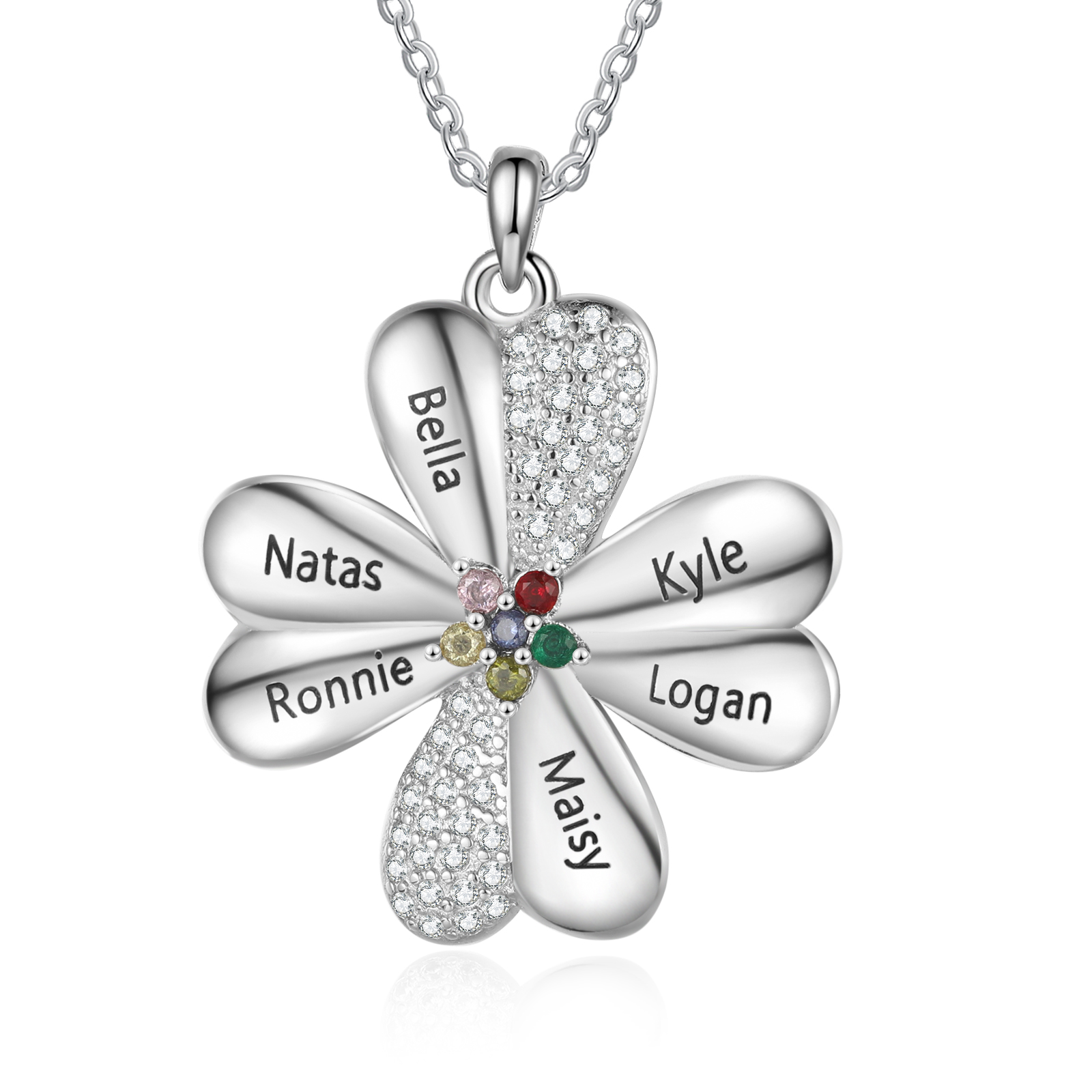 Collar para mujer de trébol de cuatro hojas 6 nombres y 6 piedras de nacimiento personalizados