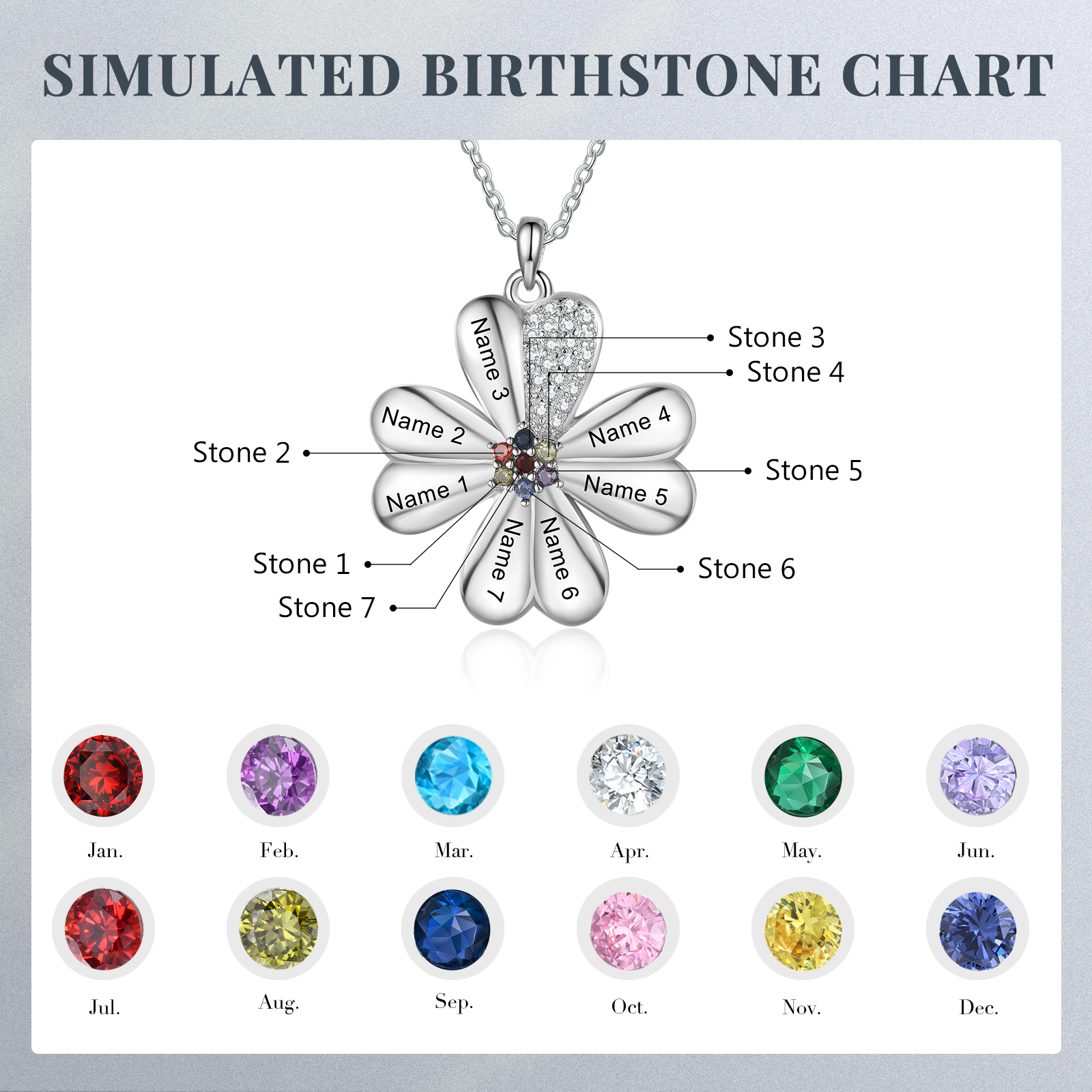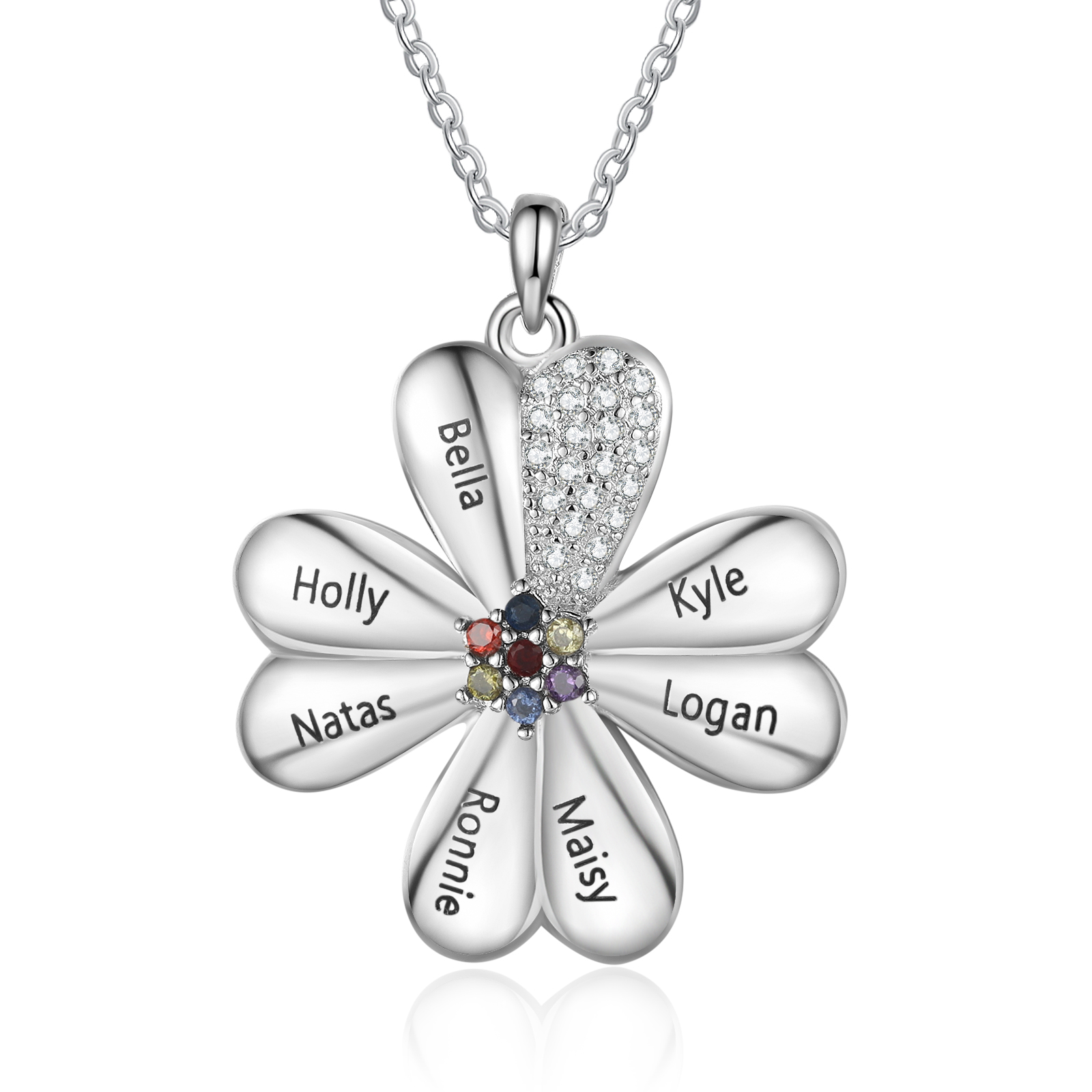 Collar para mujer de trébol de cuatro hojas 7 nombres y 7 piedras de nacimiento personalizados