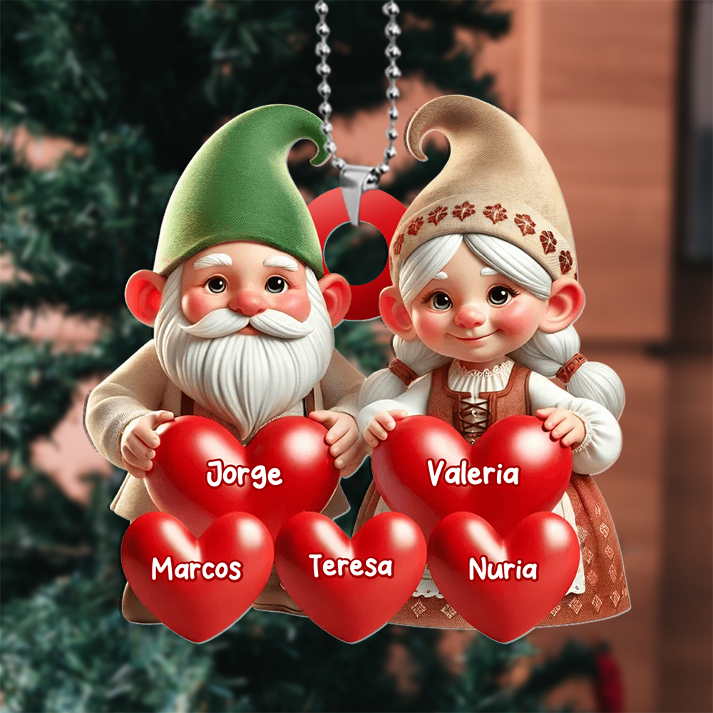 Adorno para el árbol de Navidad - Ornamento para el árbol de Navidad, familia de gnomos - corazones y nombre personalizados