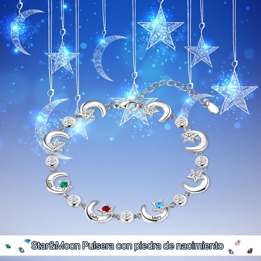 Pulsera para Mujer Luna y Estrella Personalizada con 2 Nombres y 2 Piedras de Nacimiento