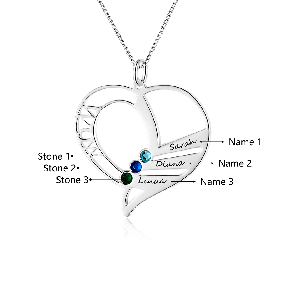 Collar a mamá "mom" de corazón 3 nombres personalizados con 3 piedras de nacimiento