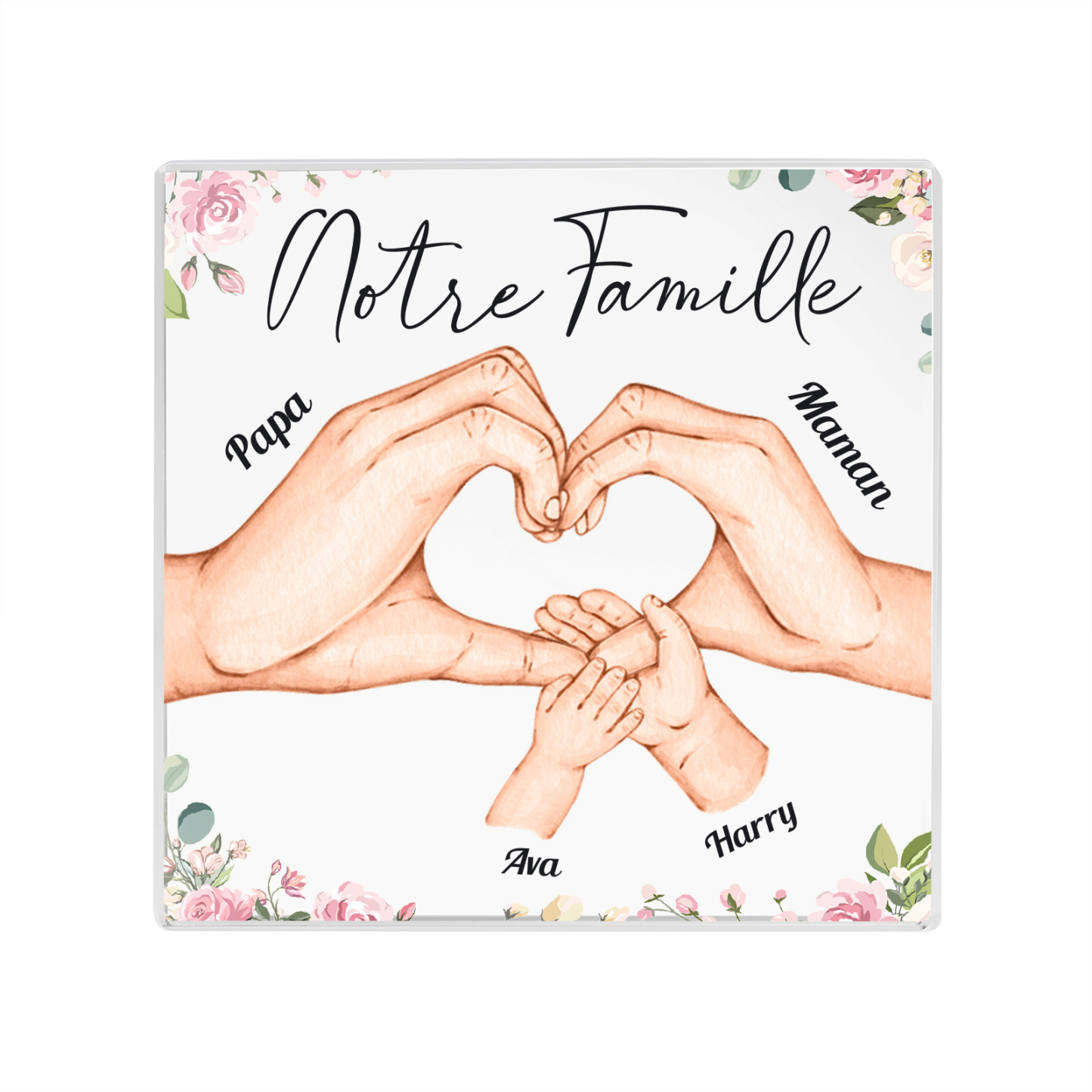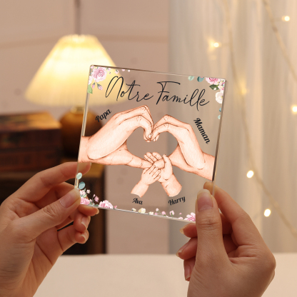 A familia-Placa de acrílico en forma de cuadro con 4 nombres y 1 texto personalizados mano con mano