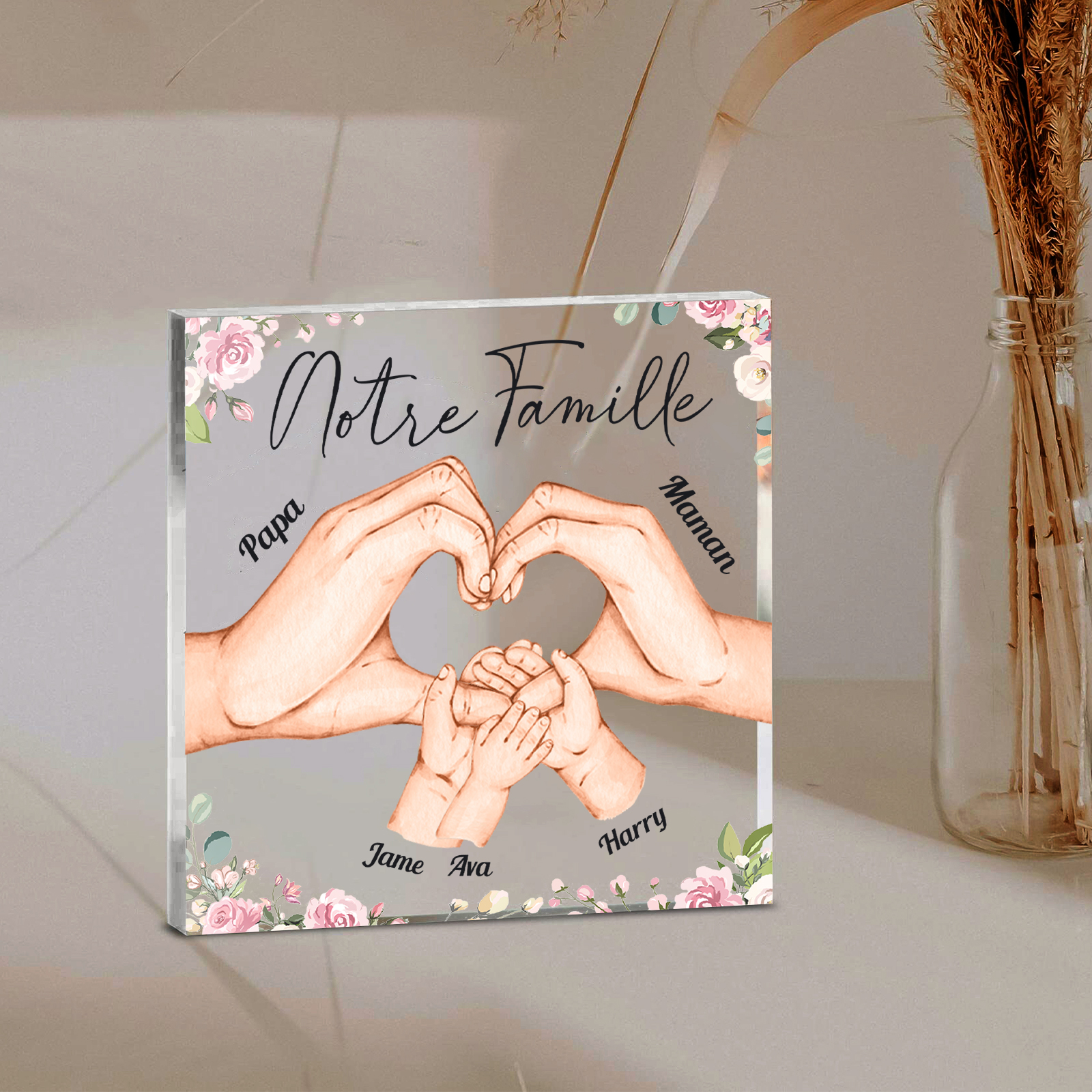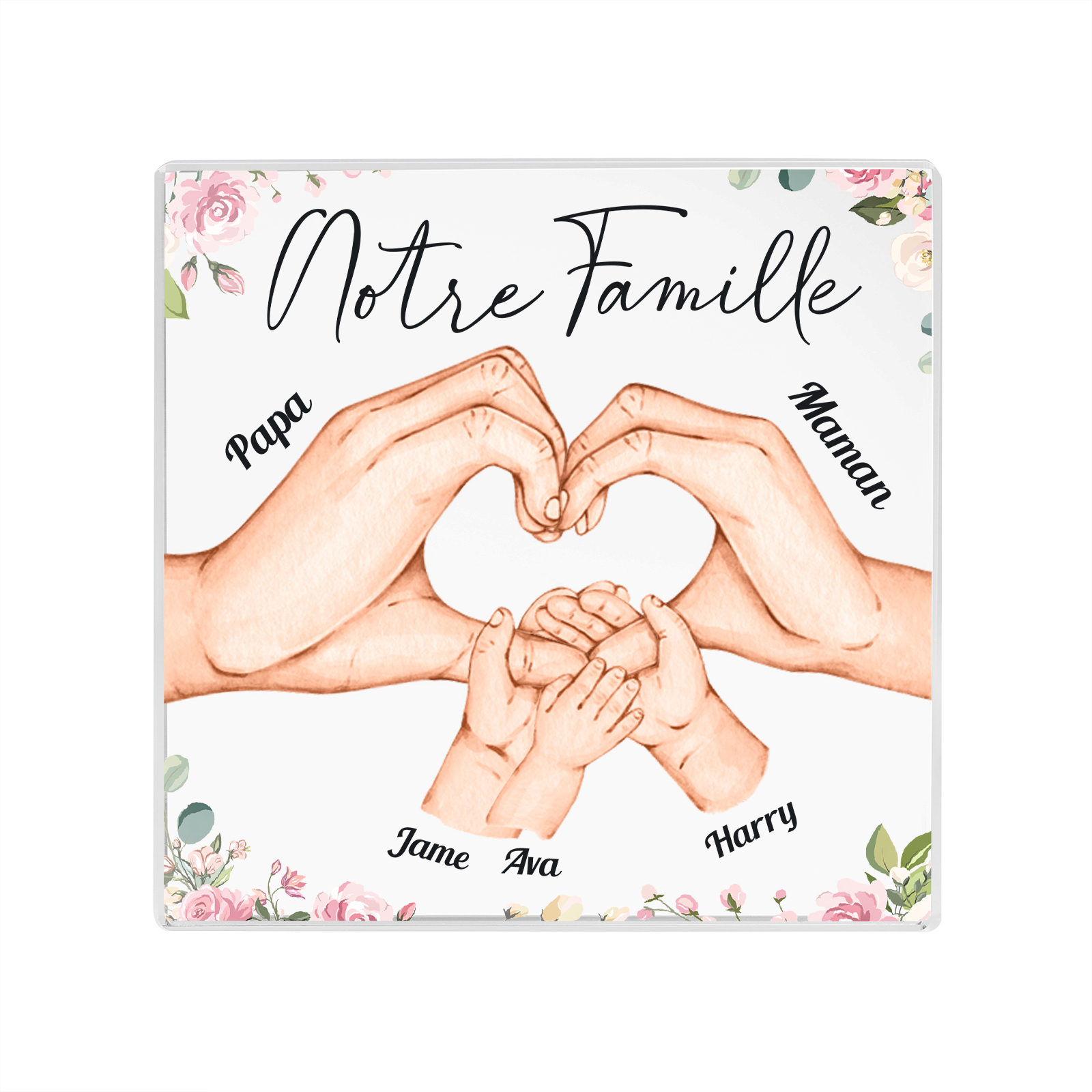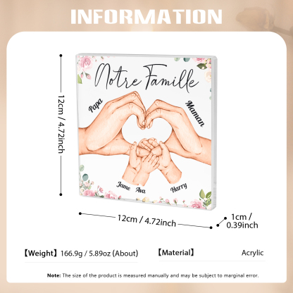A familia-Placa de acrílico en forma de cuadro con 5 nombres y 1 texto personalizados mano con mano