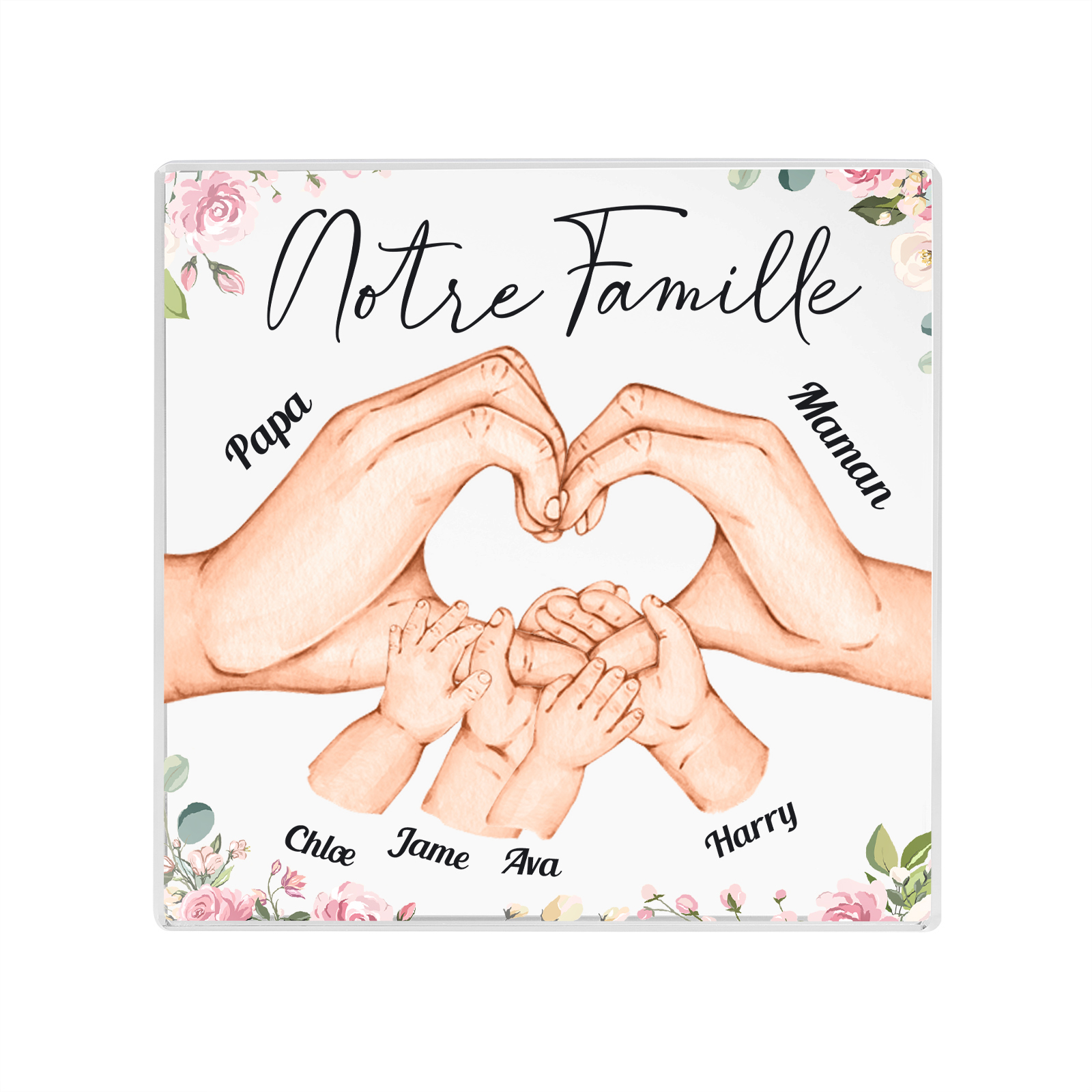 A familia-Placa de acrílico en forma de cuadro con 6 nombres y 1 texto personalizados mano con mano