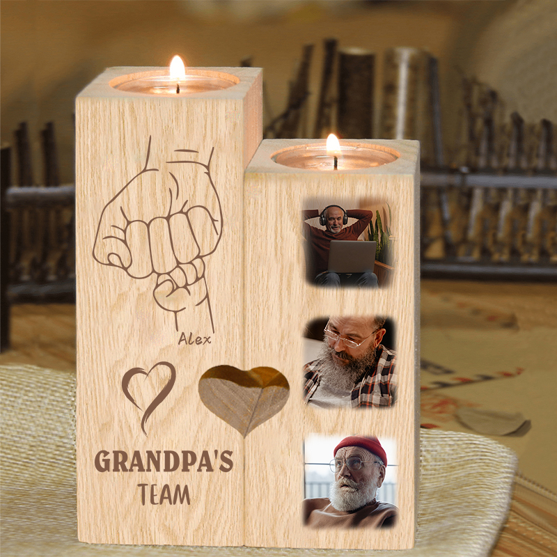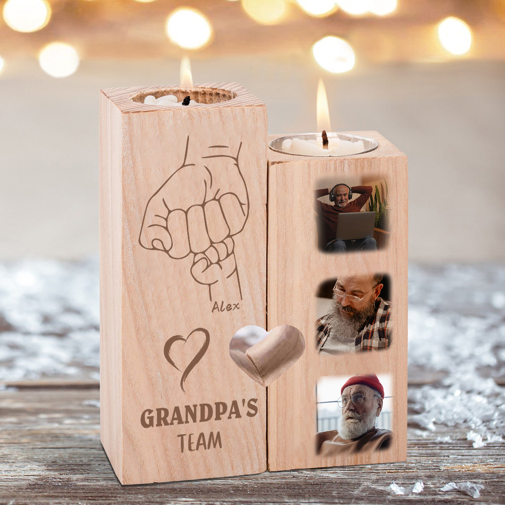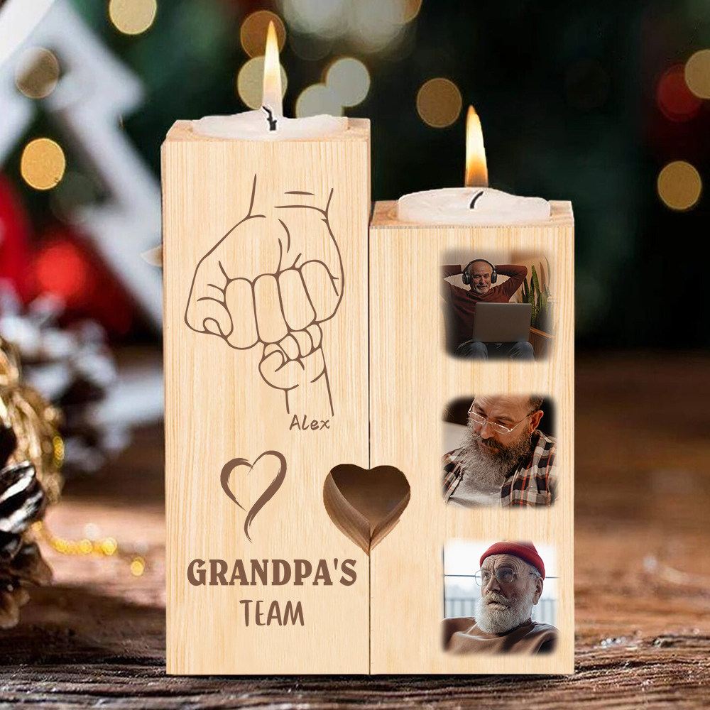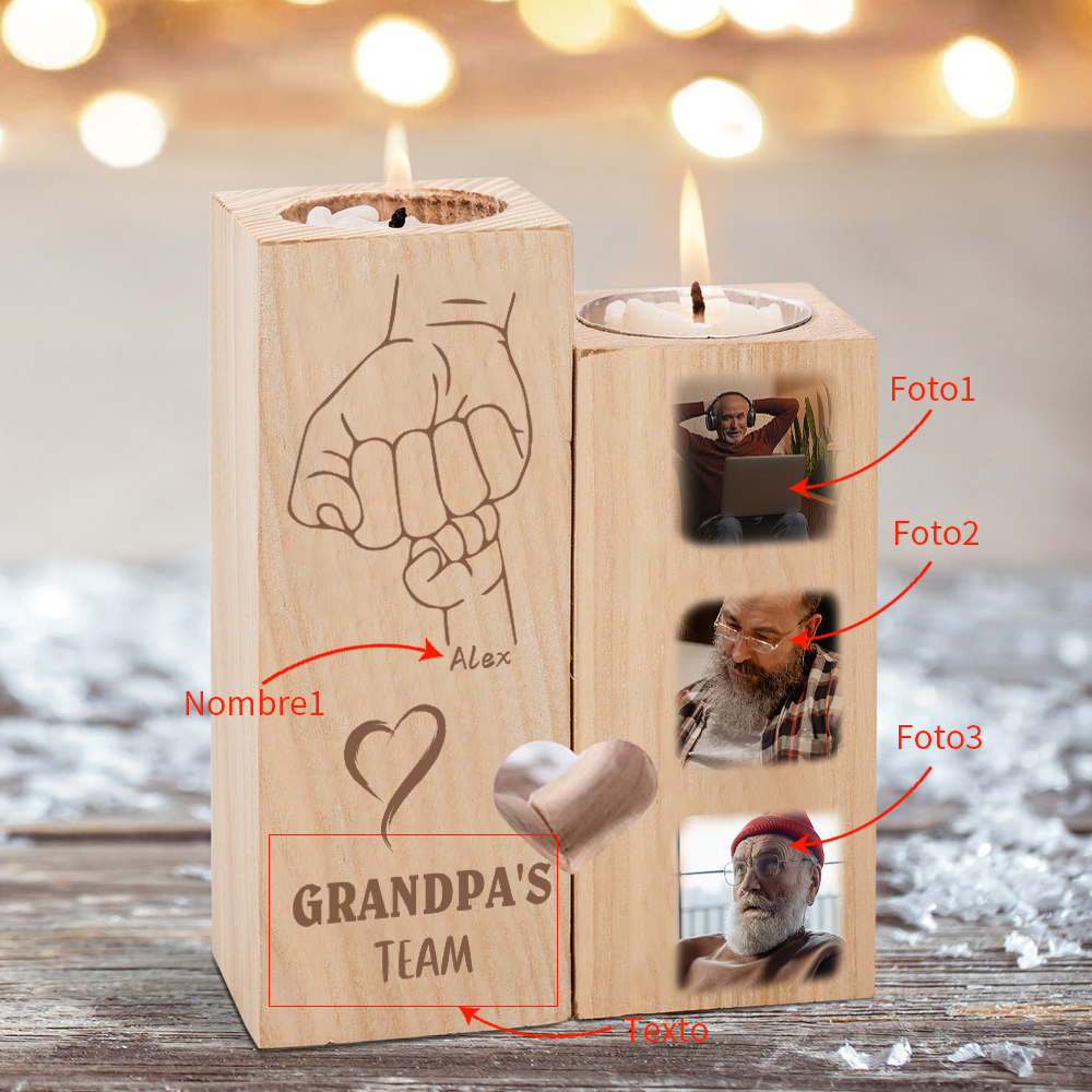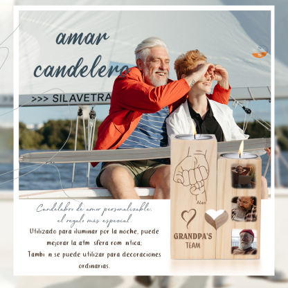 A la familia-Candelero de dos piezas de puño con puño de madera personalizado con 3 fotos, 1 texto y 1 nombre sin vela