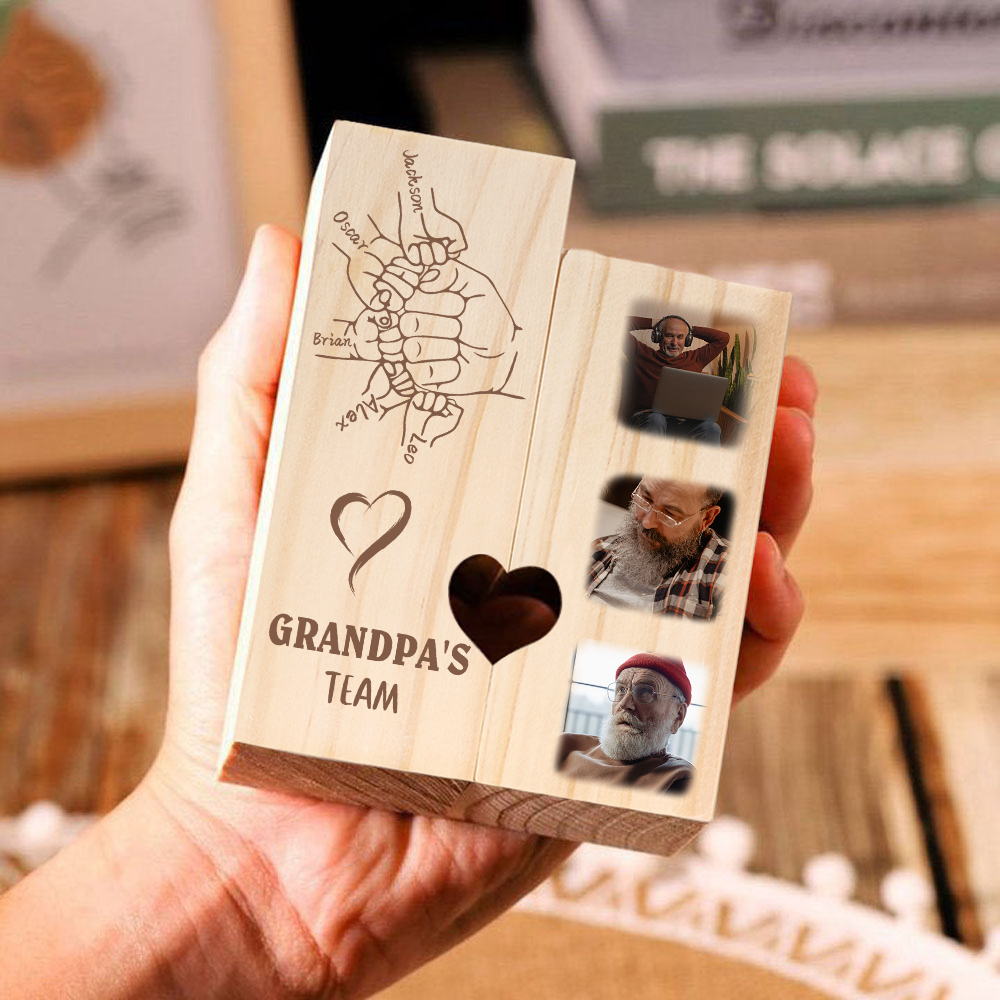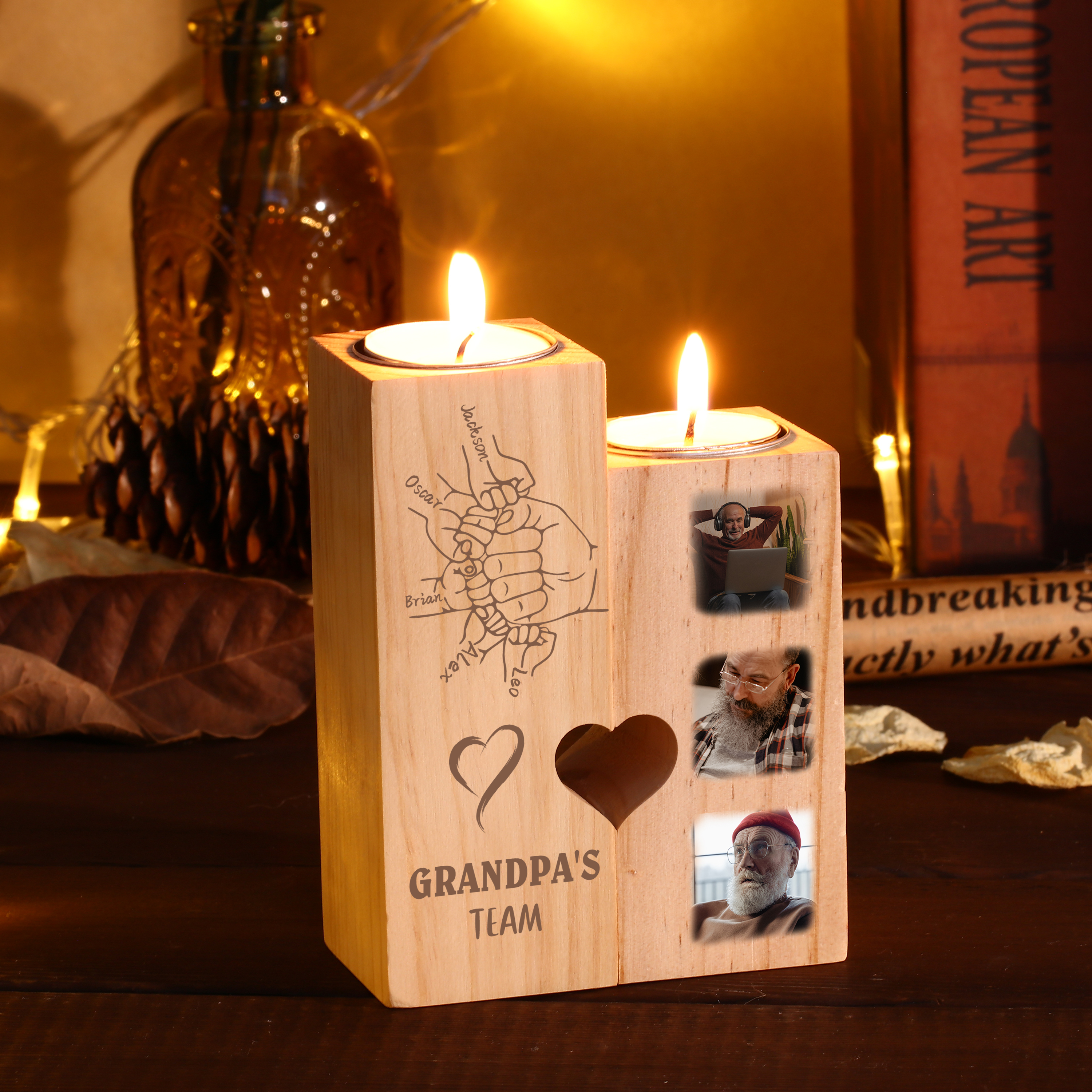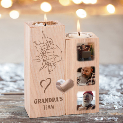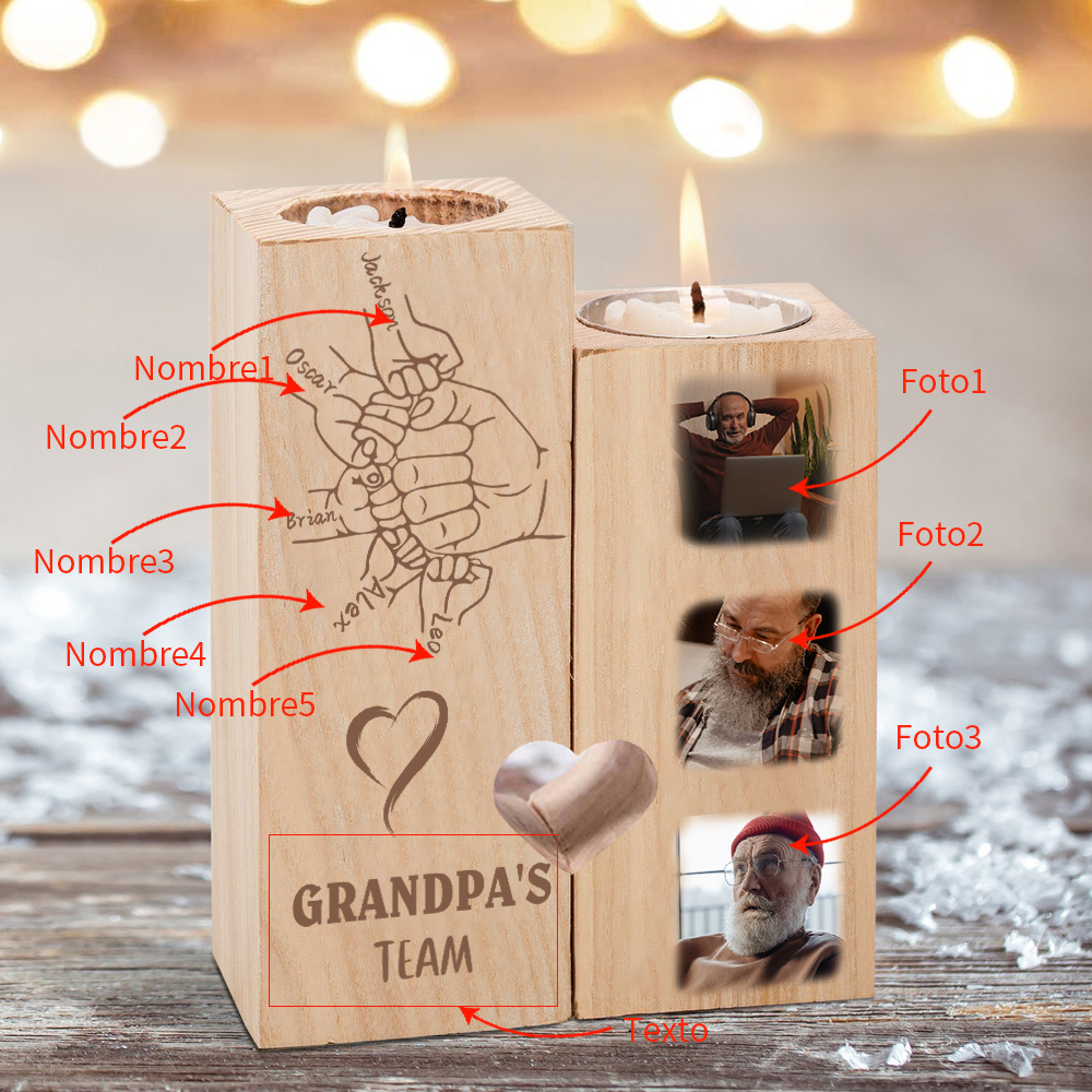 A la familia-Candelero de dos piezas de puño con puño de madera personalizado con 3 fotos, 1 texto y 5 nombres sin vela