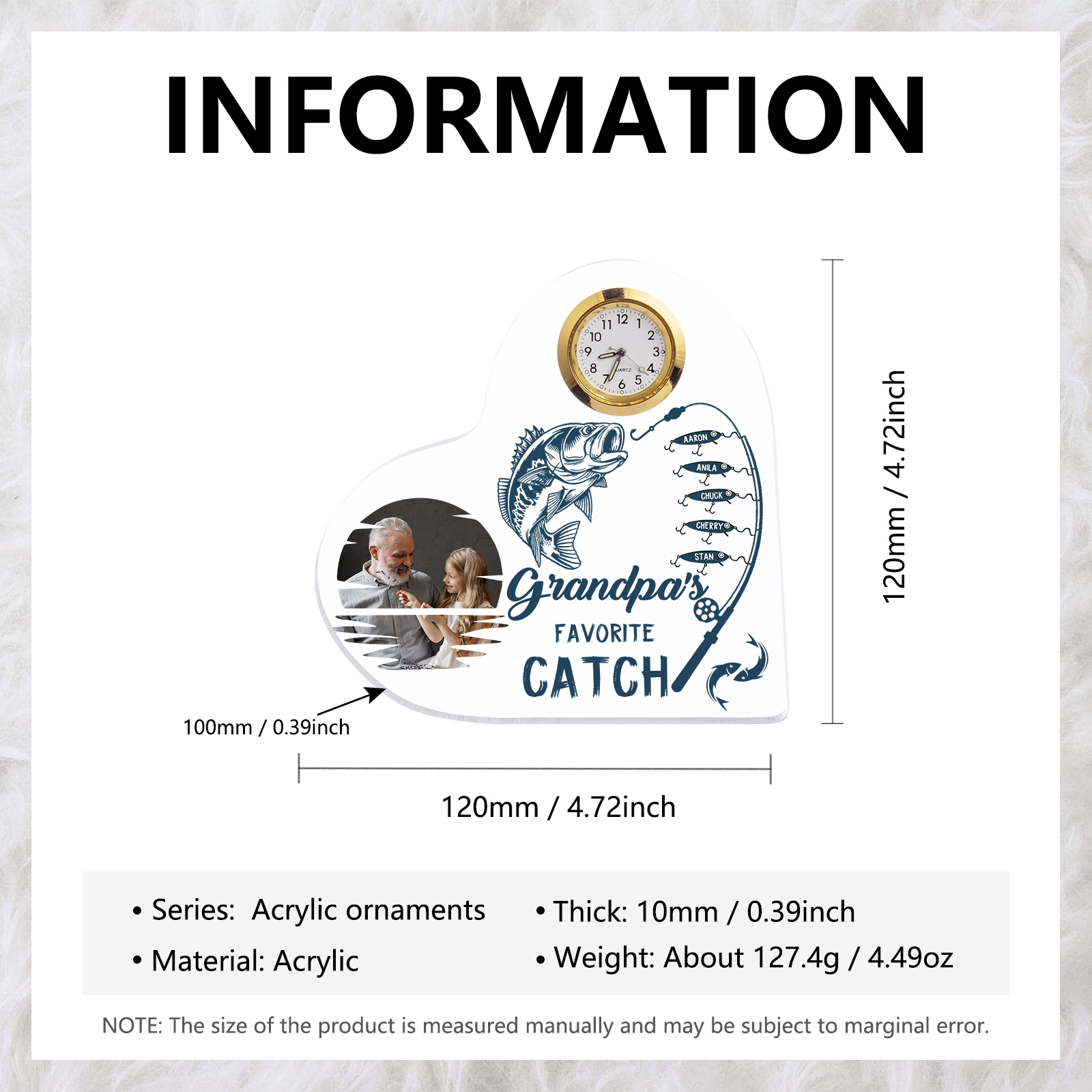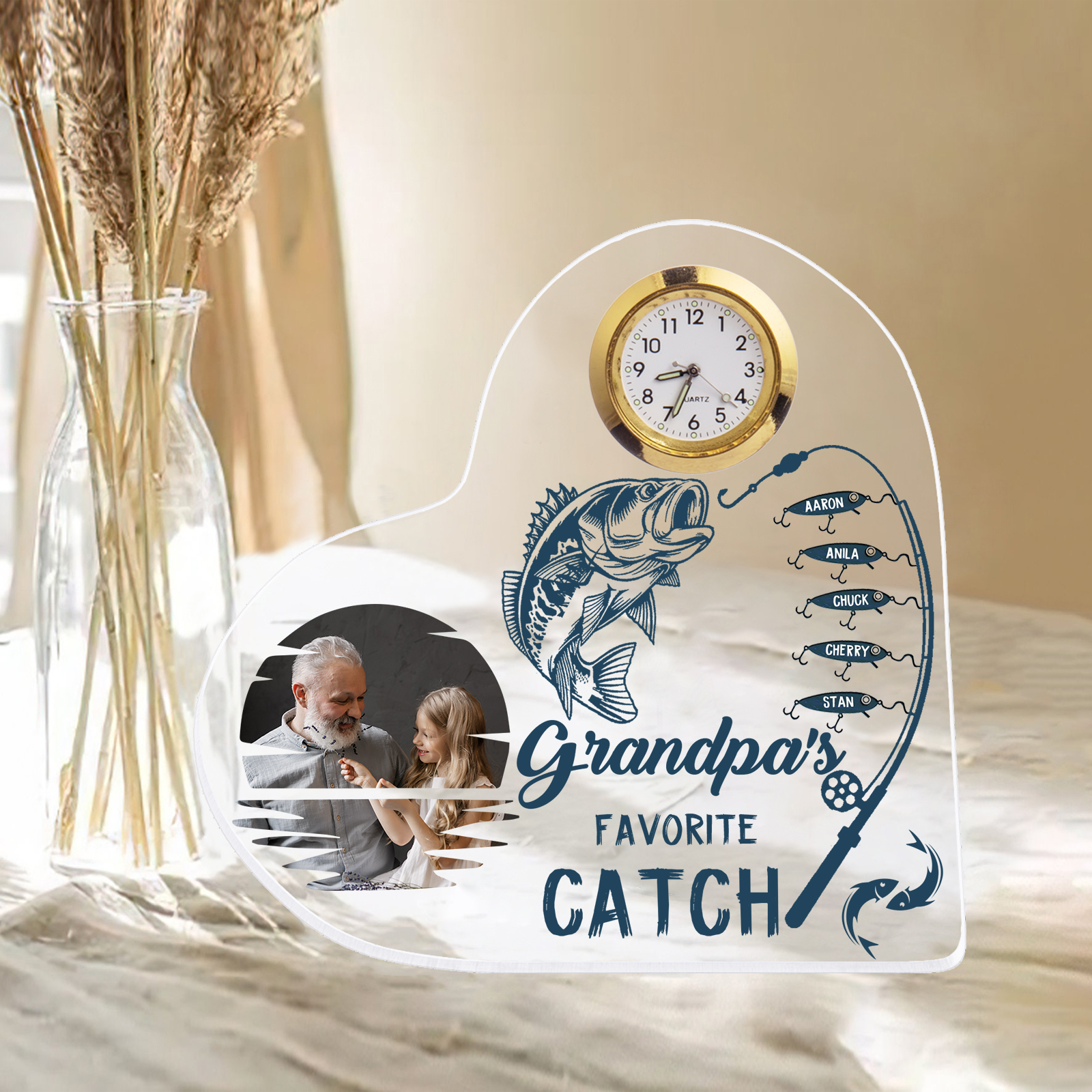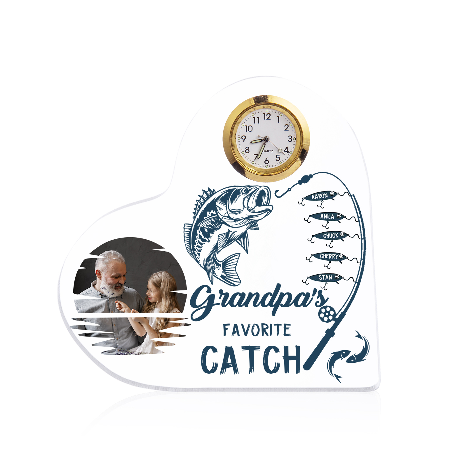 A la familia-Placa acrílica en forma de corazón con un reloj 1 texto, 1 foto y 5 nombres personalizados