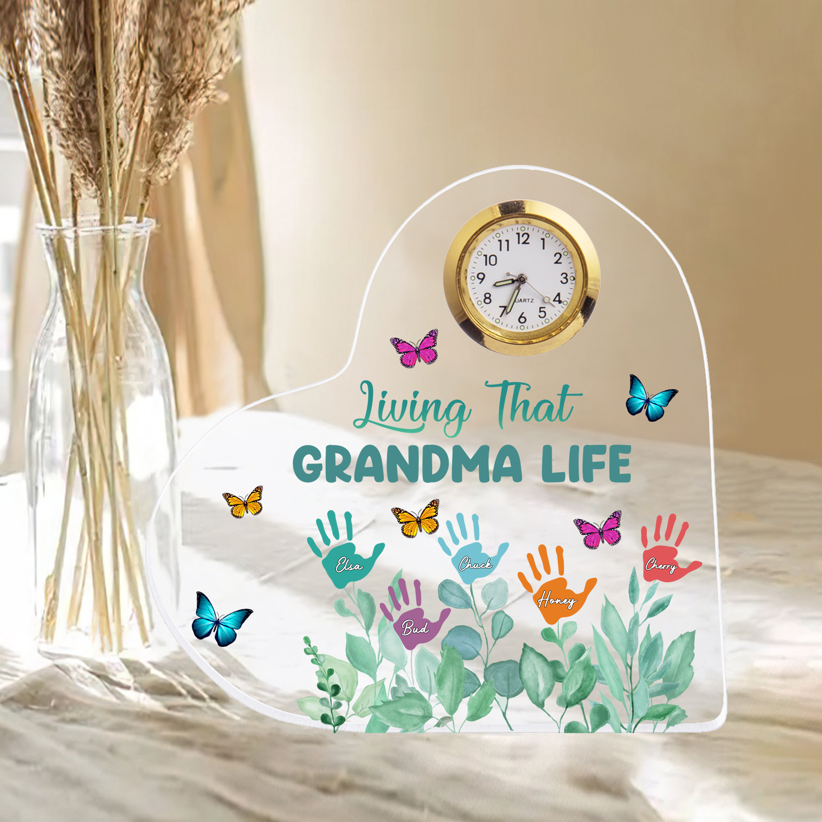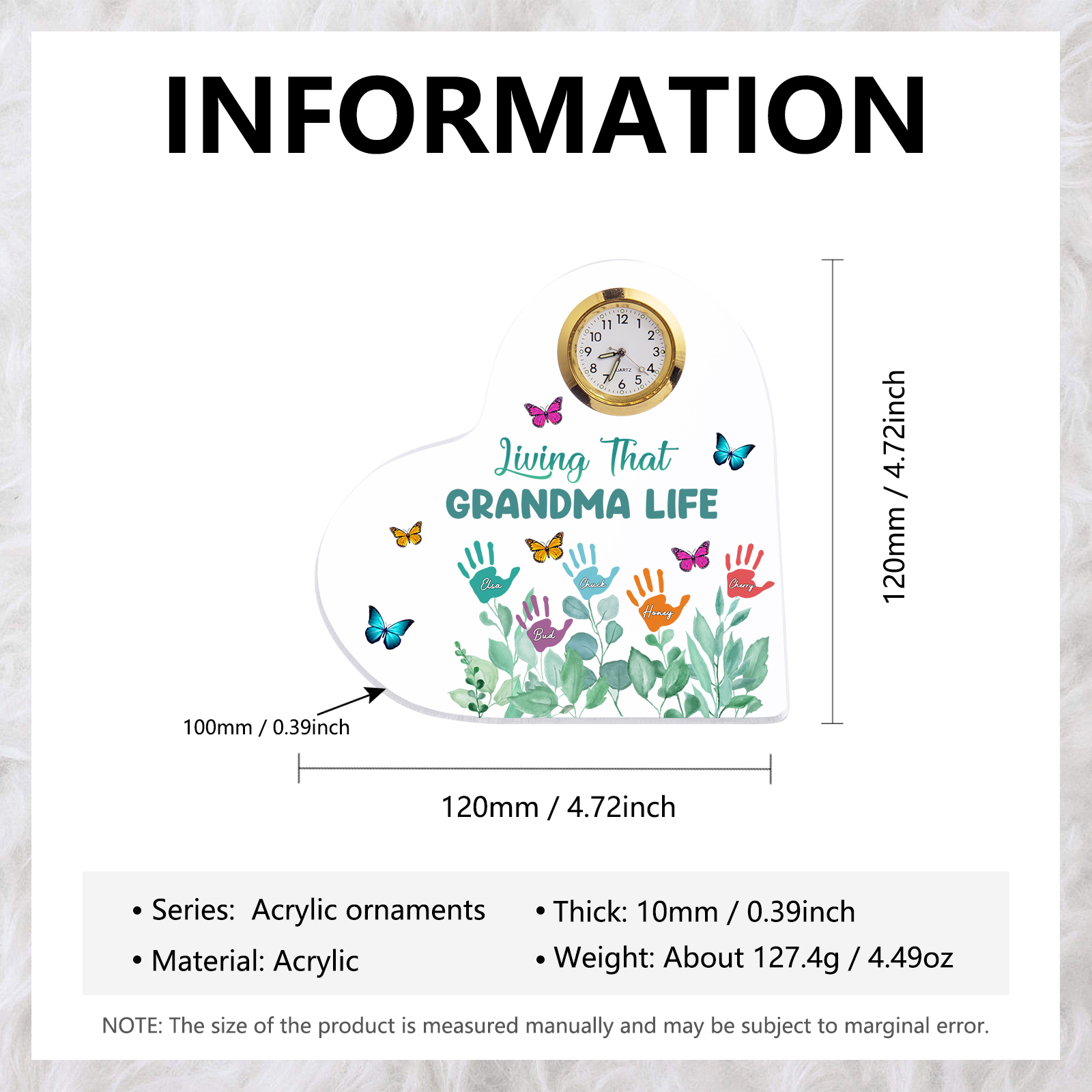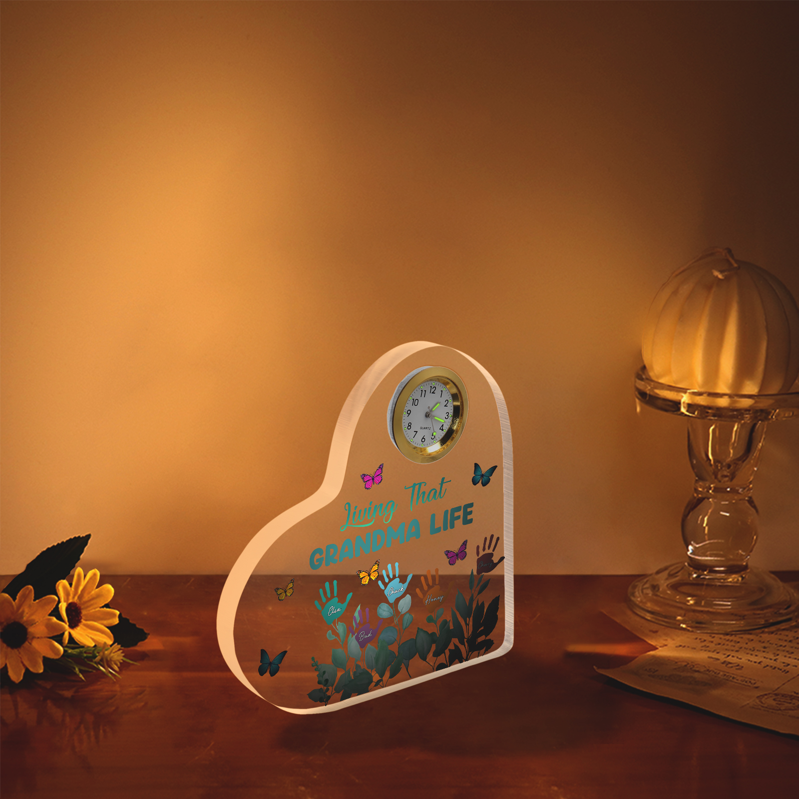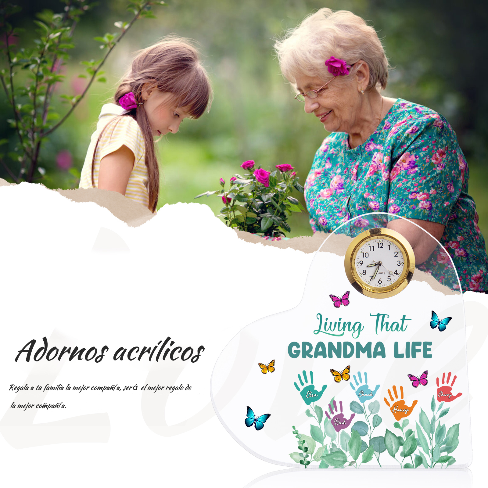 A la familia-Placa acrílica en forma de corazón manos con un reloj 1 texto 5 nombres personalizados