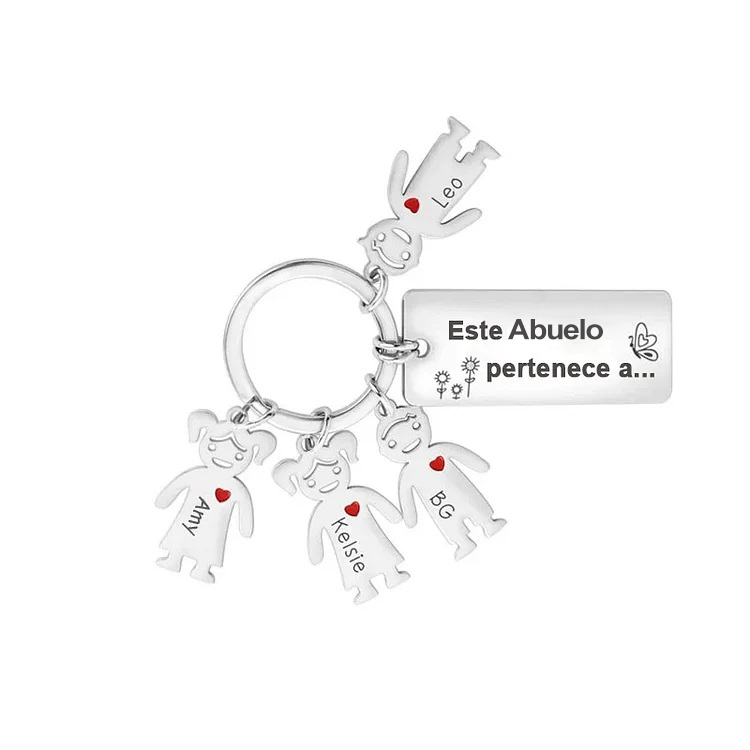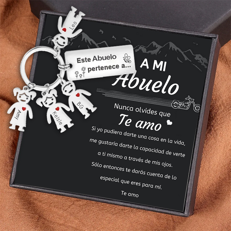 A mi abuelo - Llavero con 4 nombres personalizados de miembros de la familia grabados en muñecos del género correspondiente