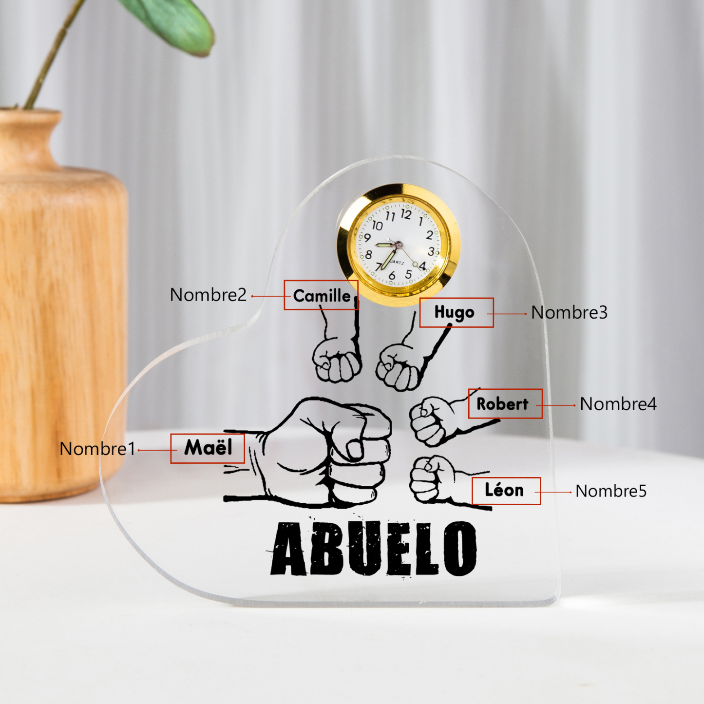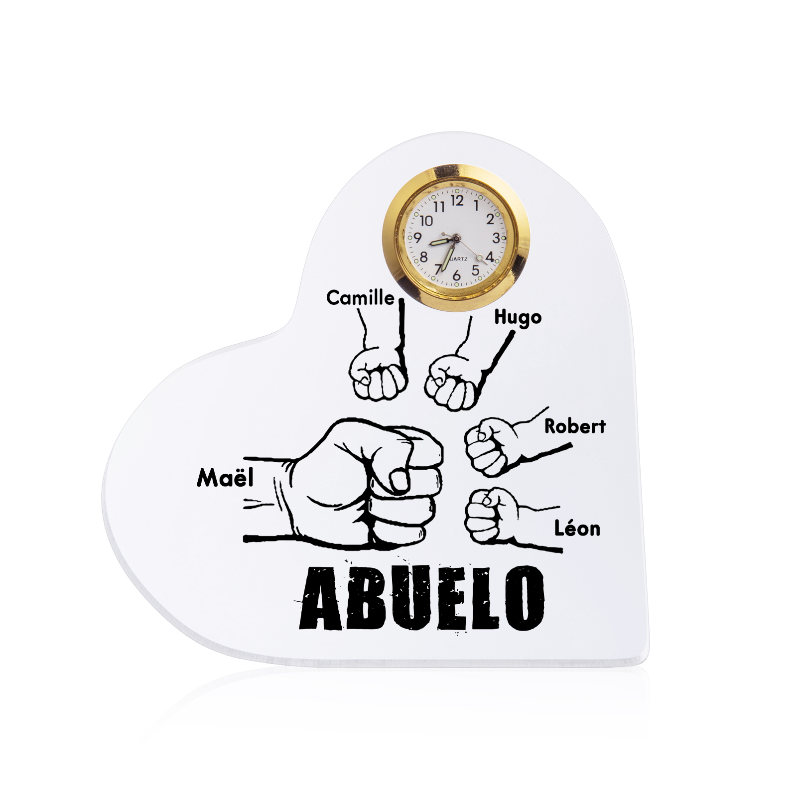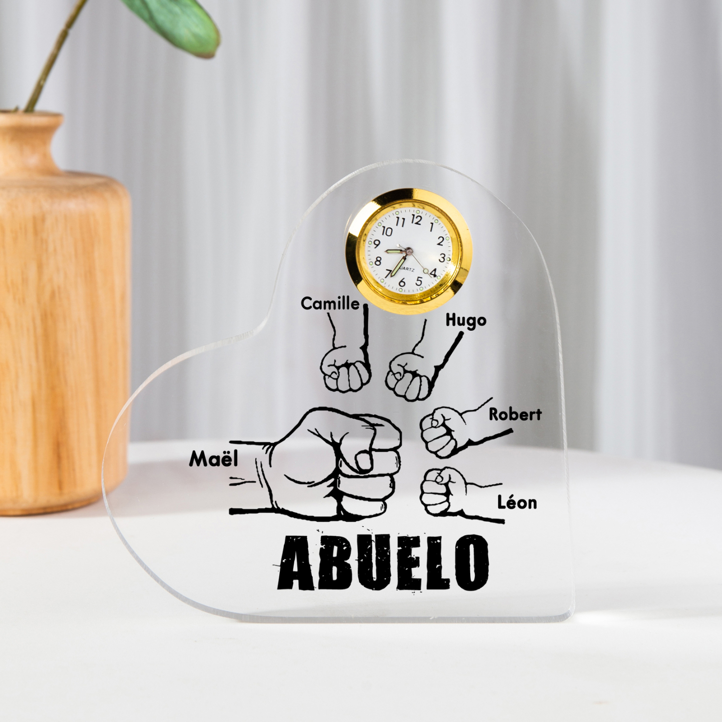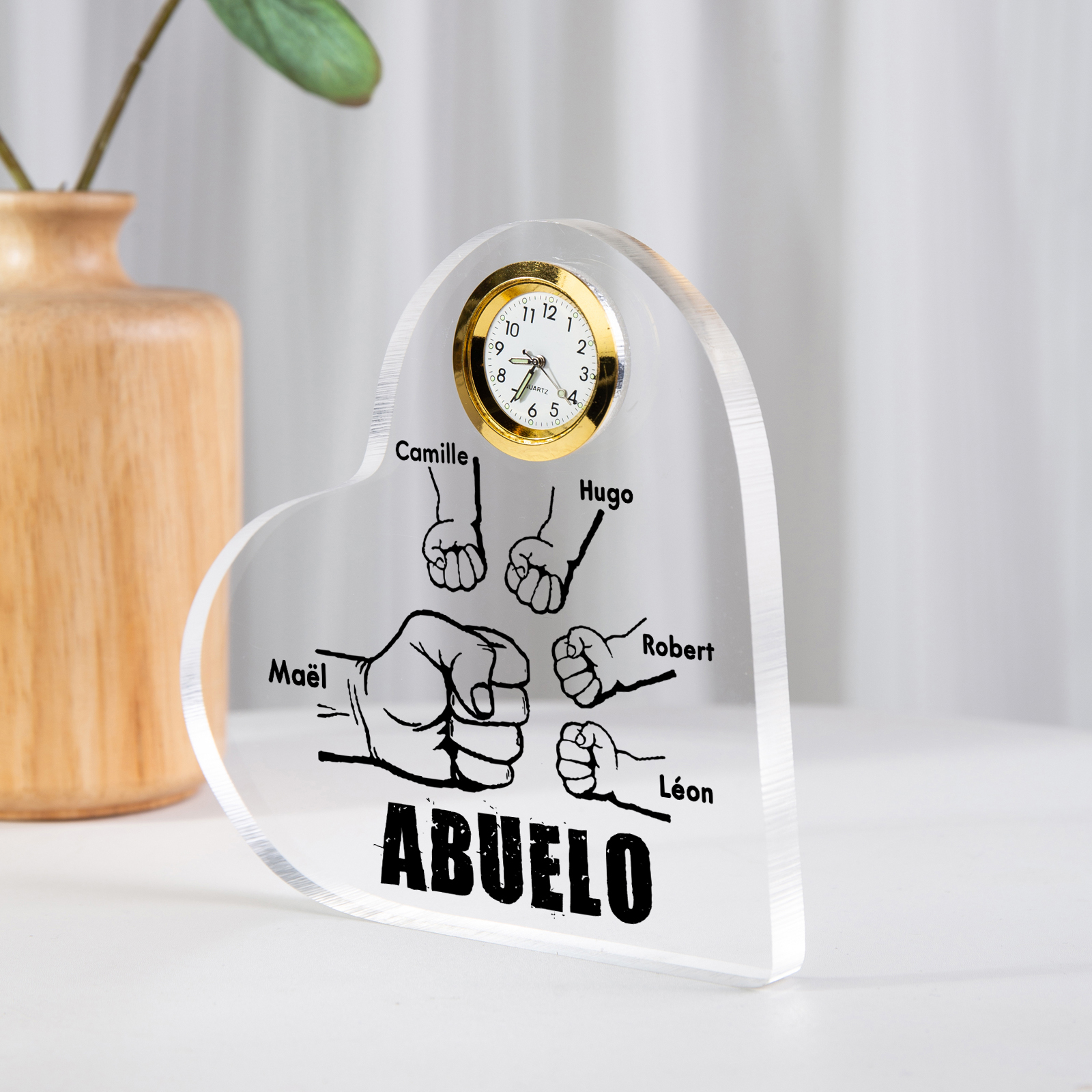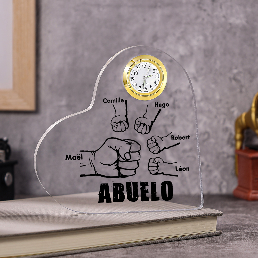 A mi abuelo-Placa acrílica en forma acorazonada con un reloj 5 nombres personalizados