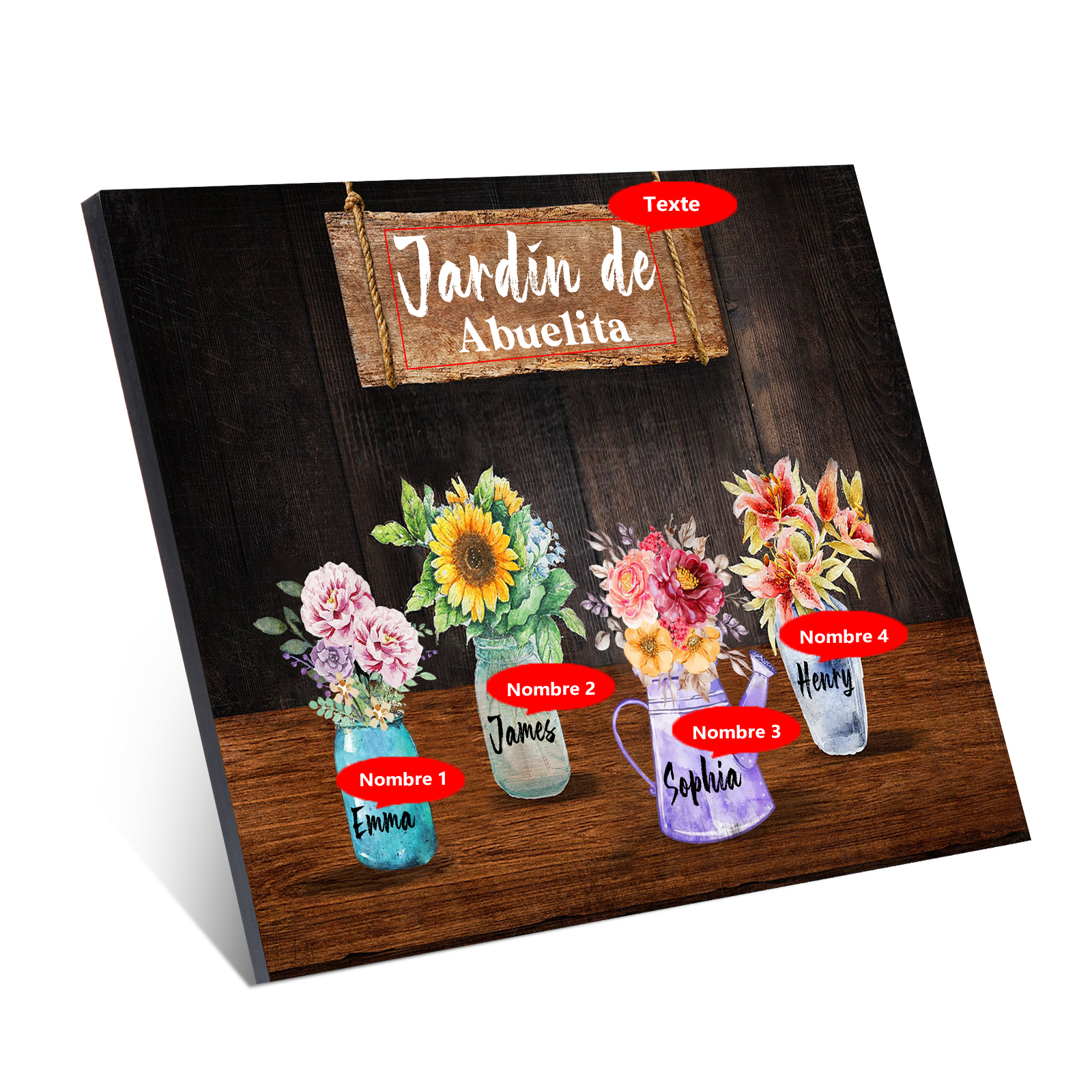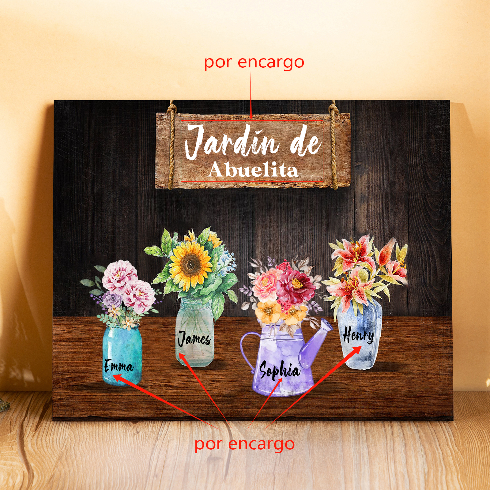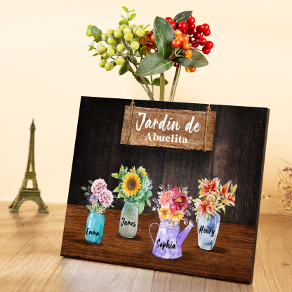 A mi familia- Lámina marco de madera con flores 4 nombres personalizados con 1 texto