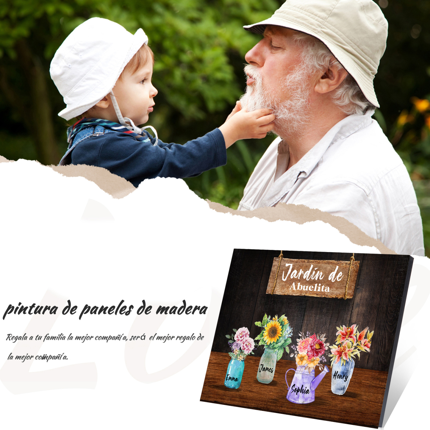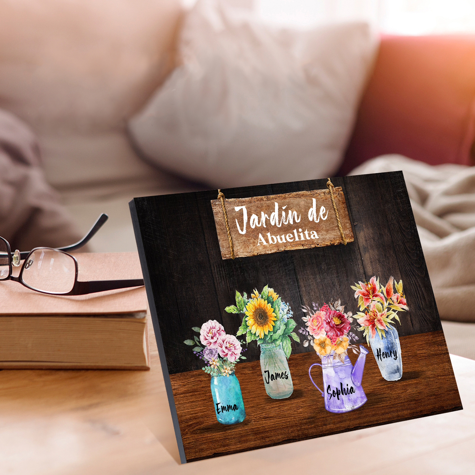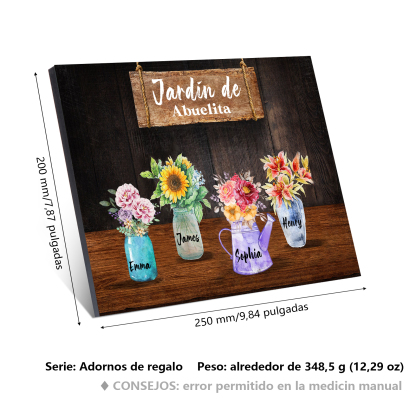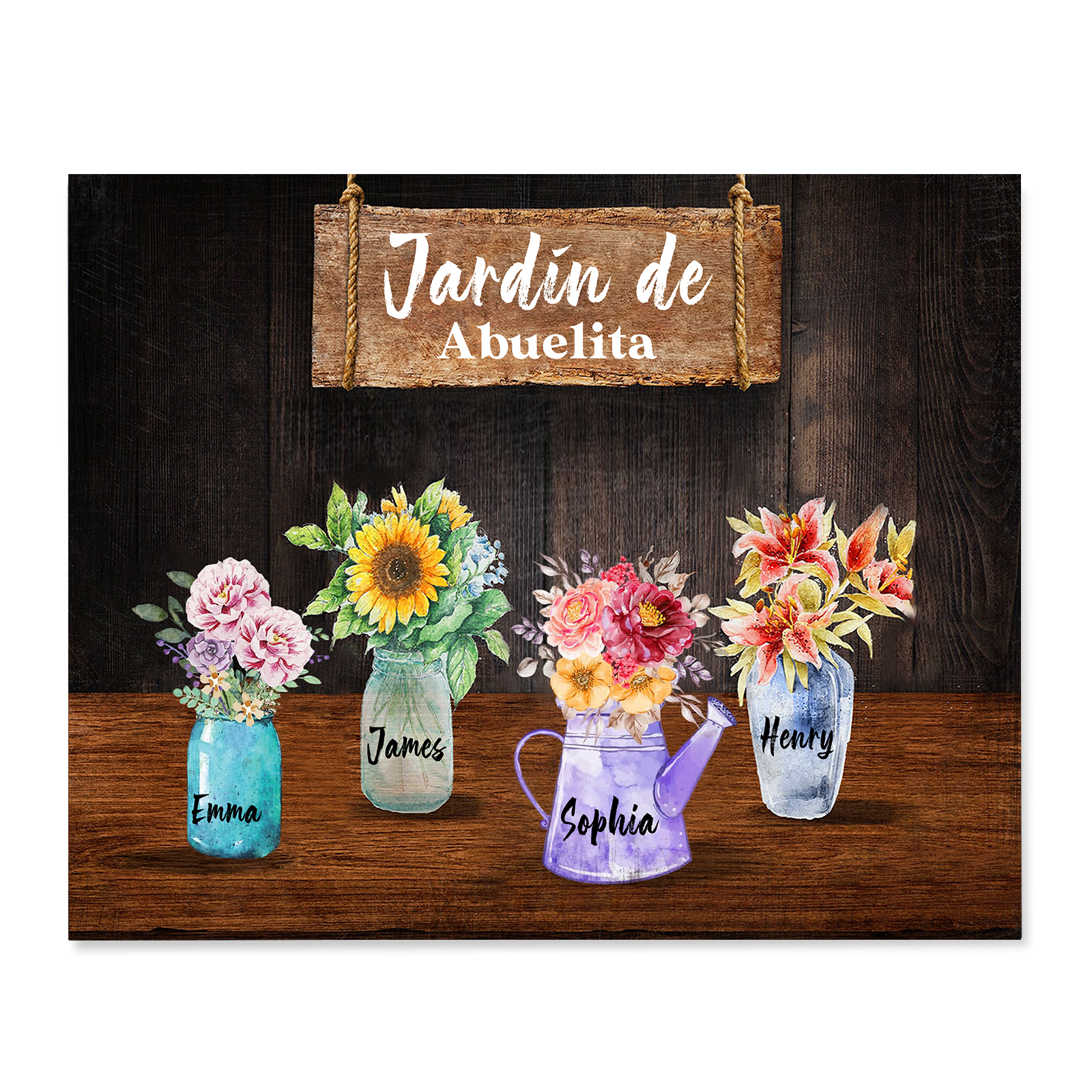 A mi familia- Lámina marco de madera con flores 4 nombres personalizados con 1 texto