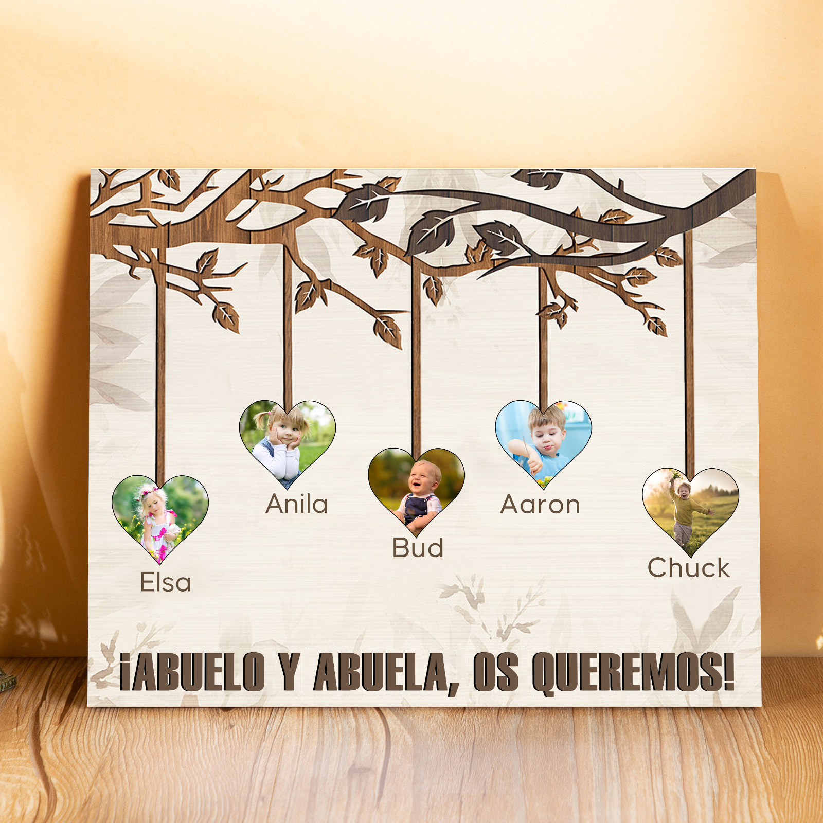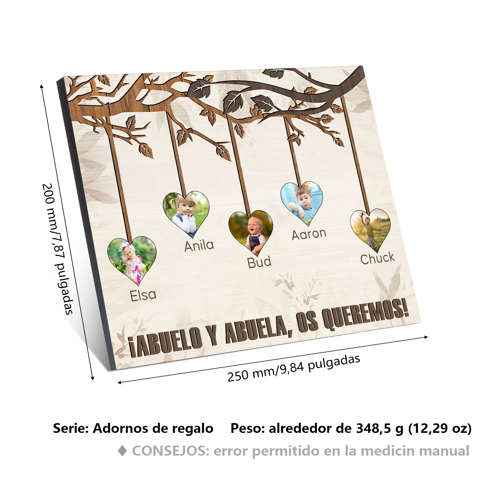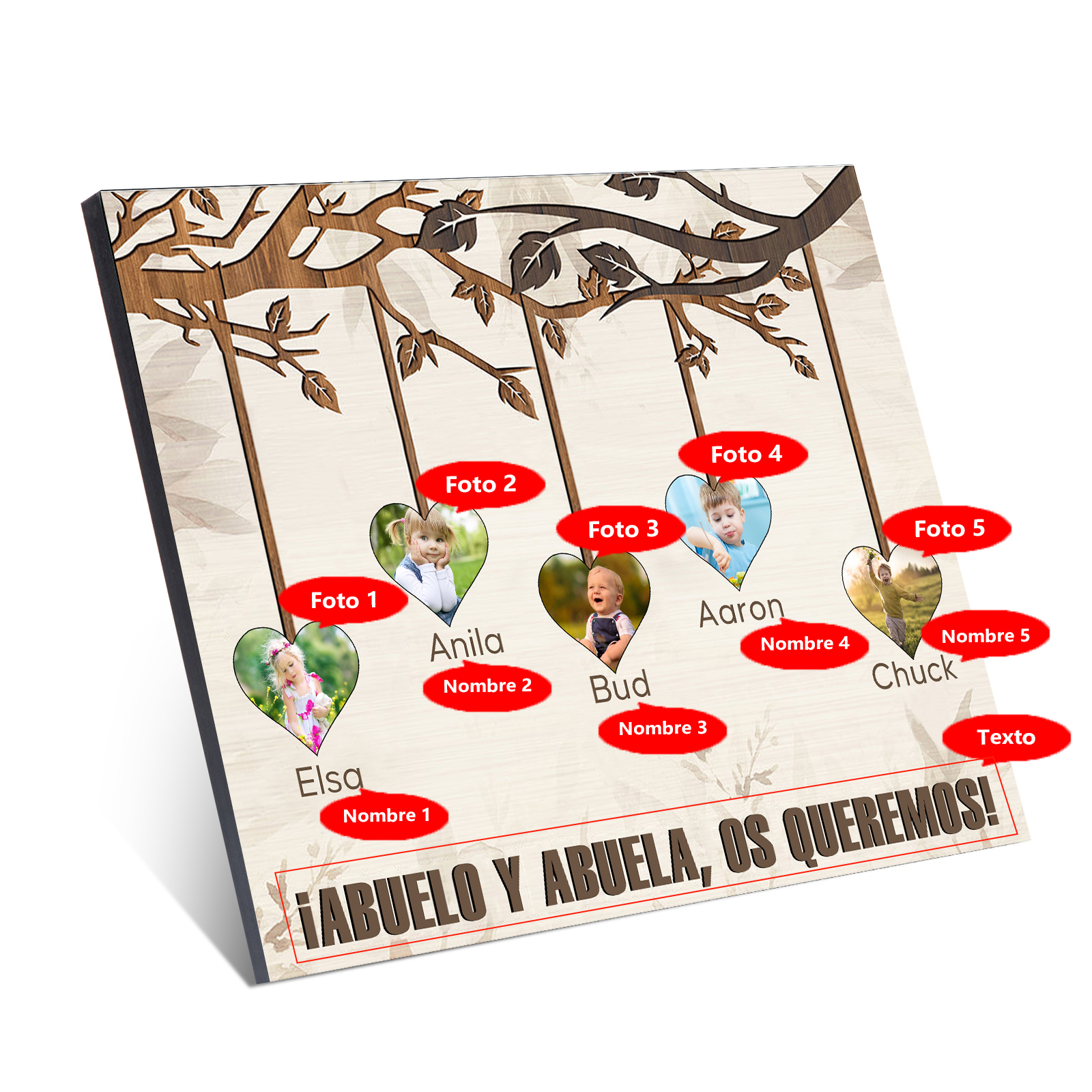 A mi familia- Lámina marco de madera frutas de árbol 5 nombres y 5 fotos personalizados con 1 texto