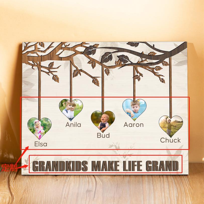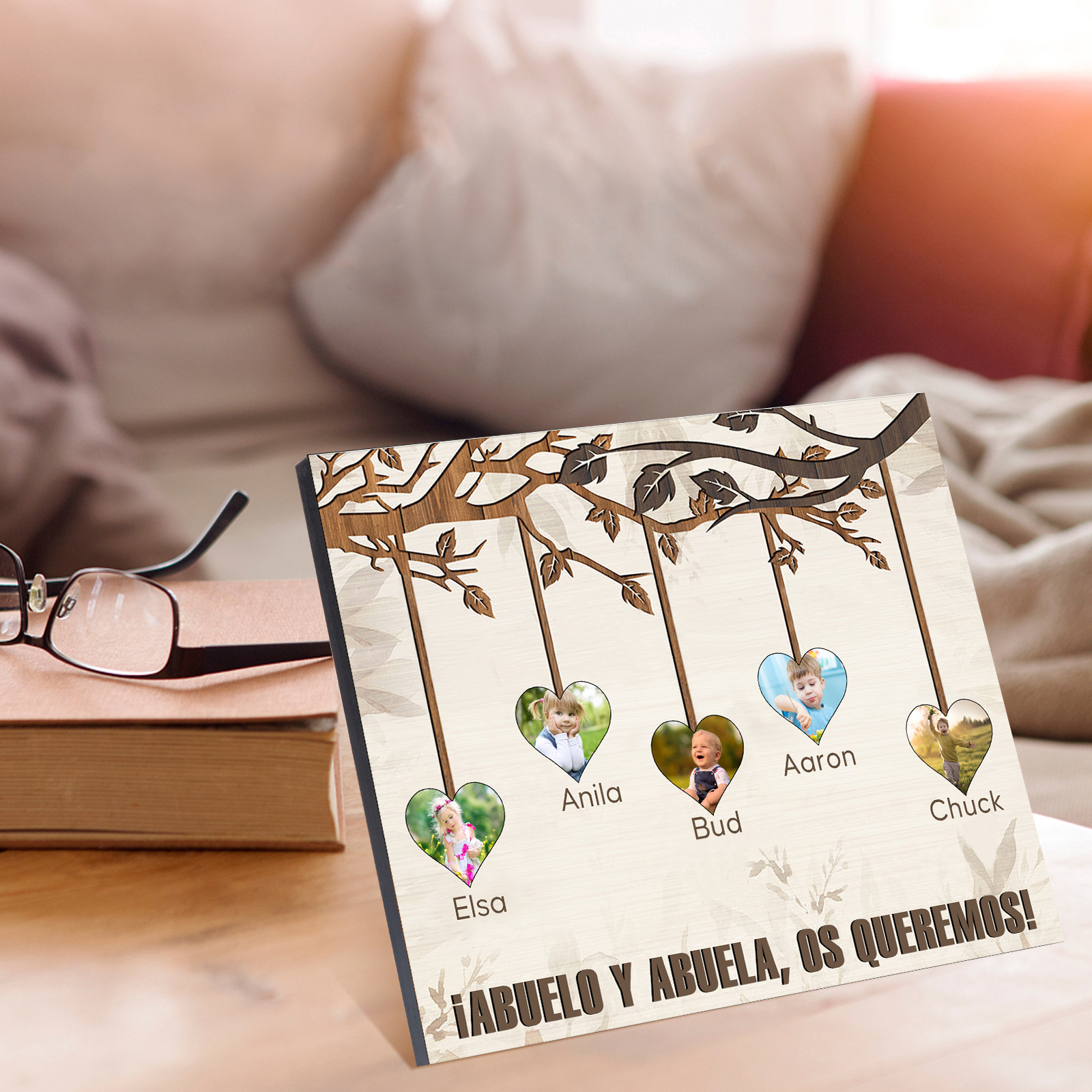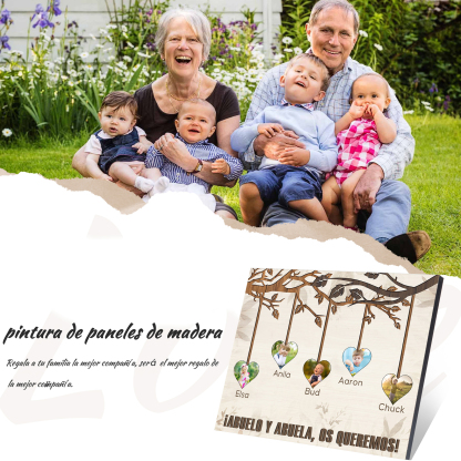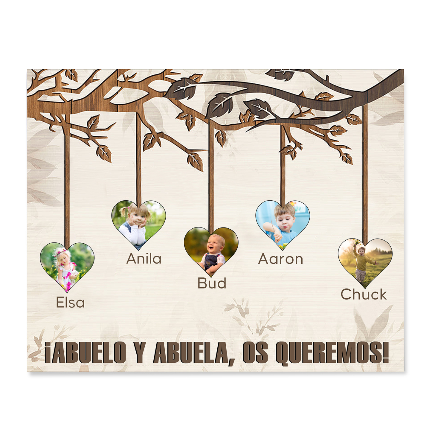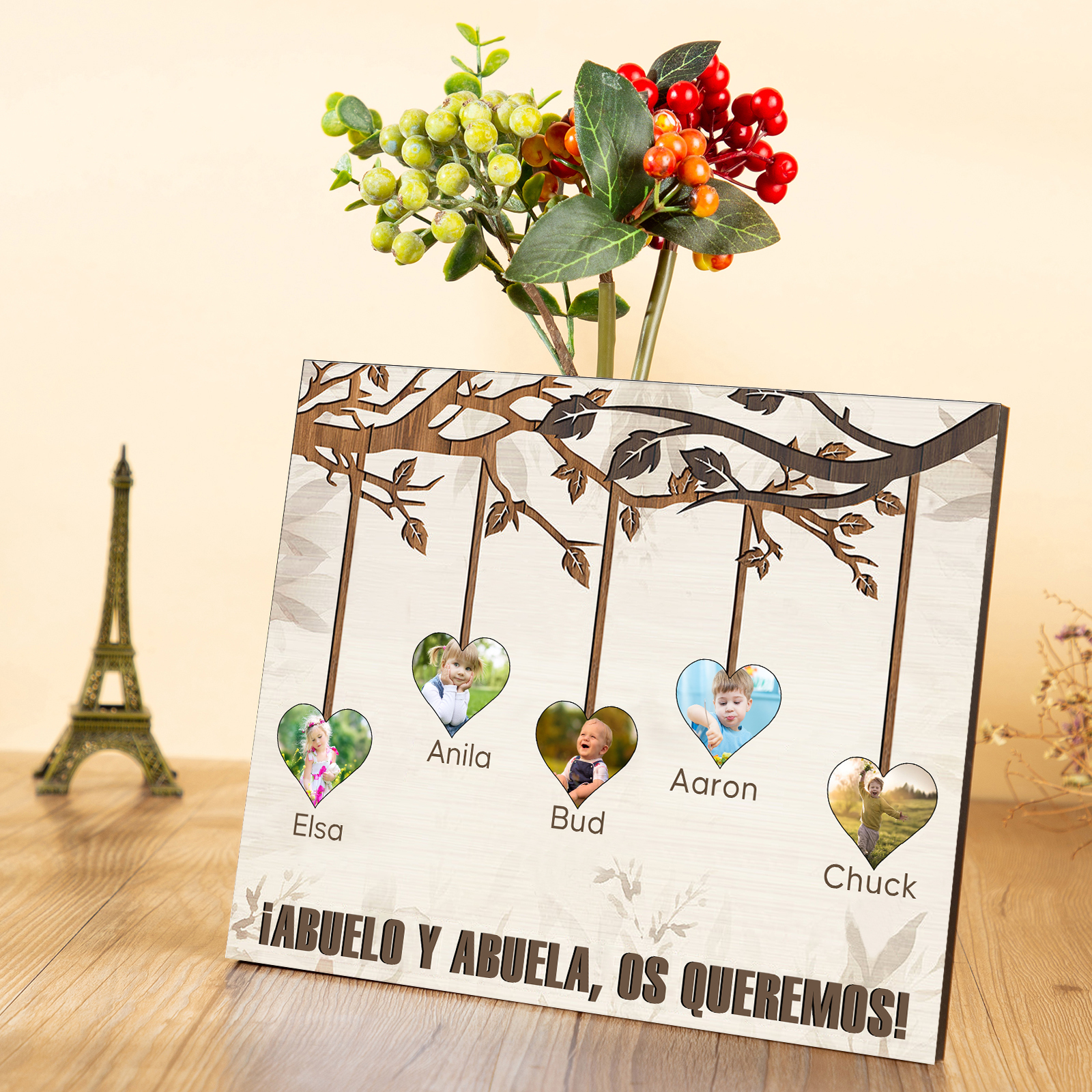 A mi familia- Lámina marco de madera frutas de árbol 5 nombres y 5 fotos personalizados con 1 texto