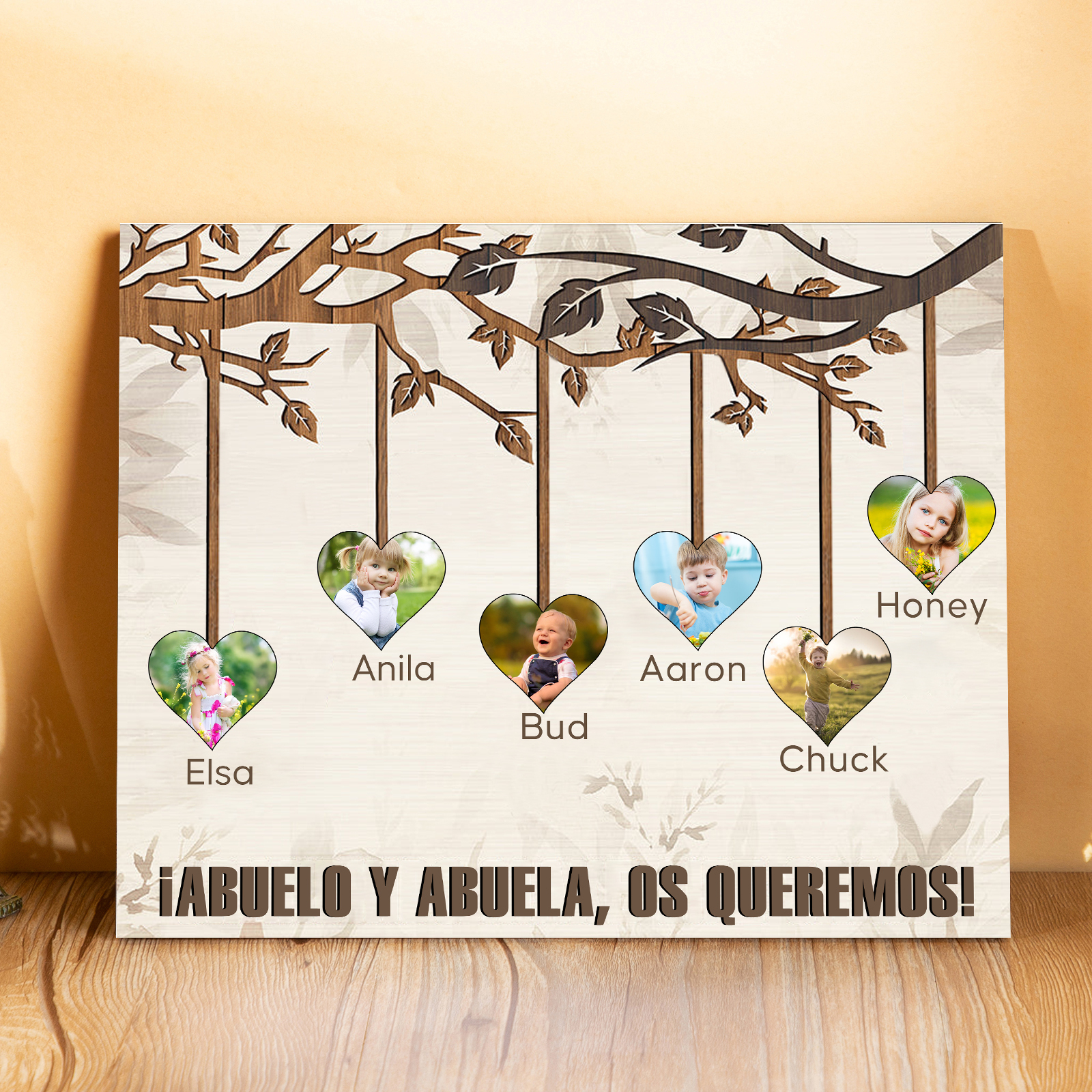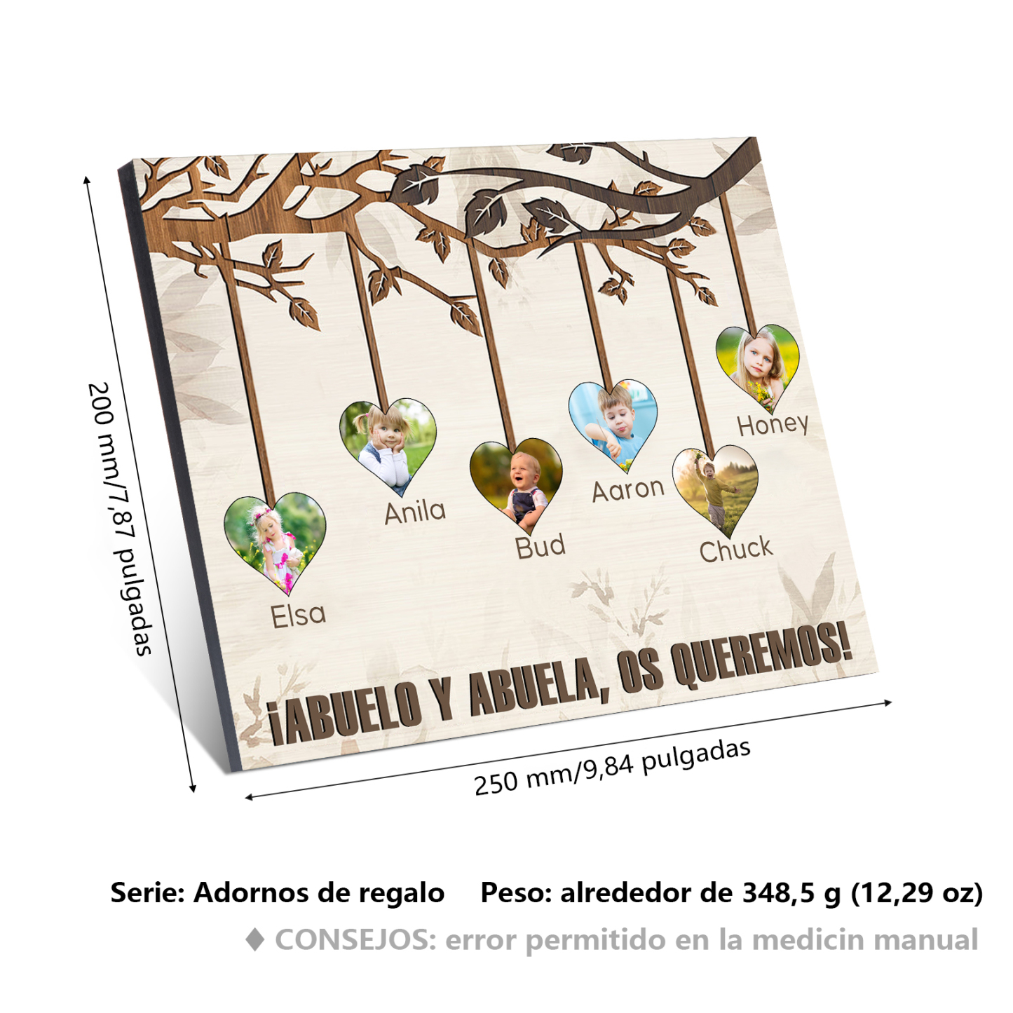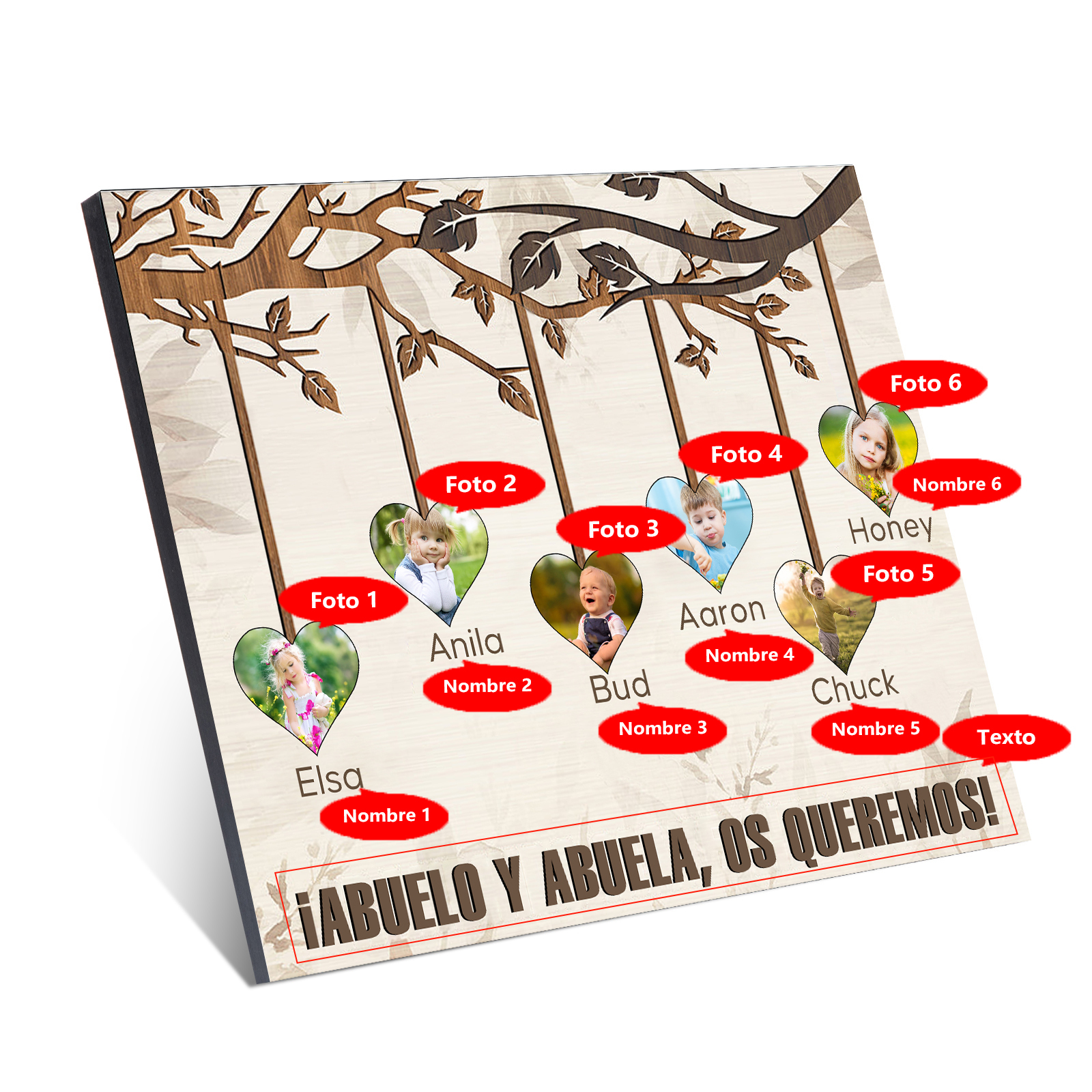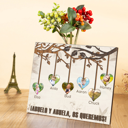 A mi familia- Lámina marco de madera frutas de árbol 6 nombres y 6 fotos personalizados con 1 texto