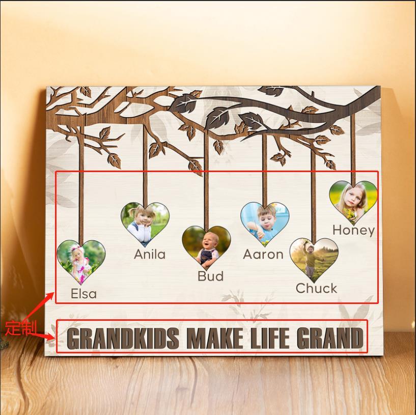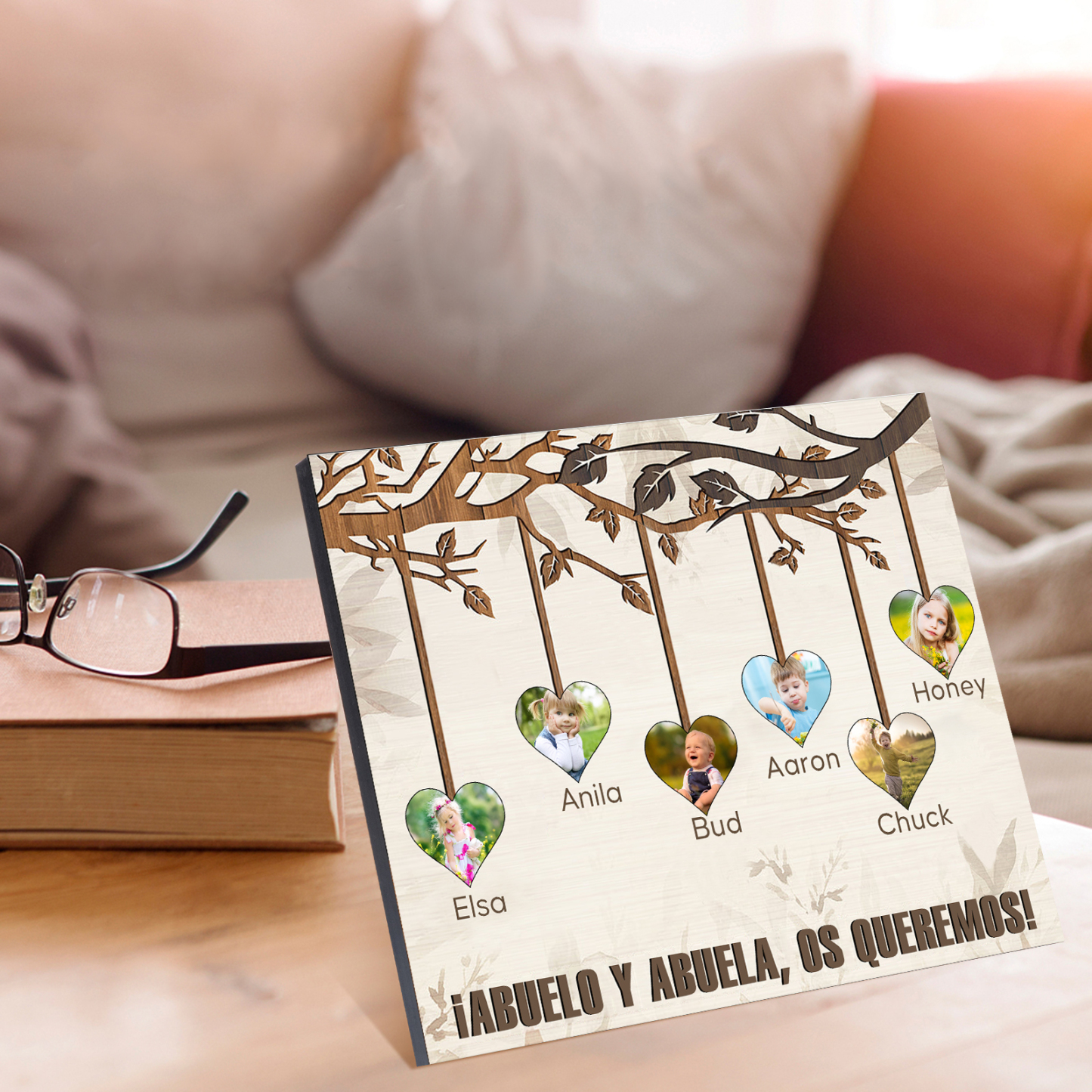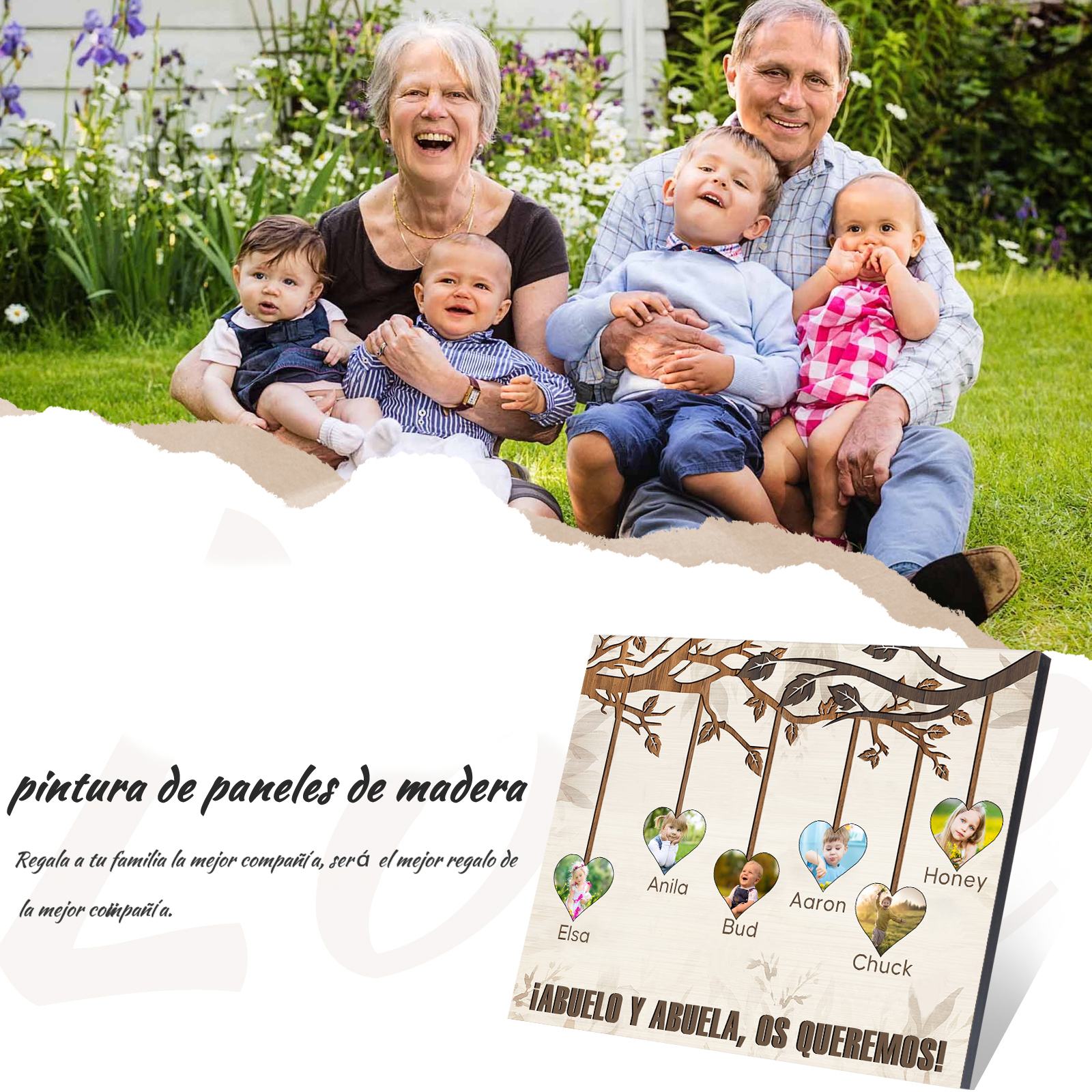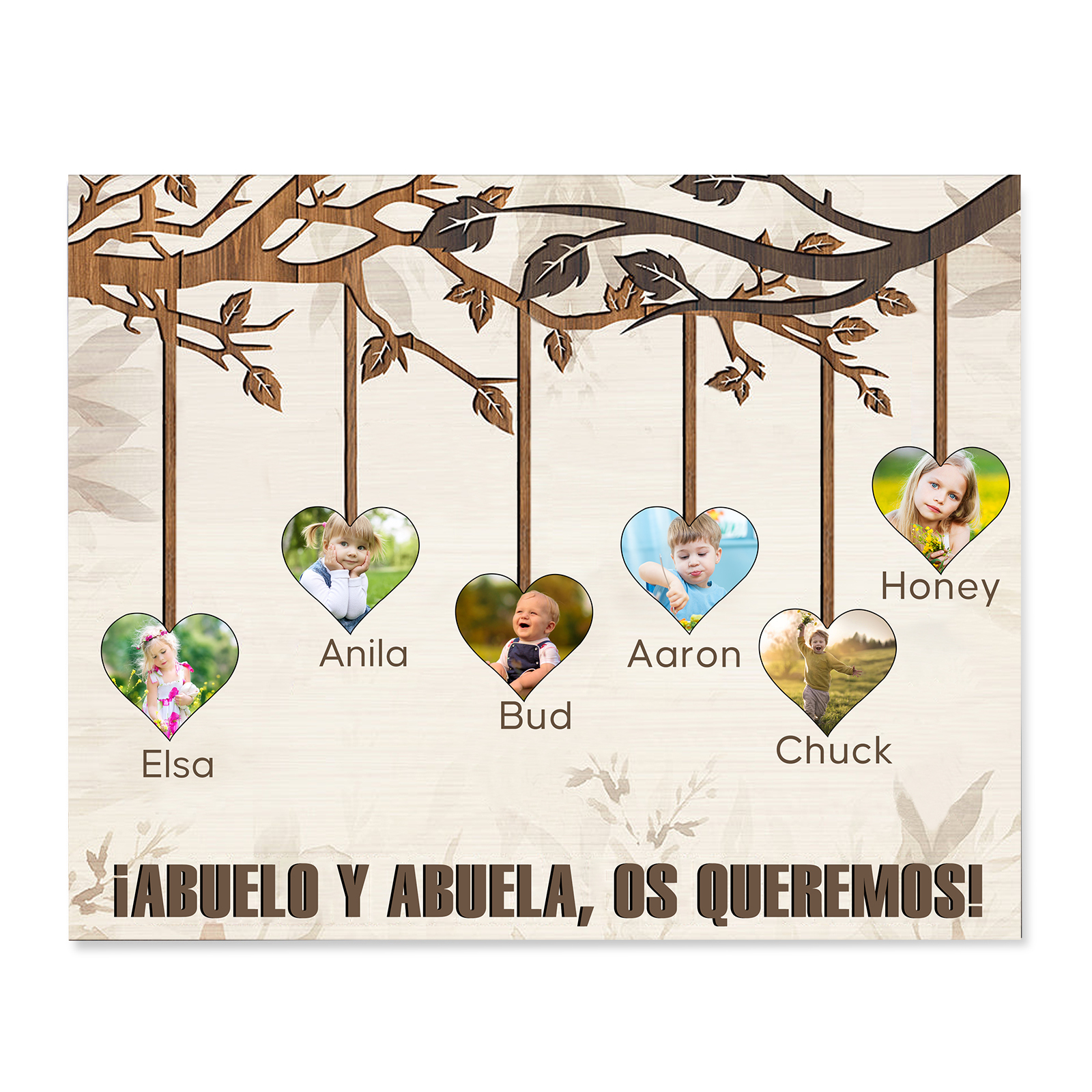 A mi familia- Lámina marco de madera frutas de árbol 6 nombres y 6 fotos personalizados con 1 texto
