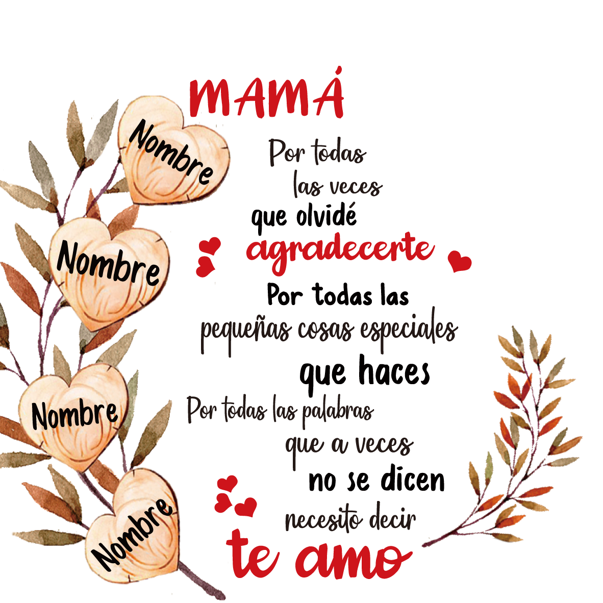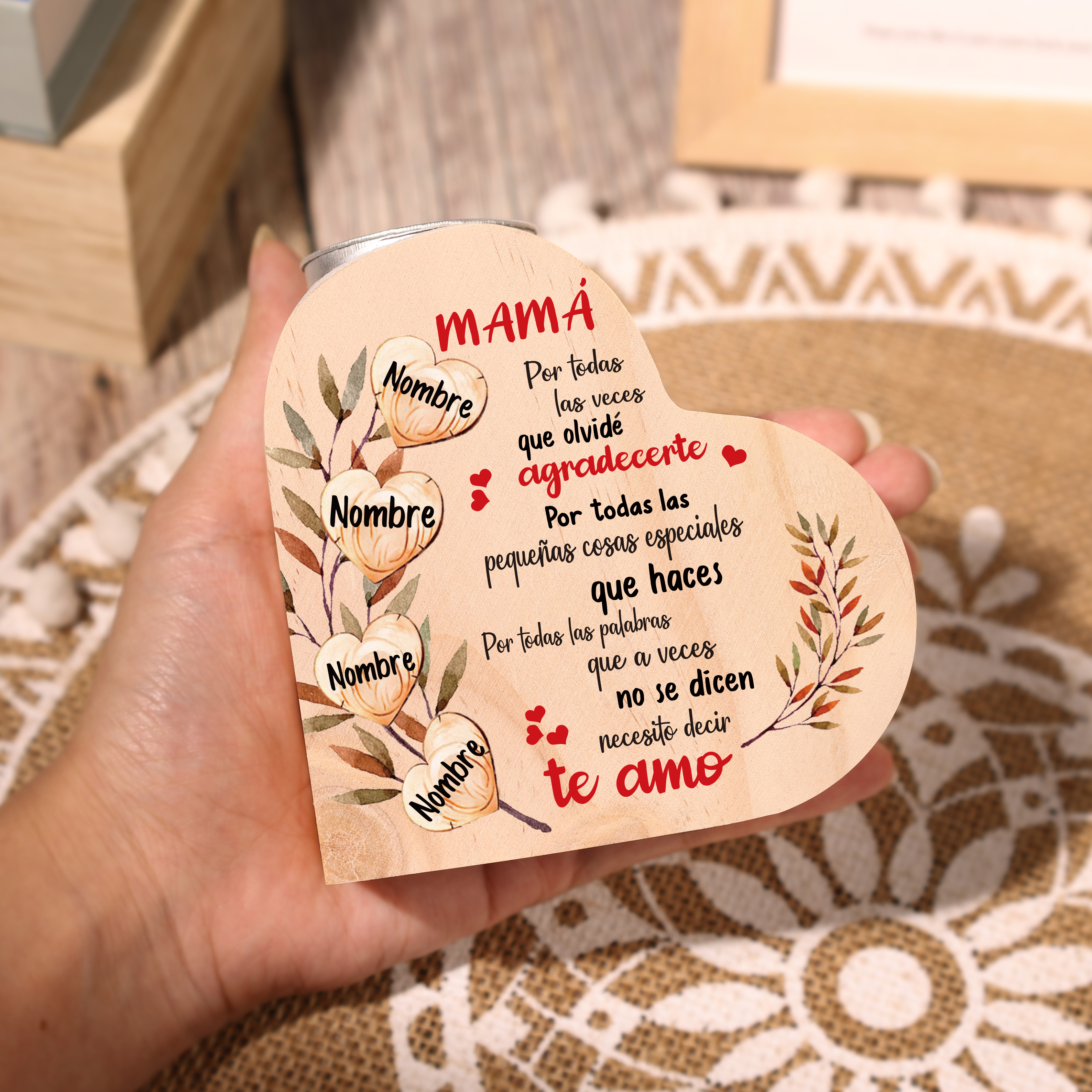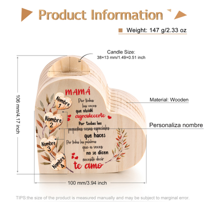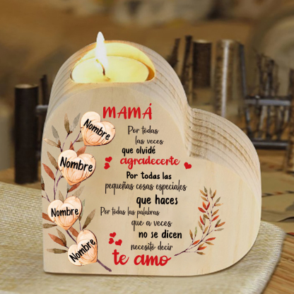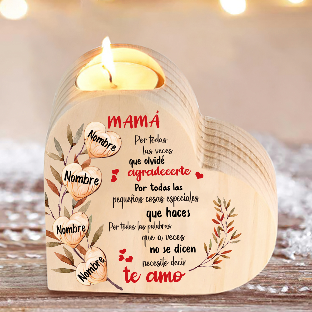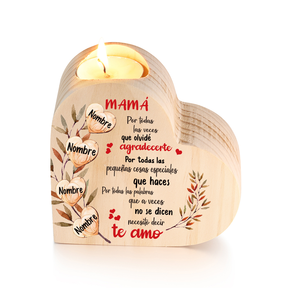 A mi mamá-Candelero de madera corazón con 4 nombres personalizados sin candela