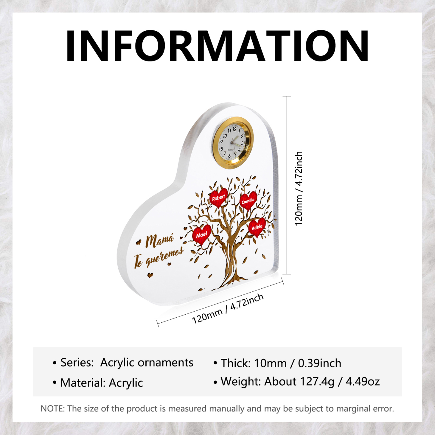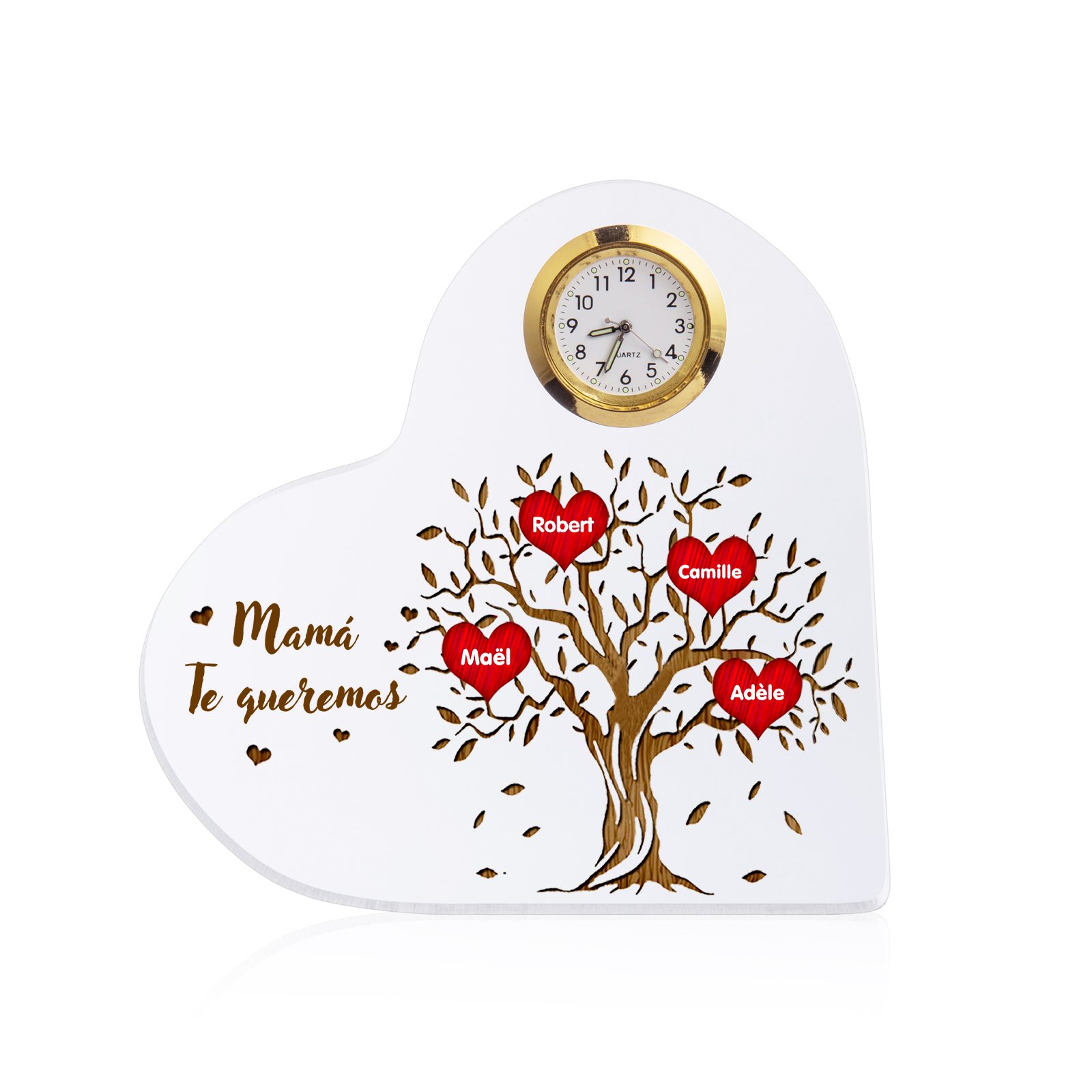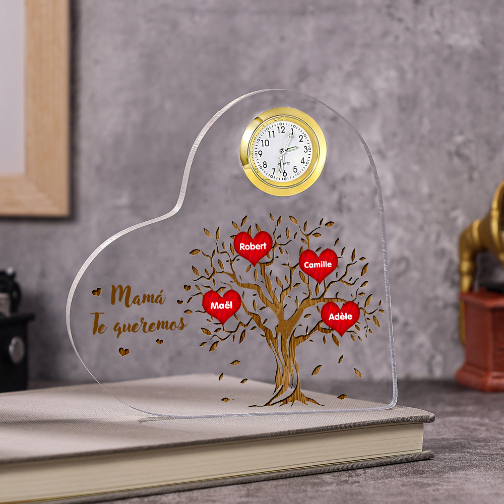 A mi mamá-Placa acrílica en forma acorazonada con un reloj 4 nombres personalizados