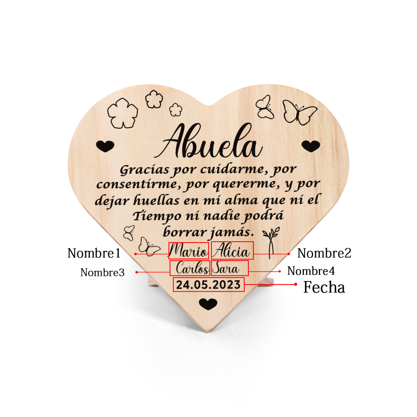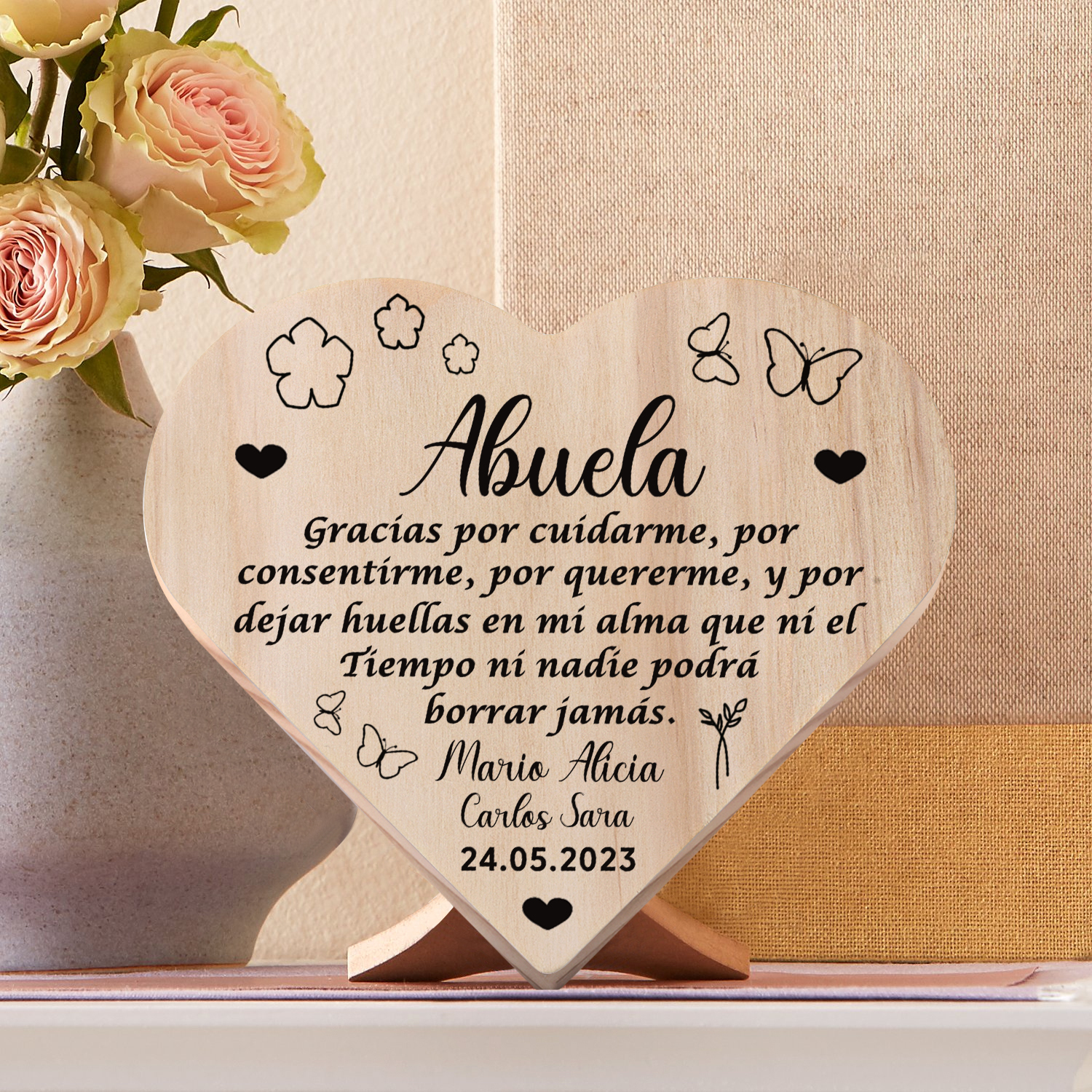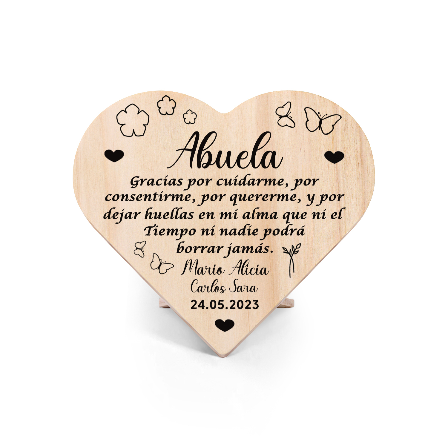 Adorno de madera en forma de corazón para mi abuela personalizado con 4 nombres y fecha