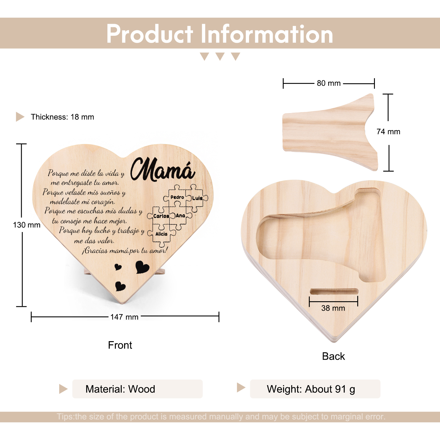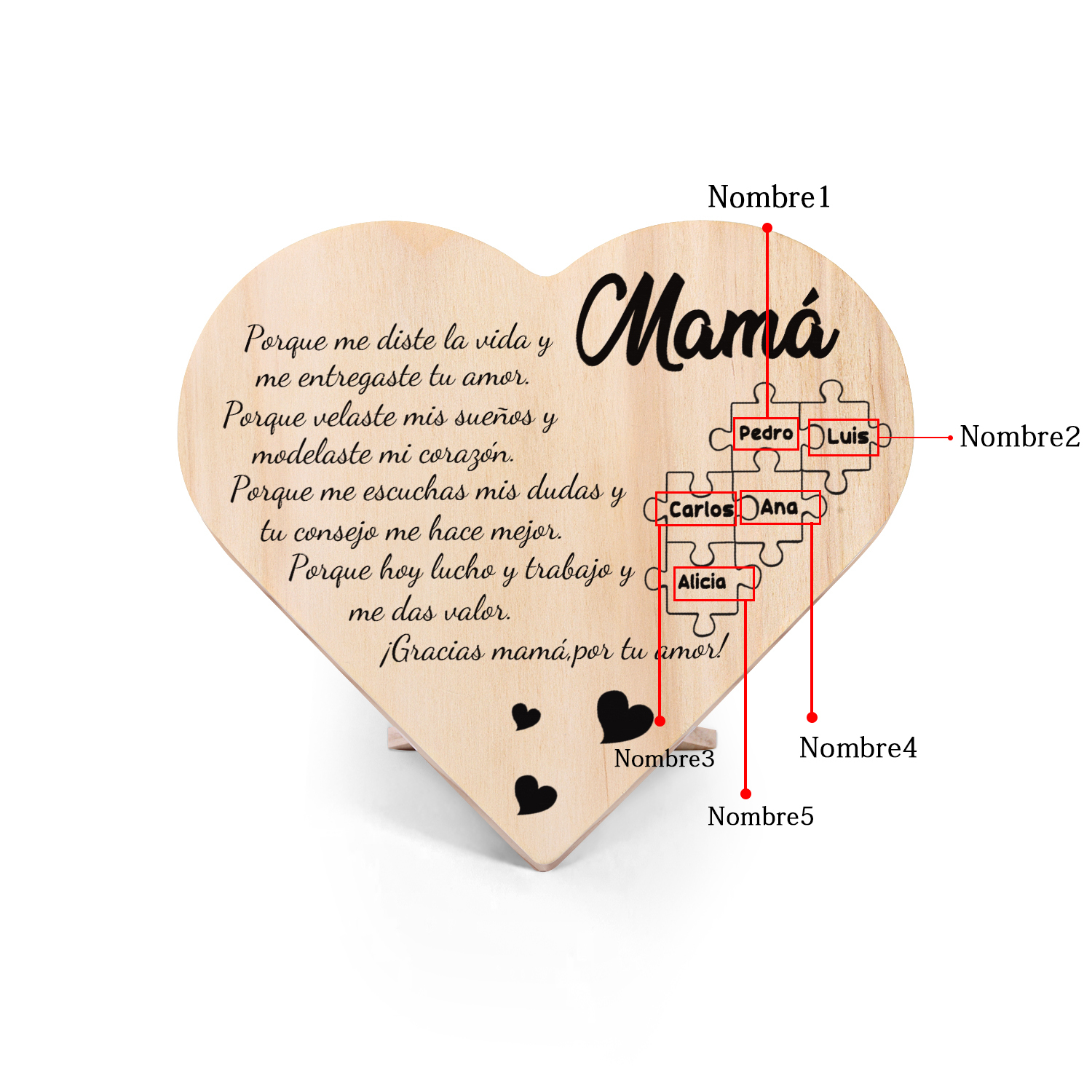 Adorno de madera en forma de corazón para mi mamá personalizado con 5 nombres