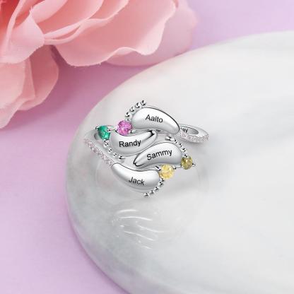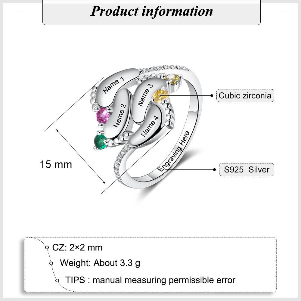 Anillo de pies de bebé personalizado con 4 nombres y 4 piedras de nacimiento