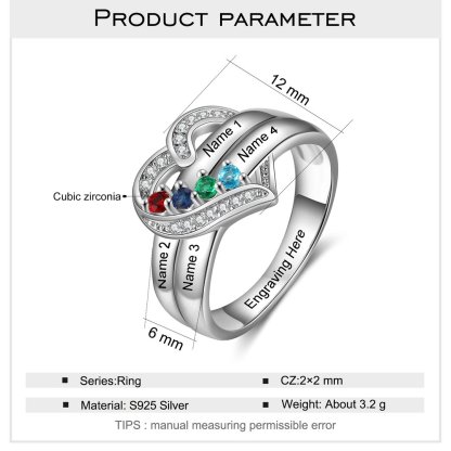 Anillo Plata 925 de corazón personalizado con 4 nombres y 4 piedras de nacimiento con 1 texto