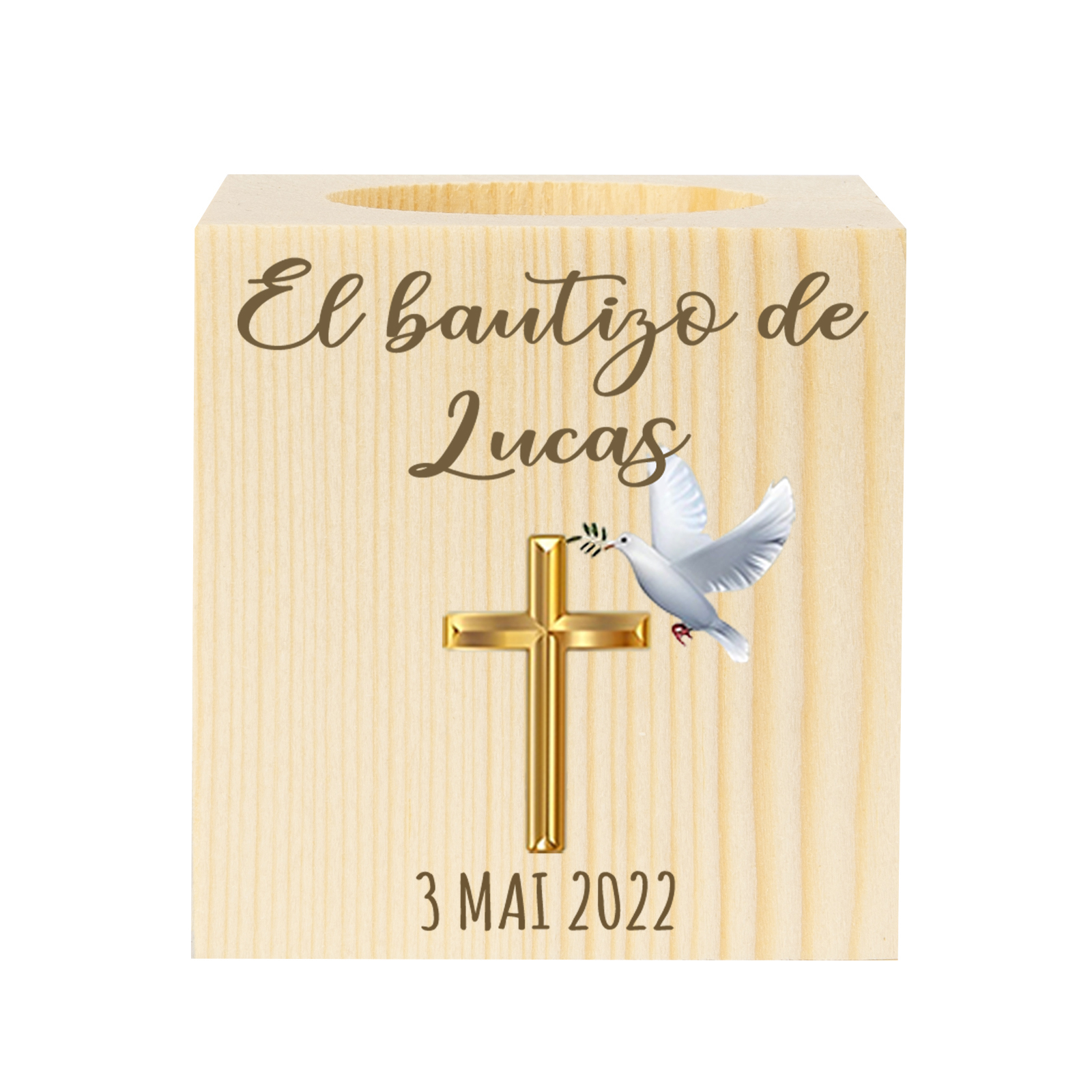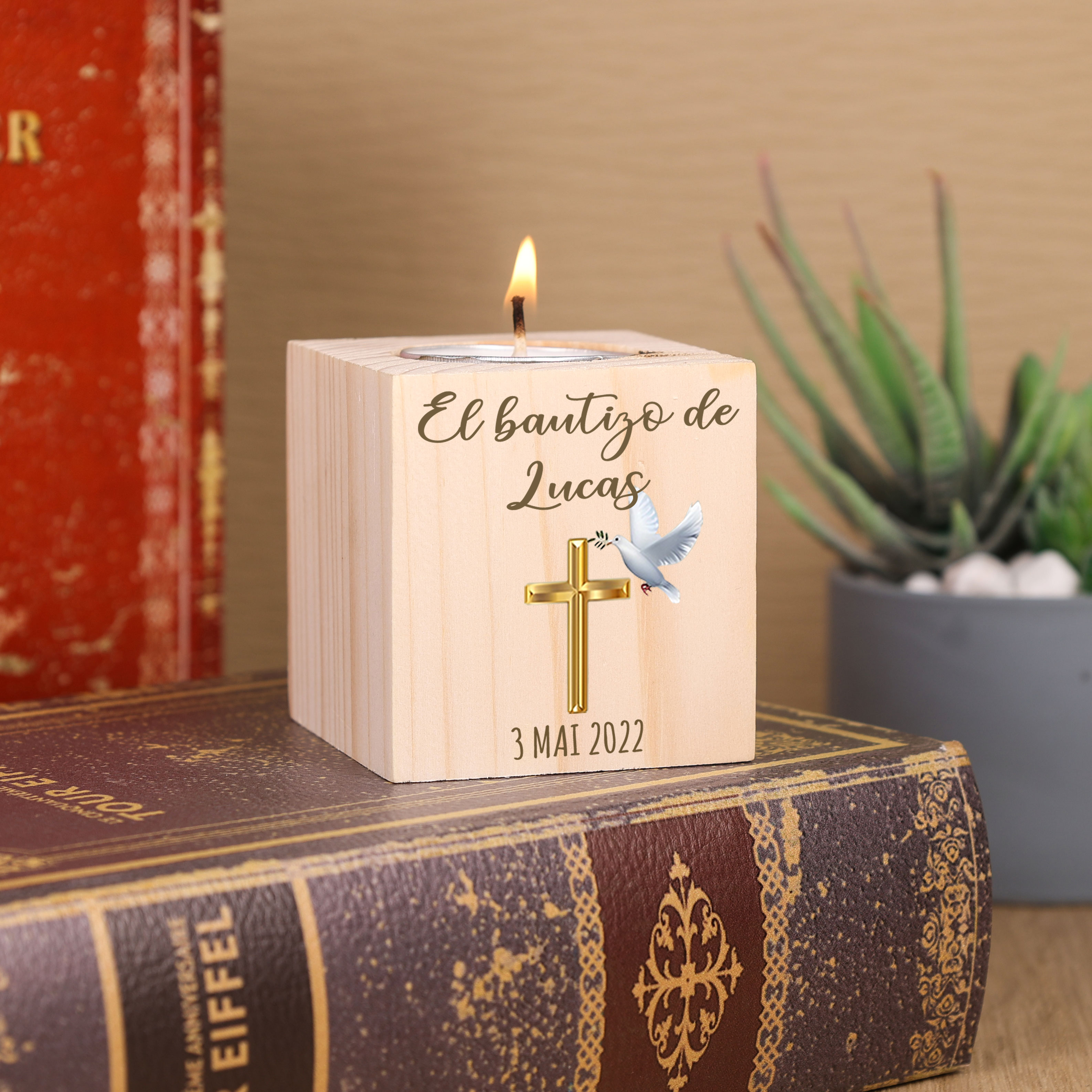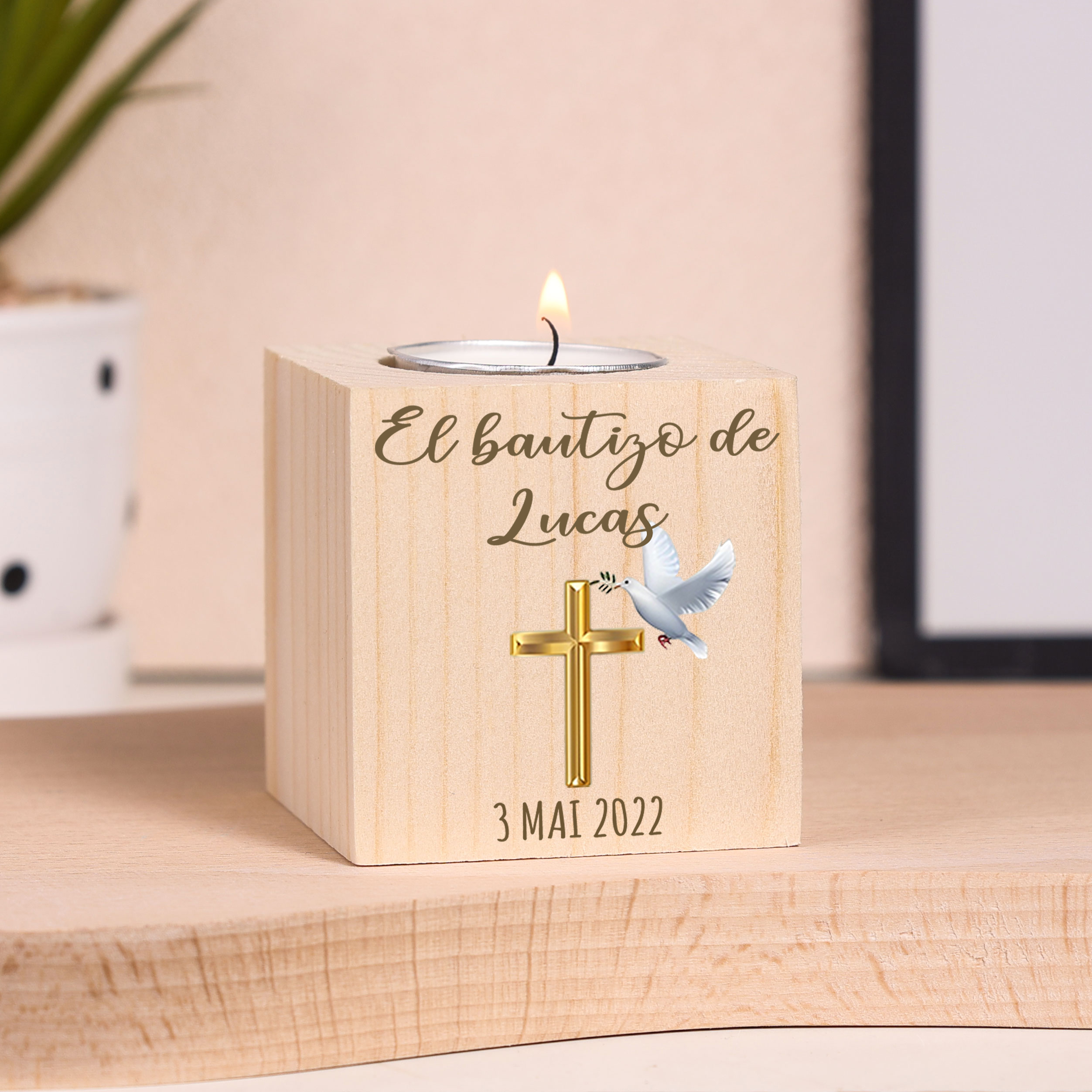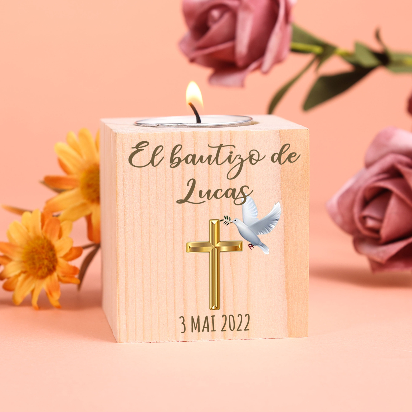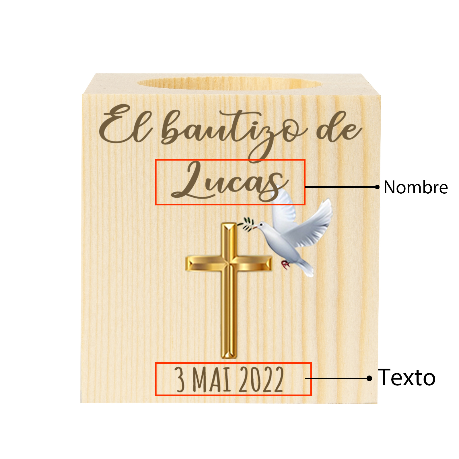 Bautizo Candelero de Madera Cruz Nombre Personalizado con Texto sin Vela