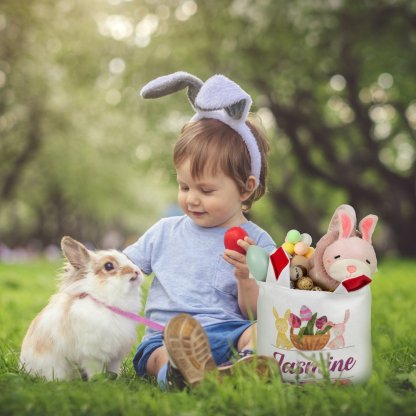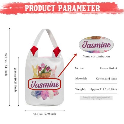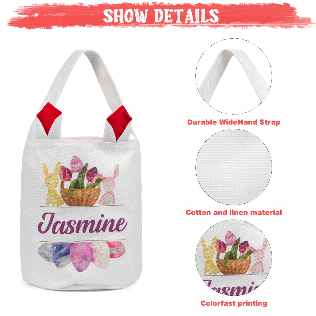 ¿Estás cansado de comprar canastas de Pascua que no duran? Nuestro bolso tote conejito es la combinación perfecta de ternura y resistencia. Está diseñado para durar con detalles clásicos impresos con su personalización. ¡Tus pequeños conejitos serán los más lindos con sus canastas de Pascua personalizadas con orejas de conejo en la gran búsqueda de huevos!