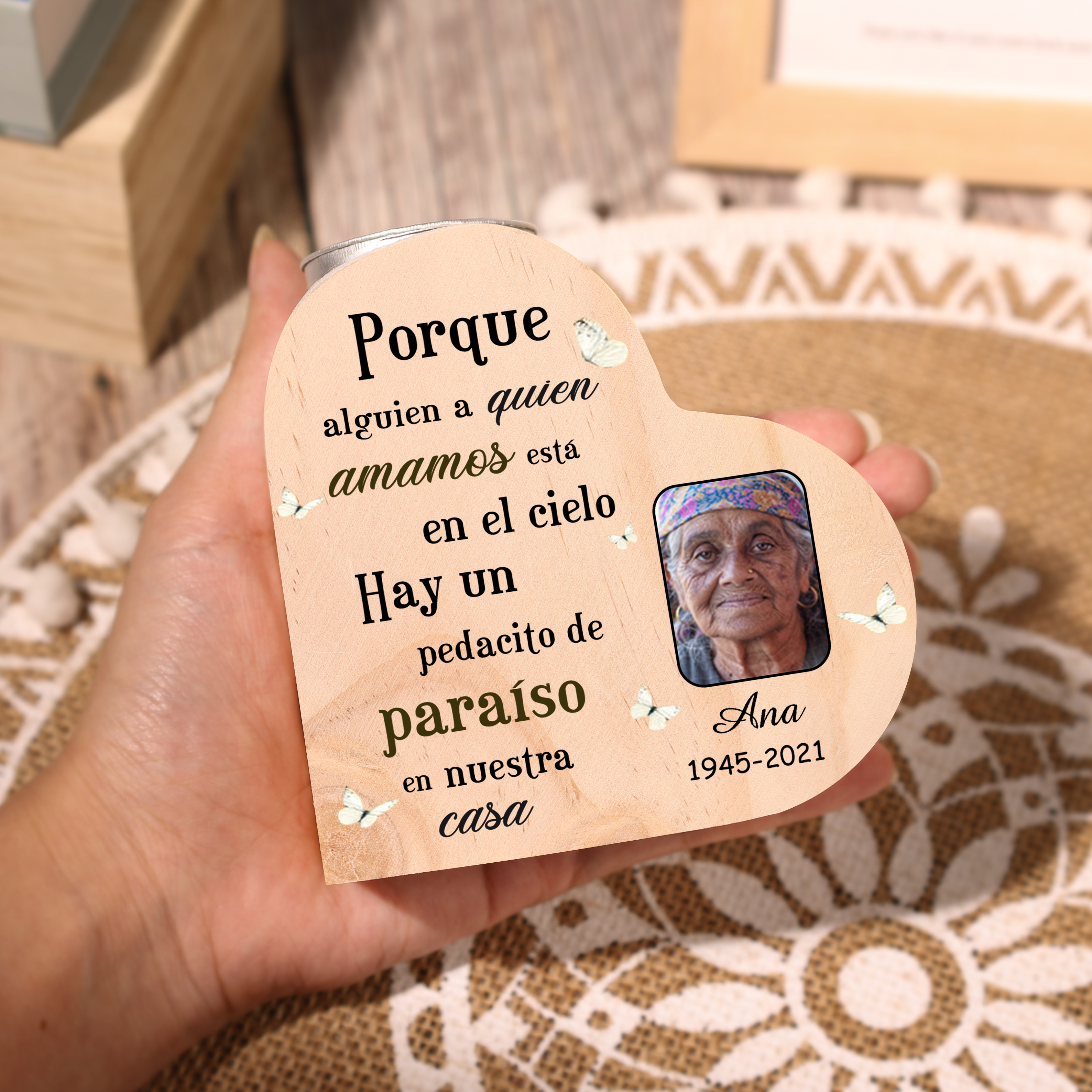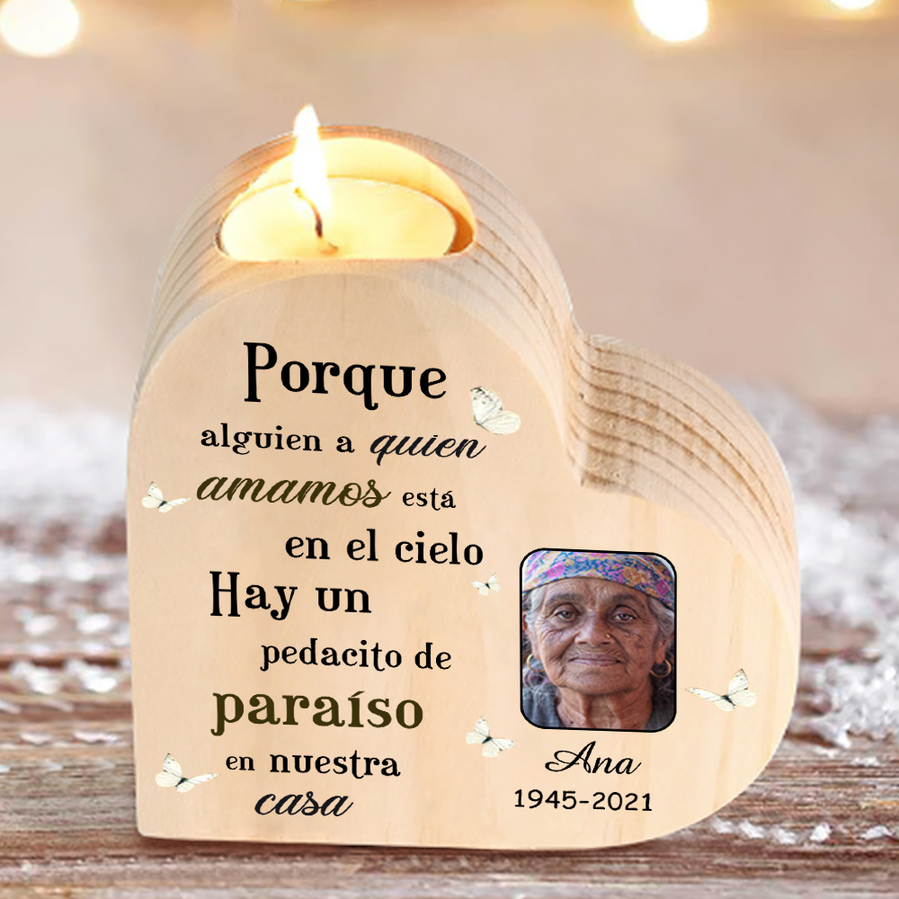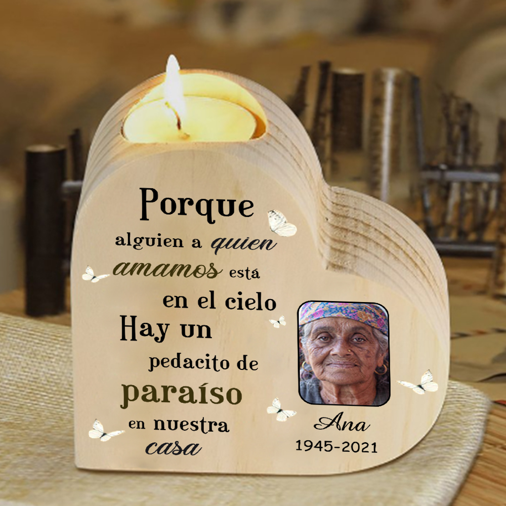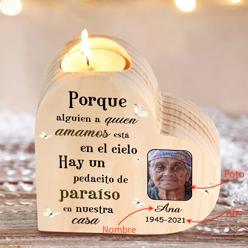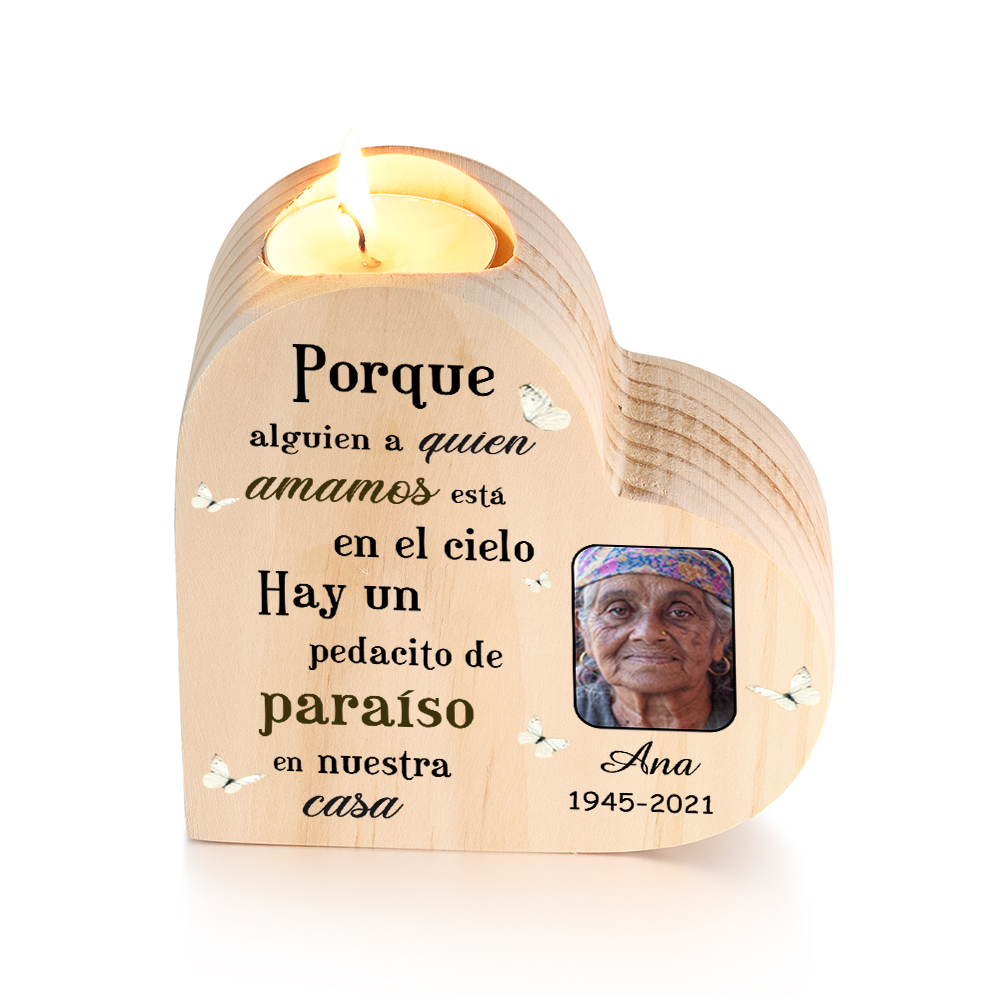 Candelero de corazón en memoria de ser querido de madera foto, nombre y año personalizados sin vela
