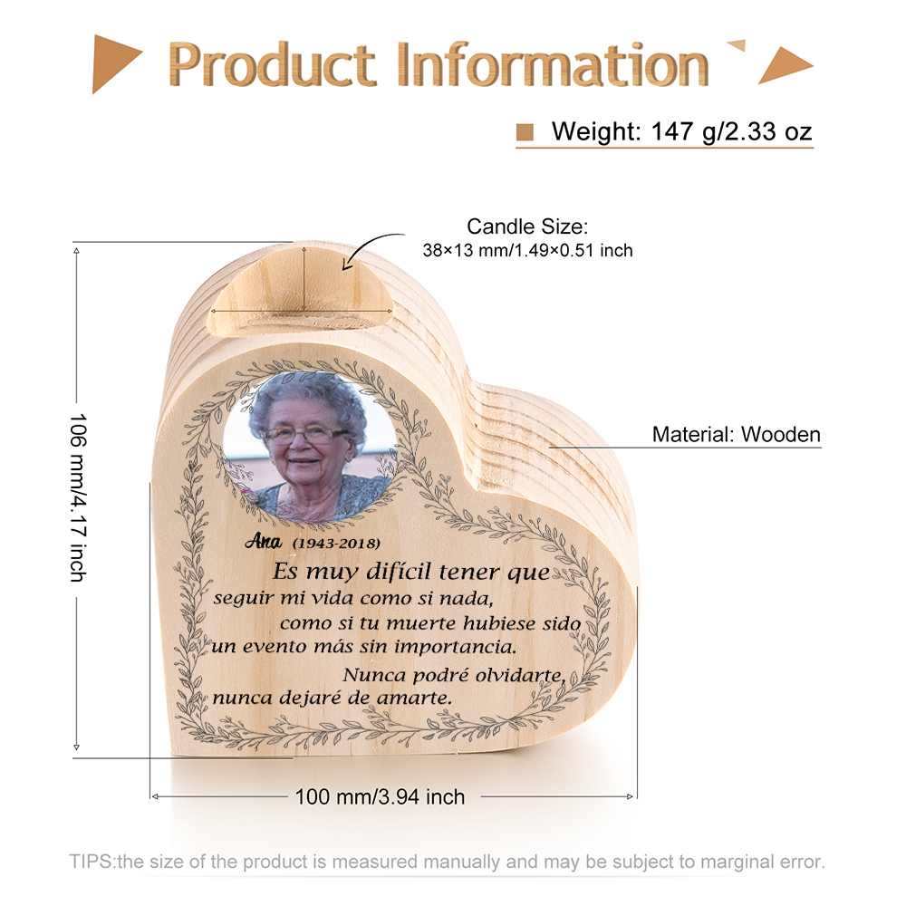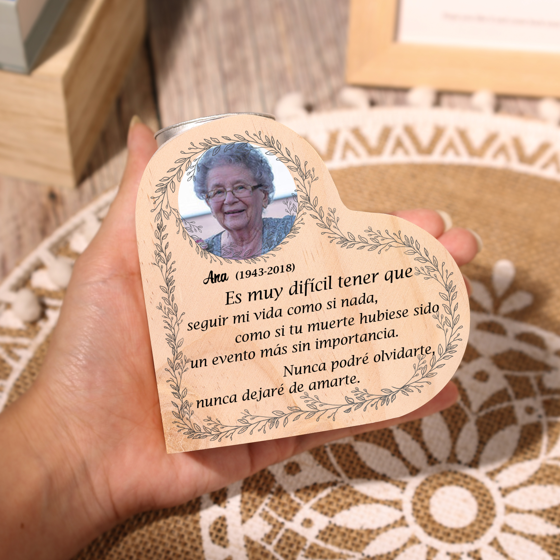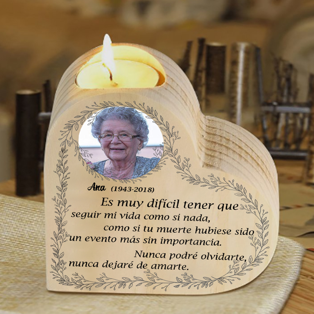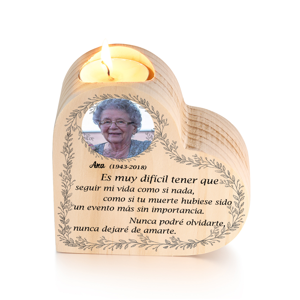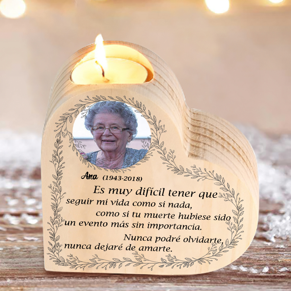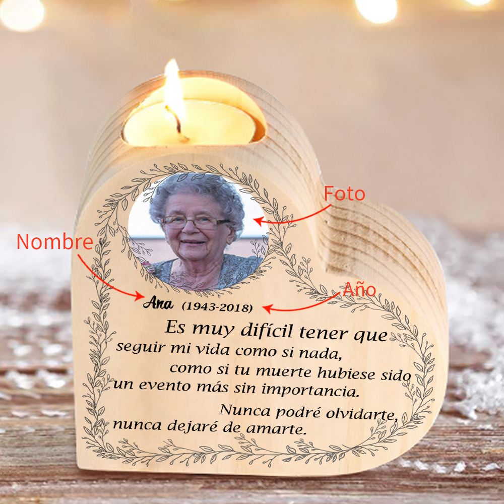 Candelero de corazón en memoria de ser querido de madera foto, nombre y año personalizados sin vela
