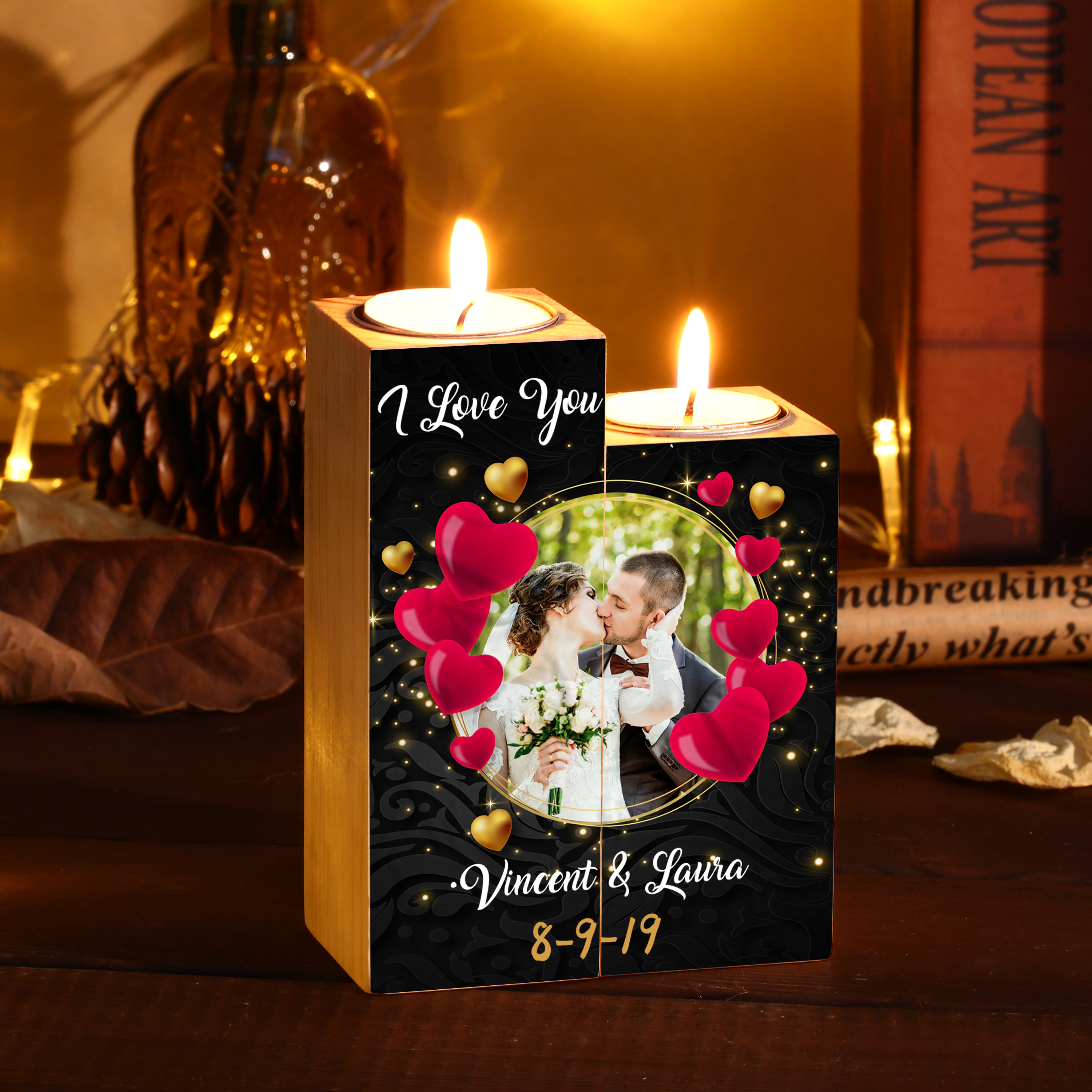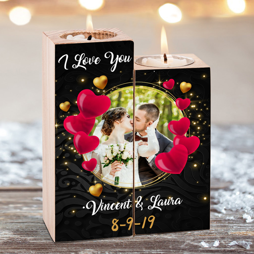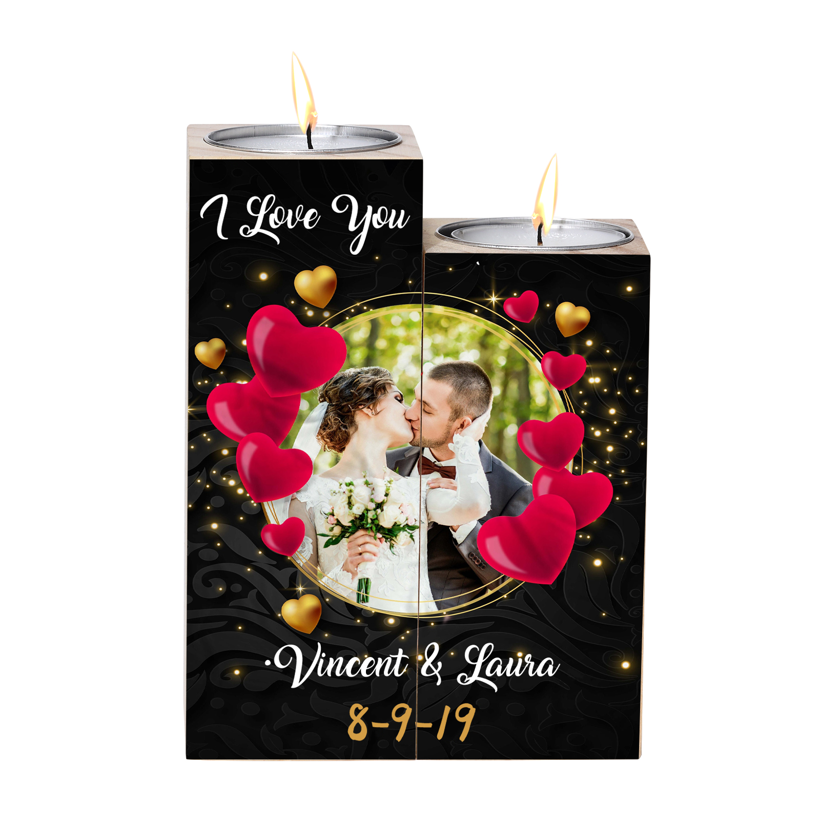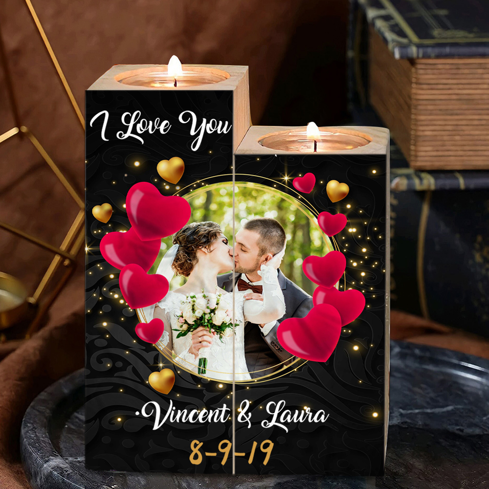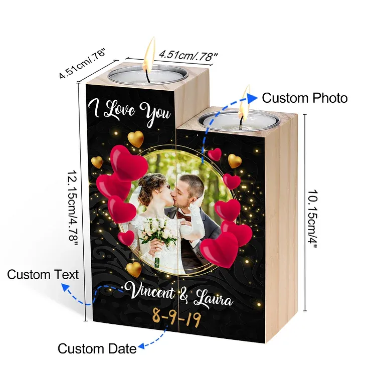 Candelero de madera sin vela personalizado con fecha, texto y foto