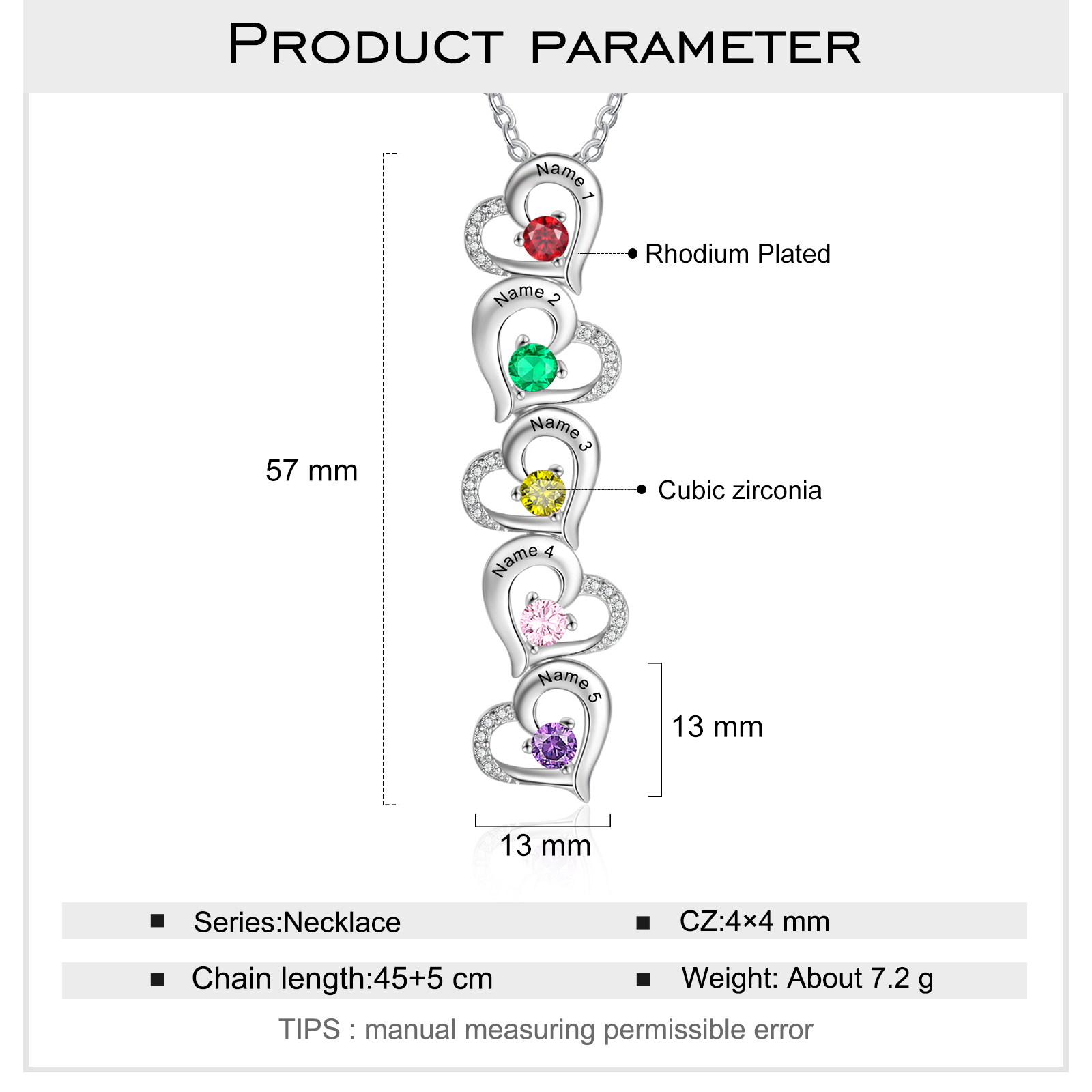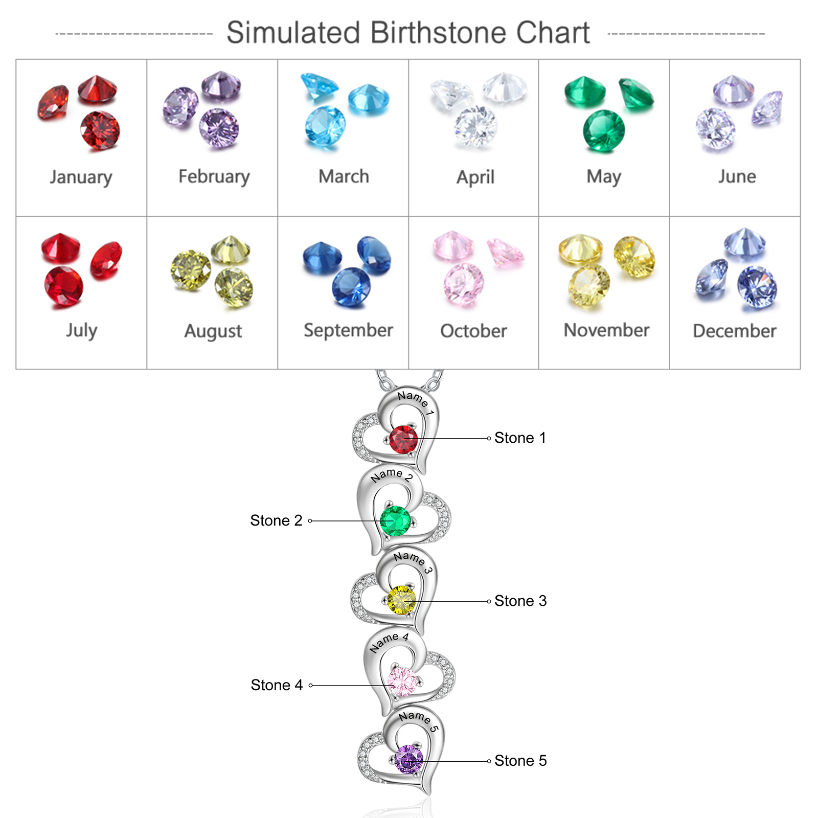 Collar para mujer con colgantes de corazón con 5 nombres personalizados y 5 piedras de nacimiento