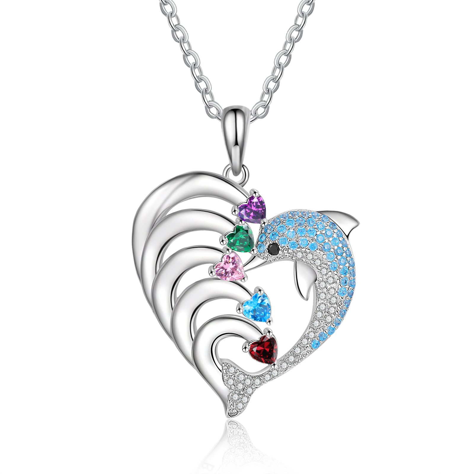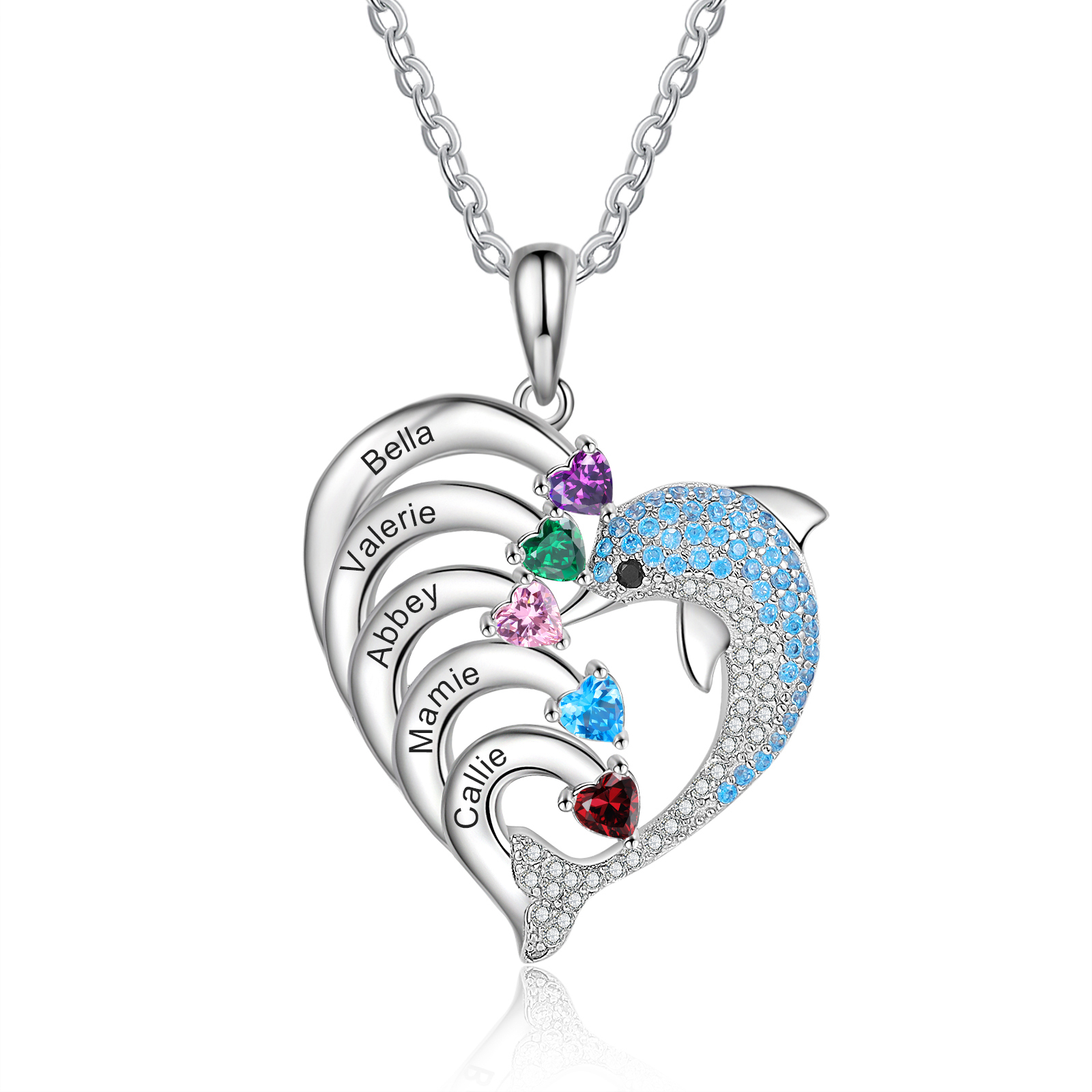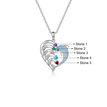 Collar para mujer en corazón delfín 5 nombres y 5 piedras de nacimiento personalizados