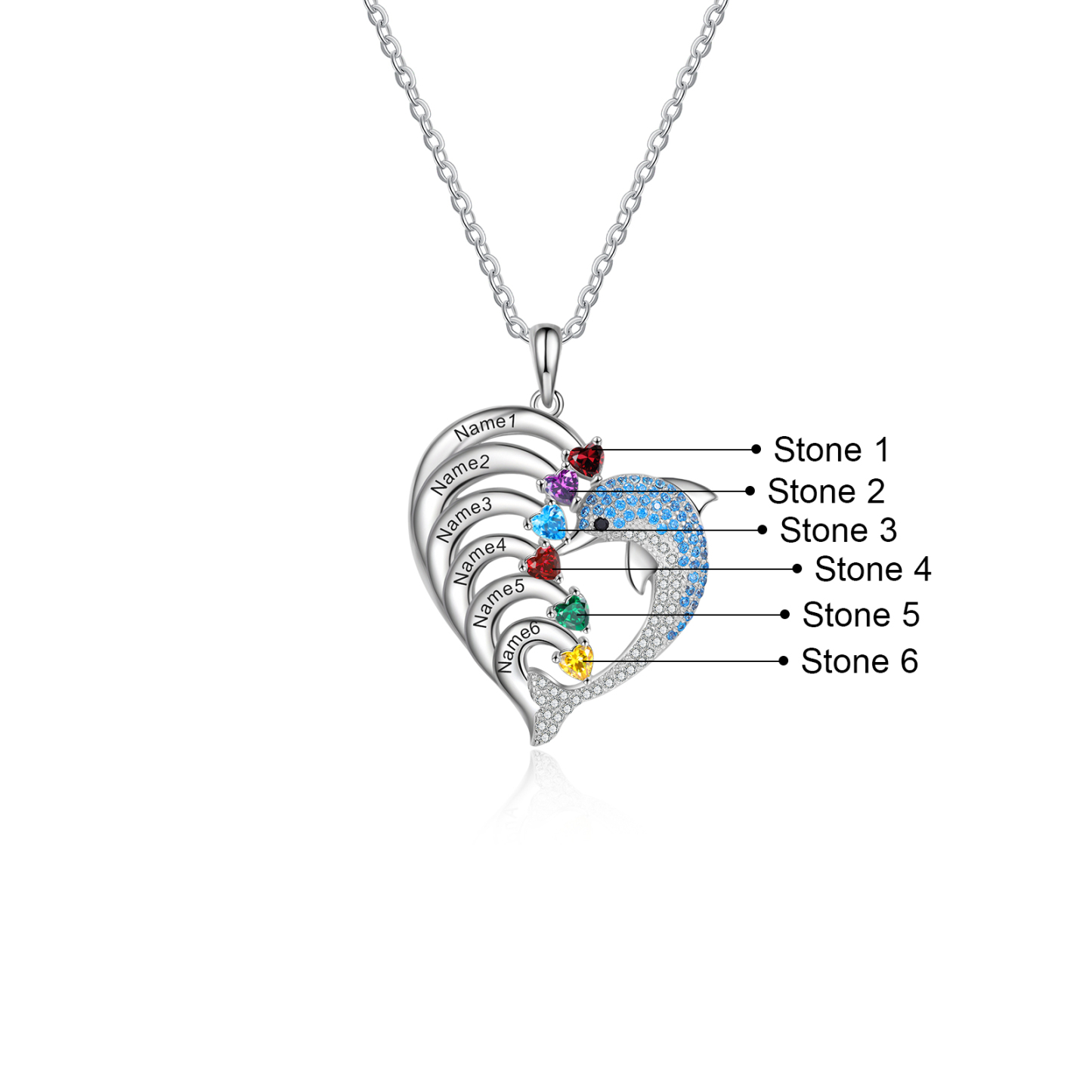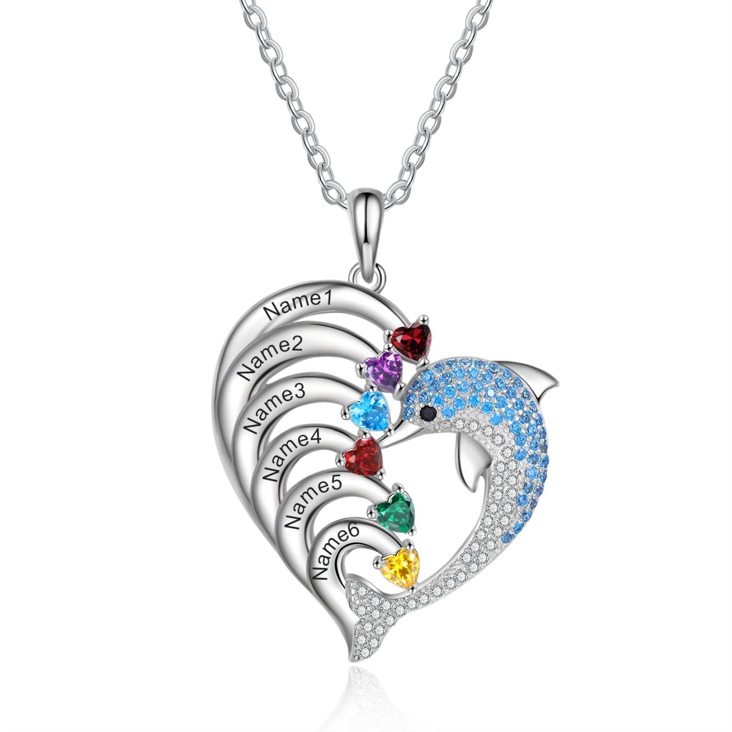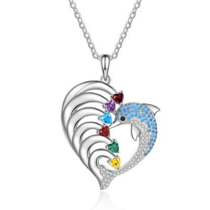 Collar para mujer en corazón delfín 6 nombres y 6 piedras de nacimiento personalizados