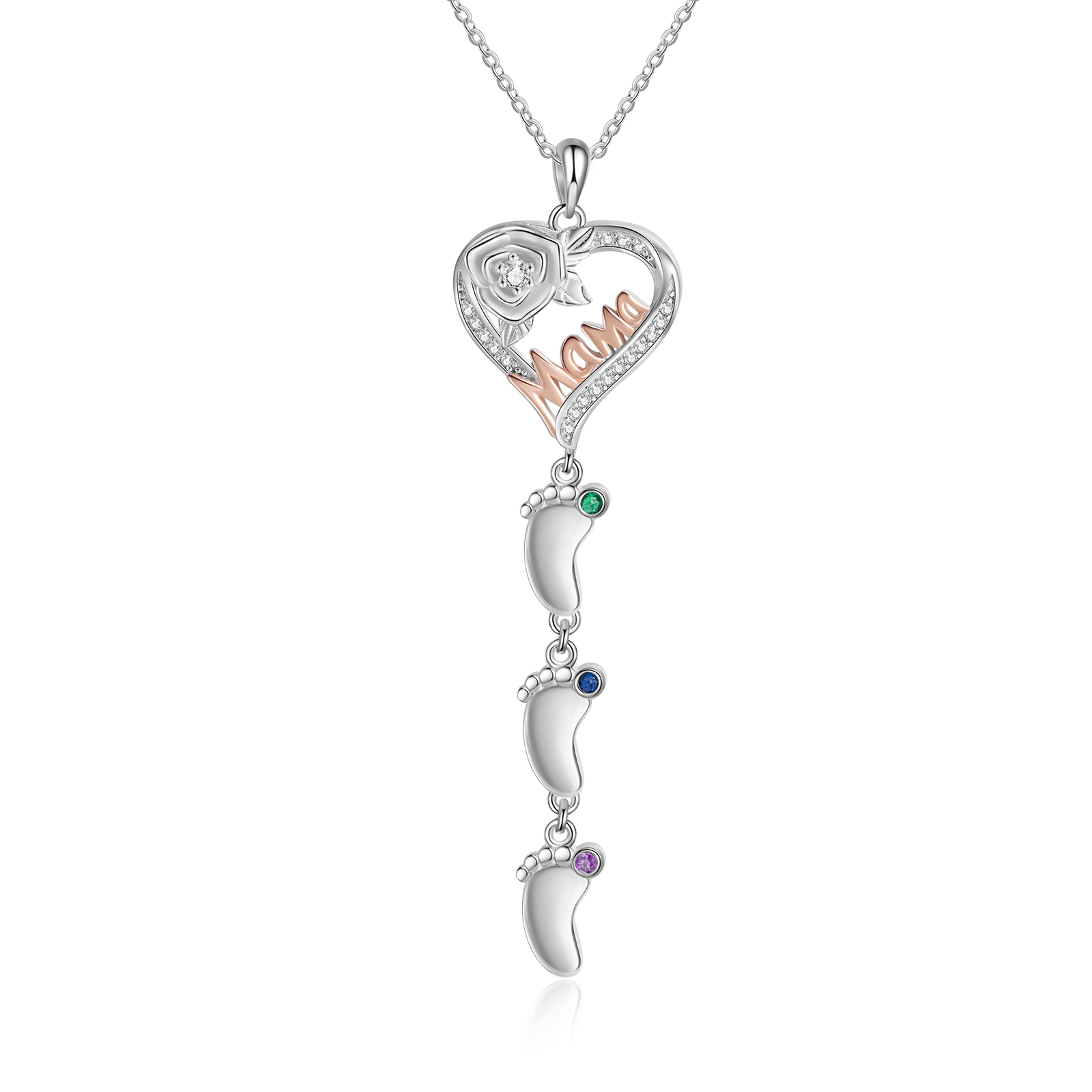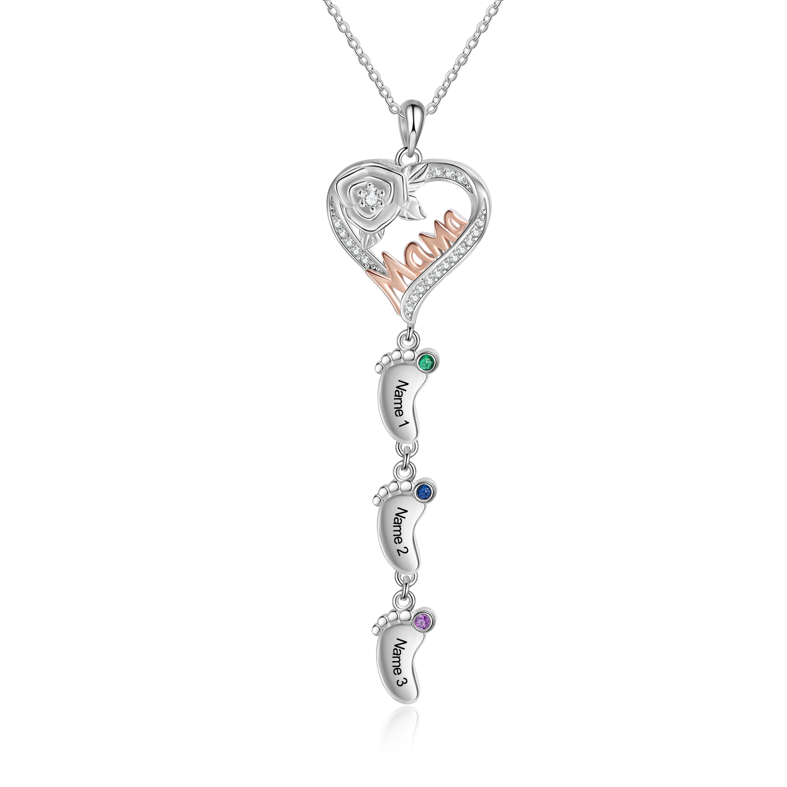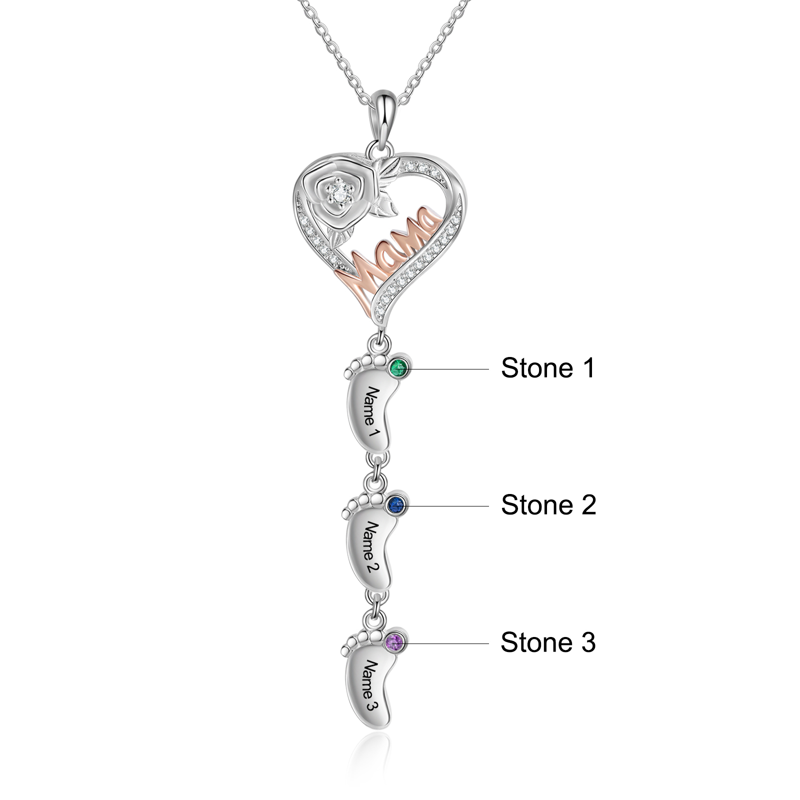 Collar a mamá "mama" pies de bebé 3 nombres personalizados con 3 piedras de nacimiento