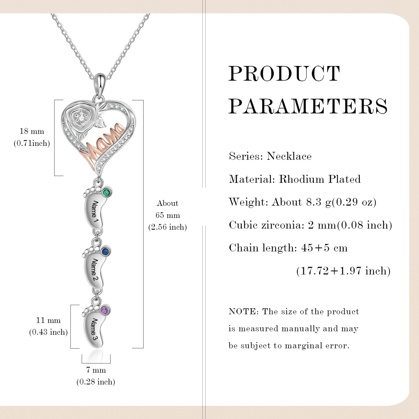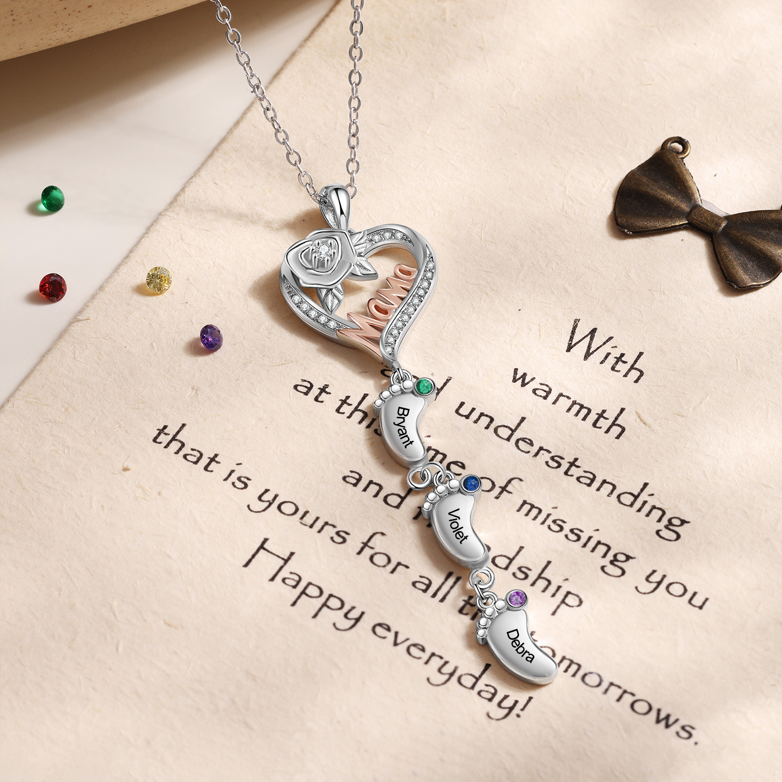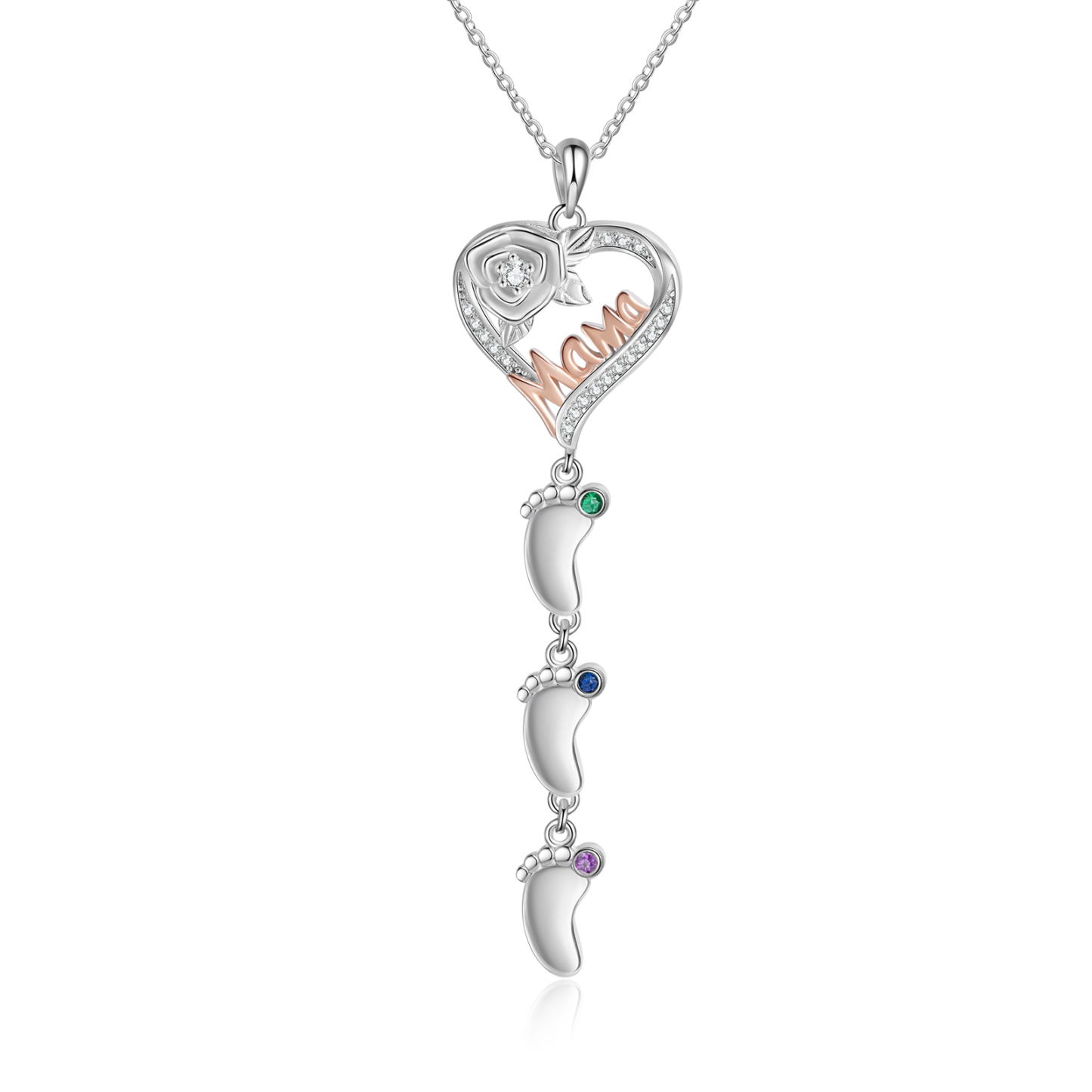 Collar a mamá "mama" pies de bebé 3 nombres personalizados con 3 piedras de nacimiento