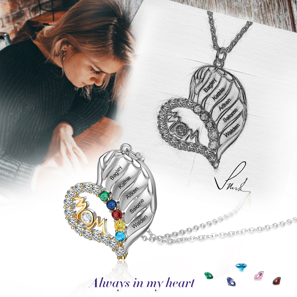 Collar a mamá "Mom" de corazón de plata 925 5 nombres y 5 piedras de nacimiento personalizados