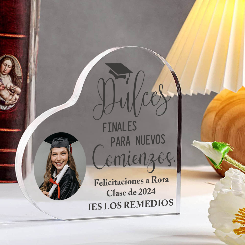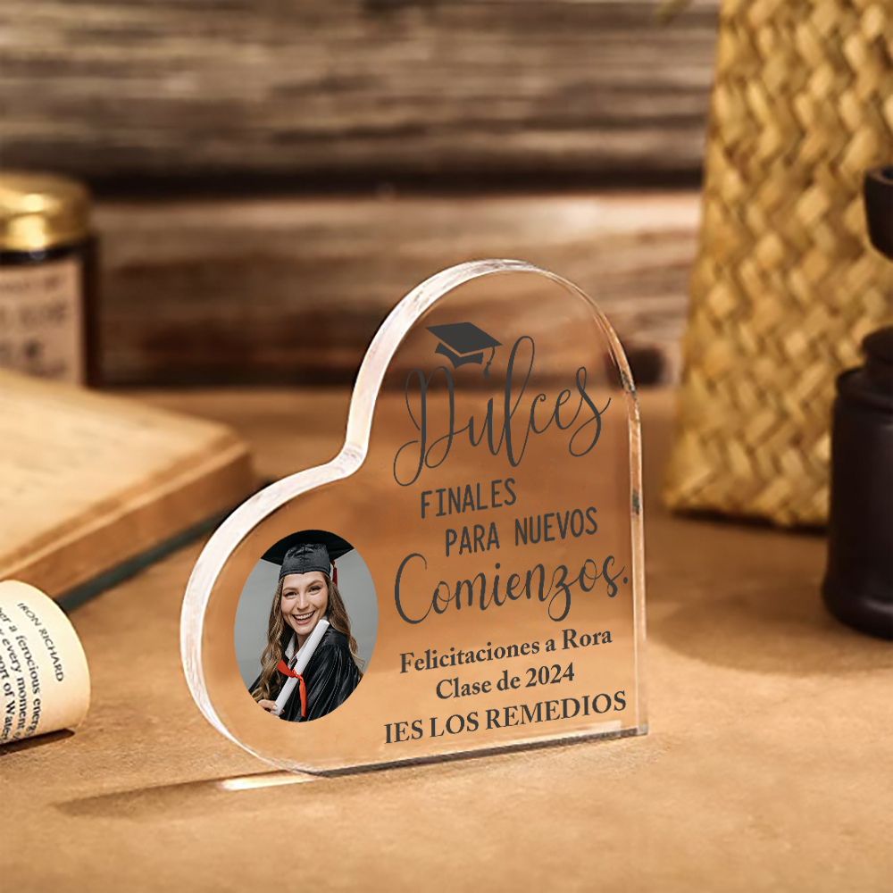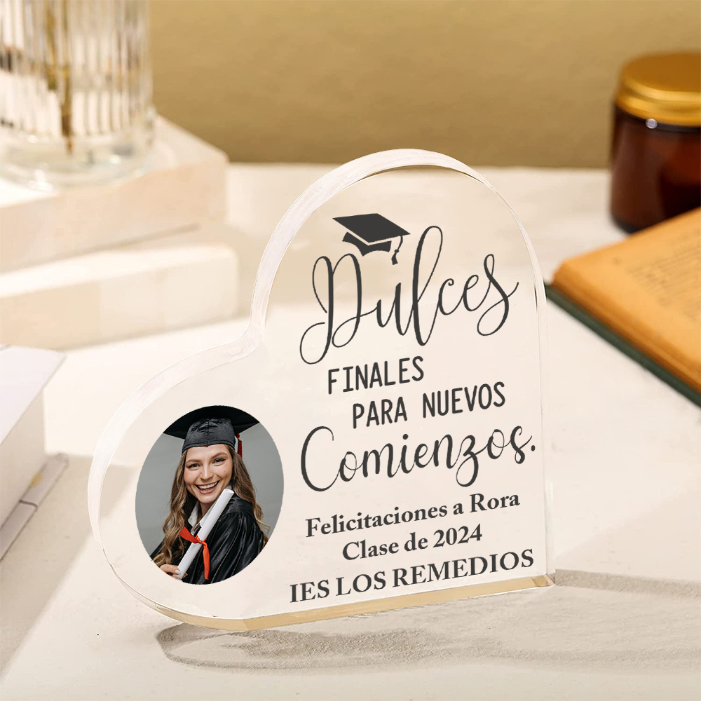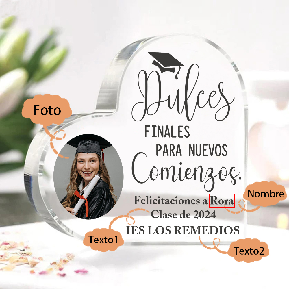 Graduación-Placa de corazón de acrílico personalizado con 1 nombre, 2 textos y 1 foto