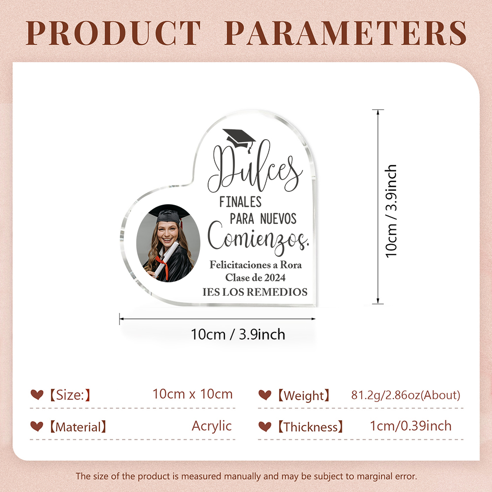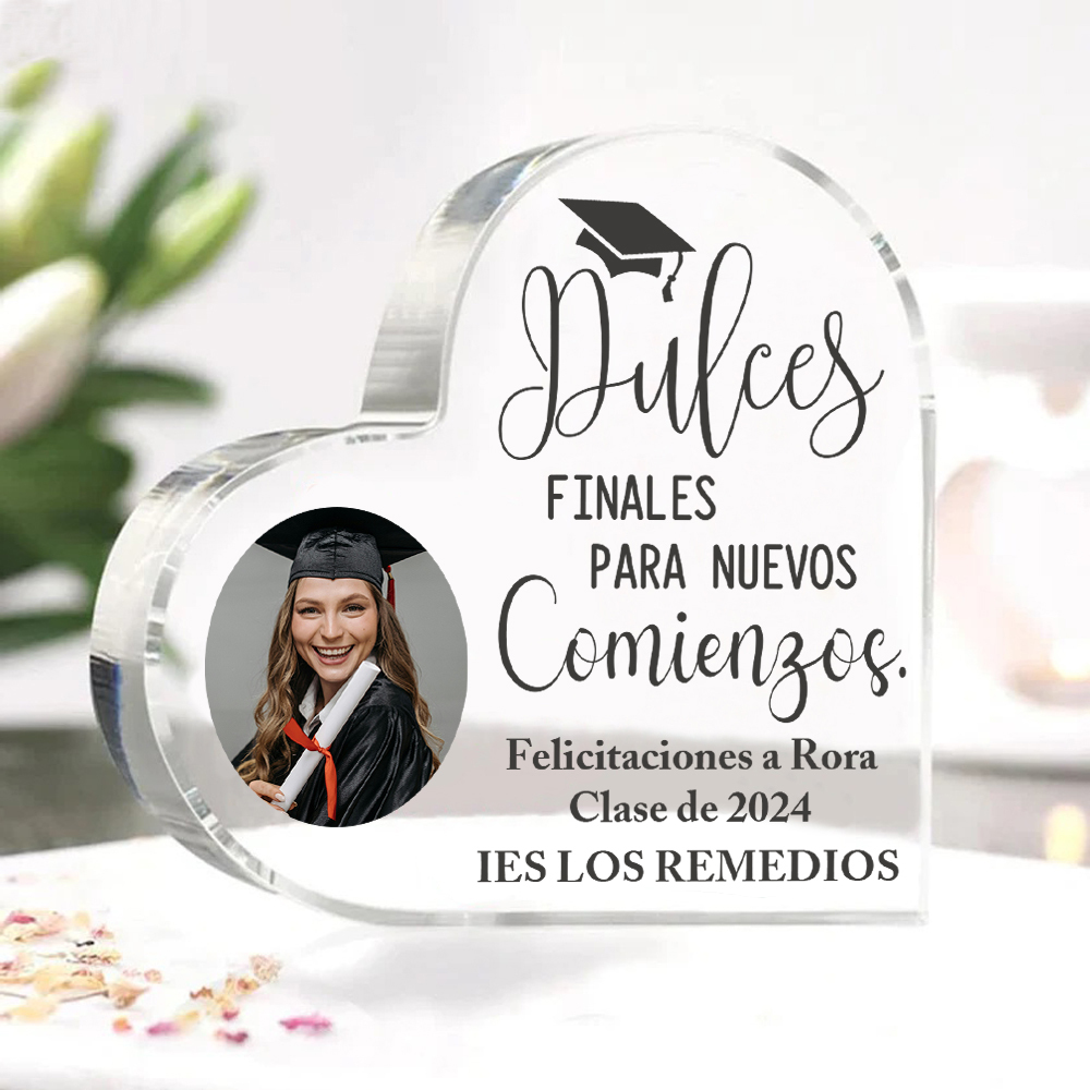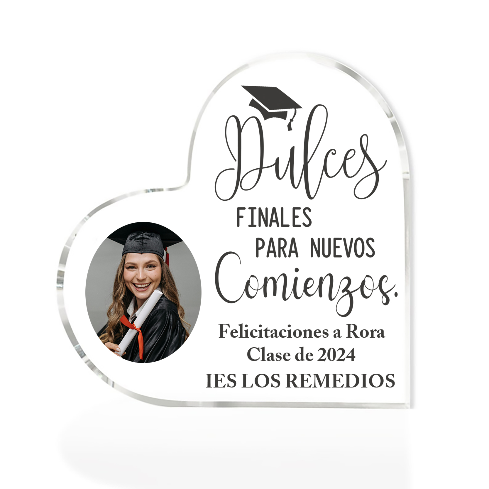 Graduación-Placa de corazón de acrílico personalizado con 1 nombre, 2 textos y 1 foto
