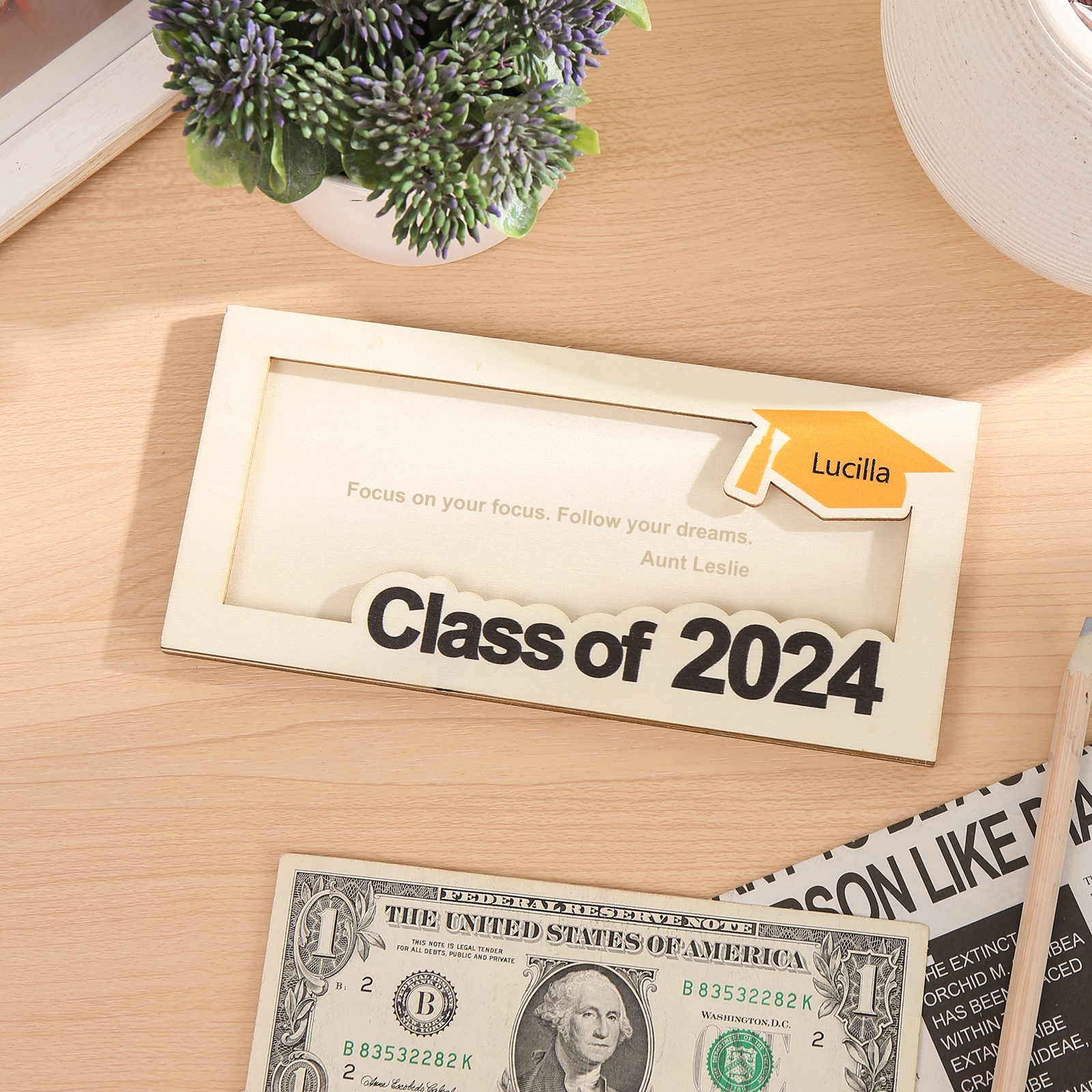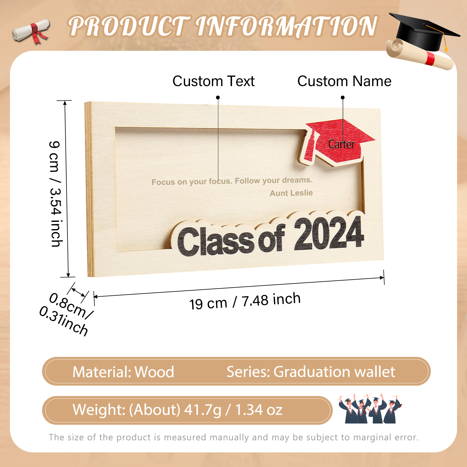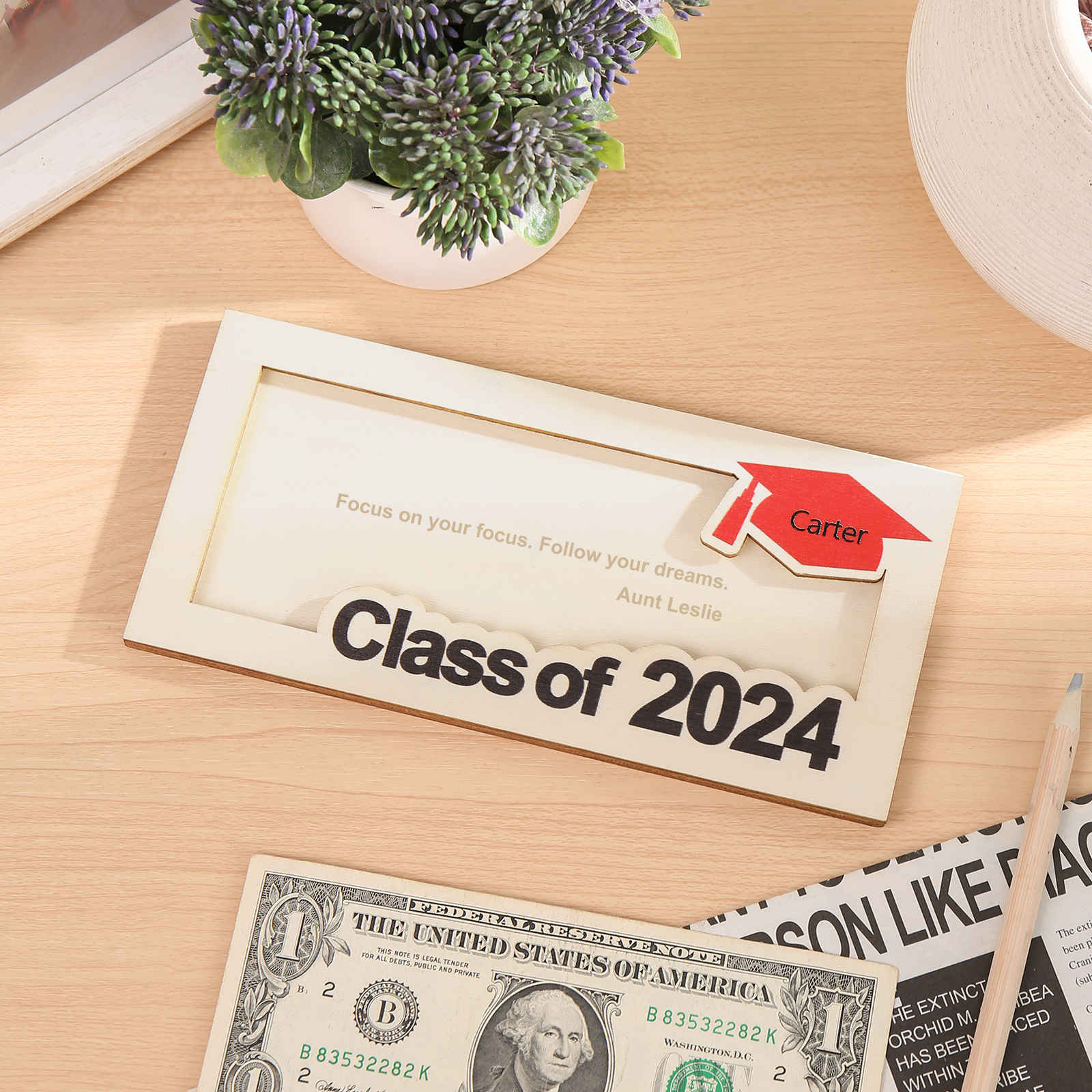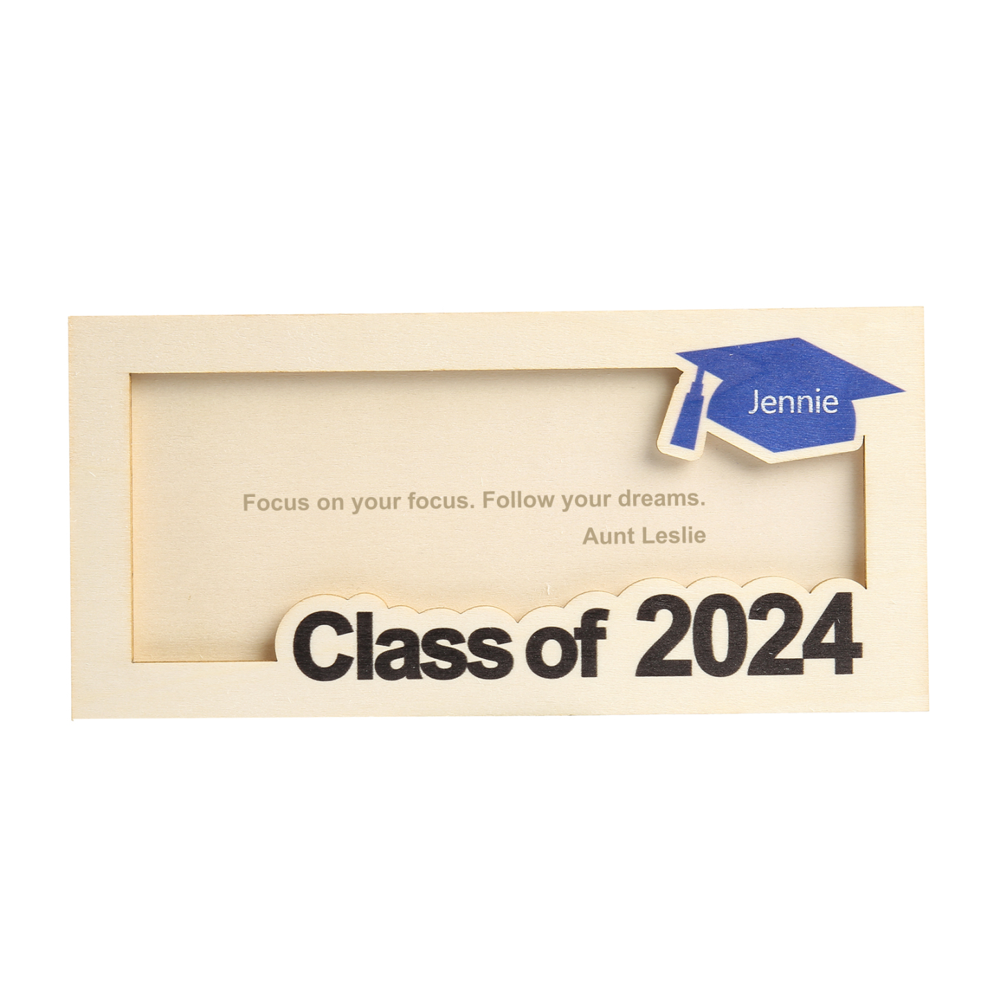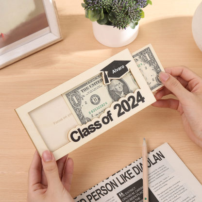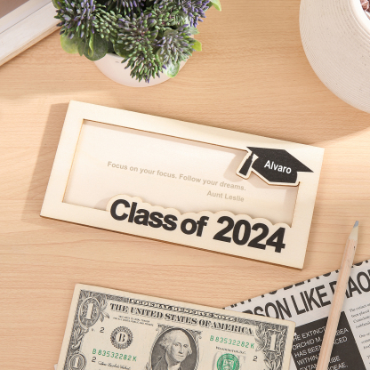 Graduación-Tarjetero para moneda de madera personalizado con 1 nombre y 1 texto