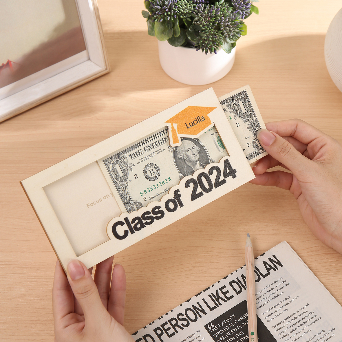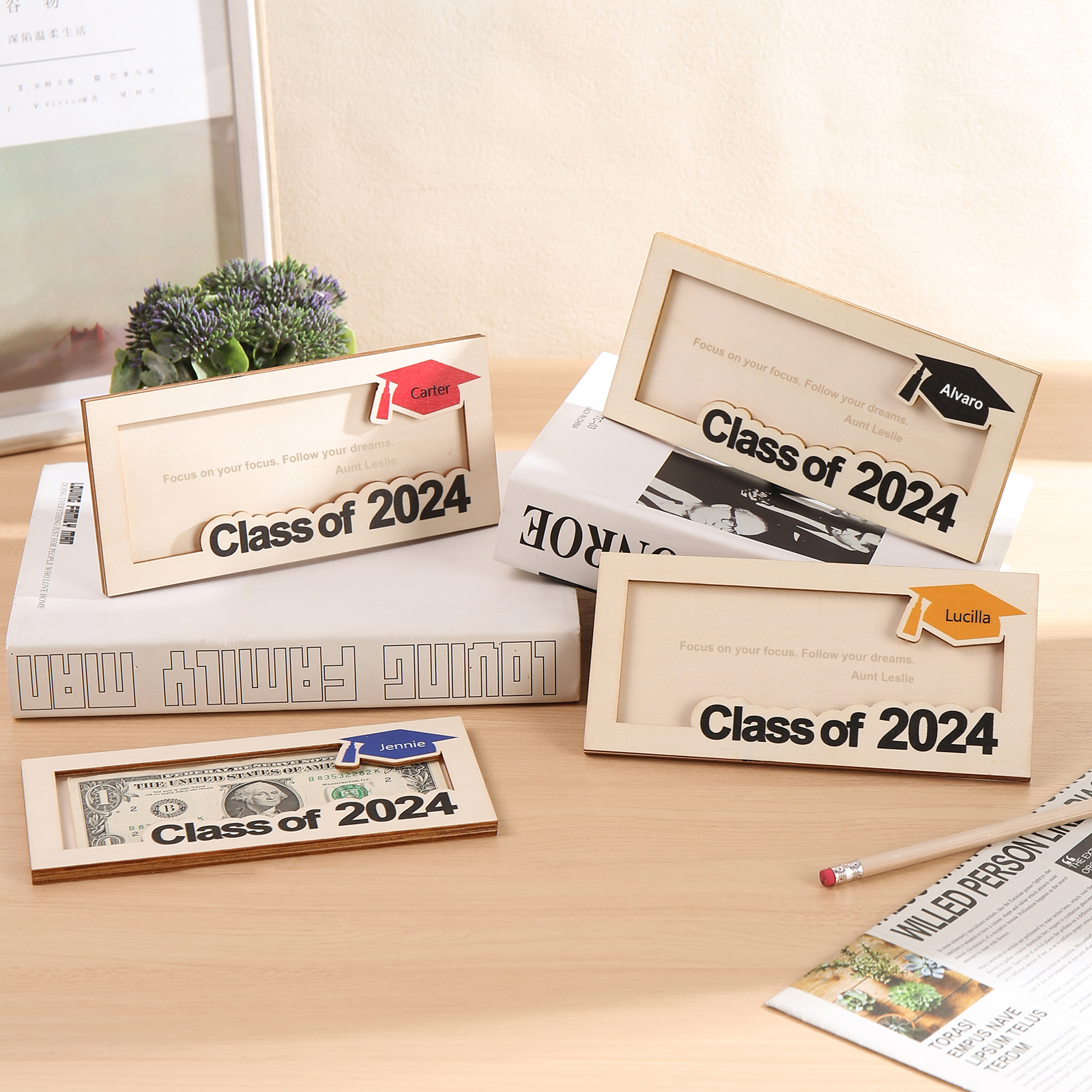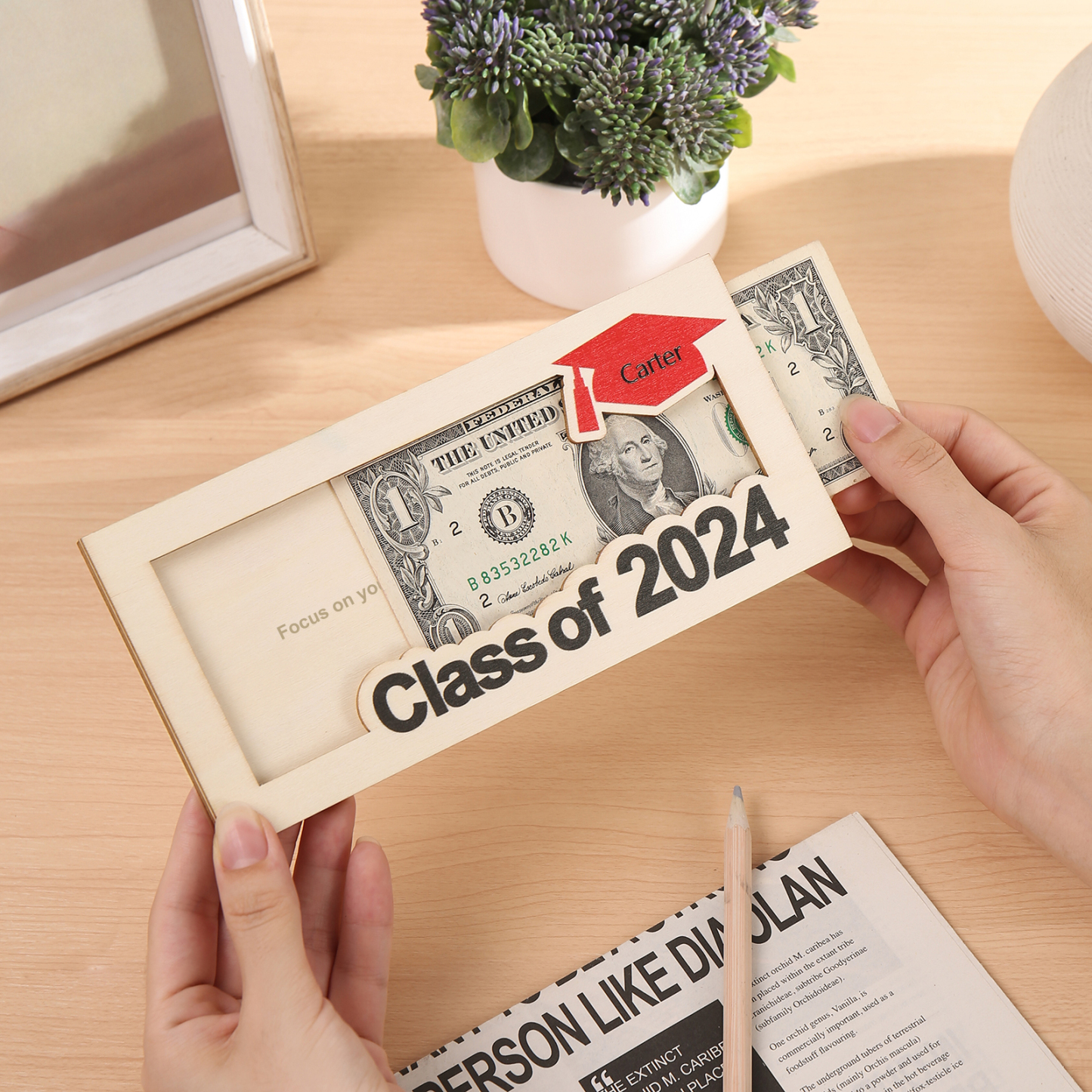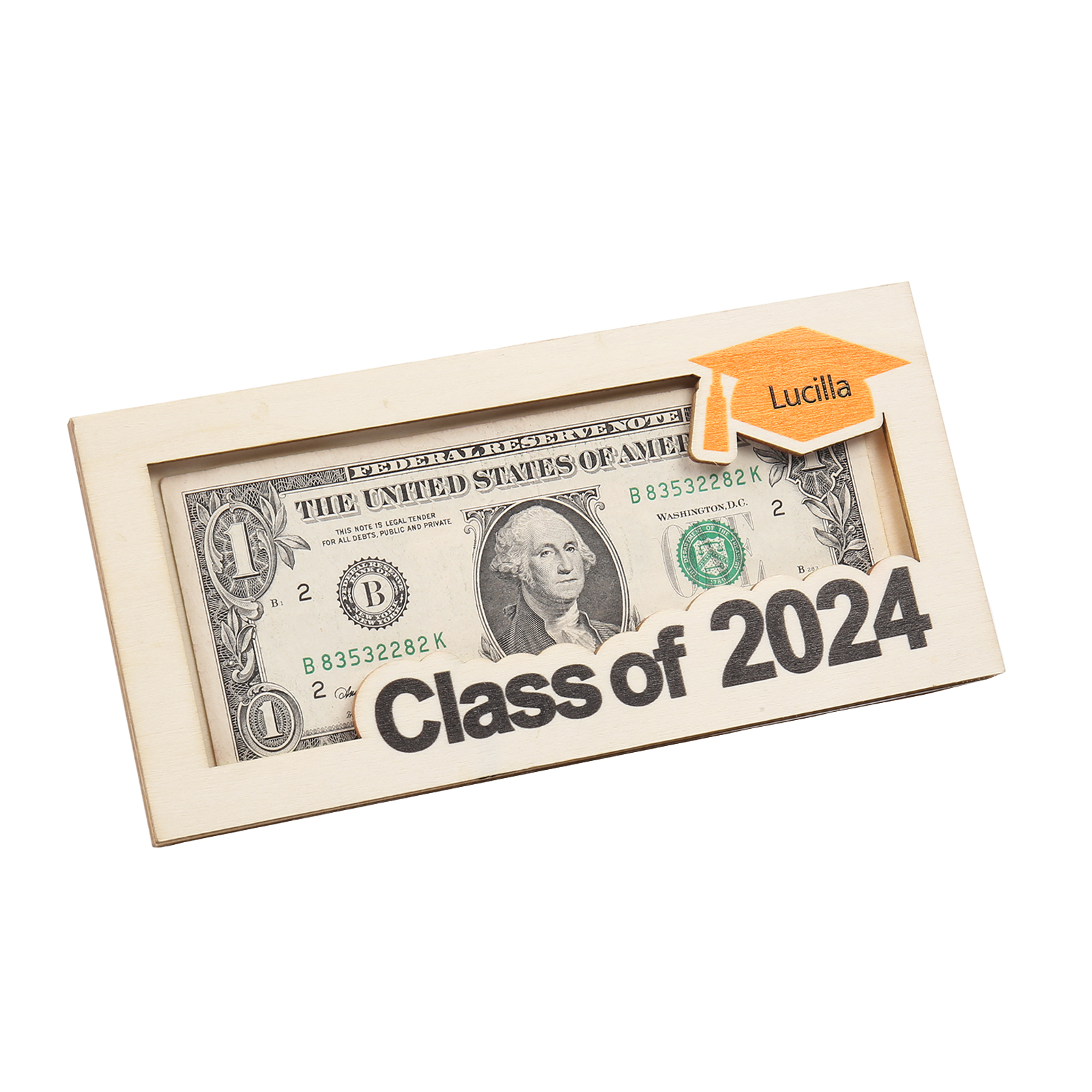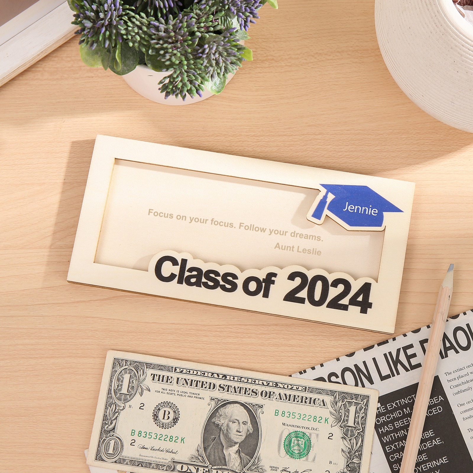 Graduación-Tarjetero para moneda de madera personalizado con 1 nombre y 1 texto