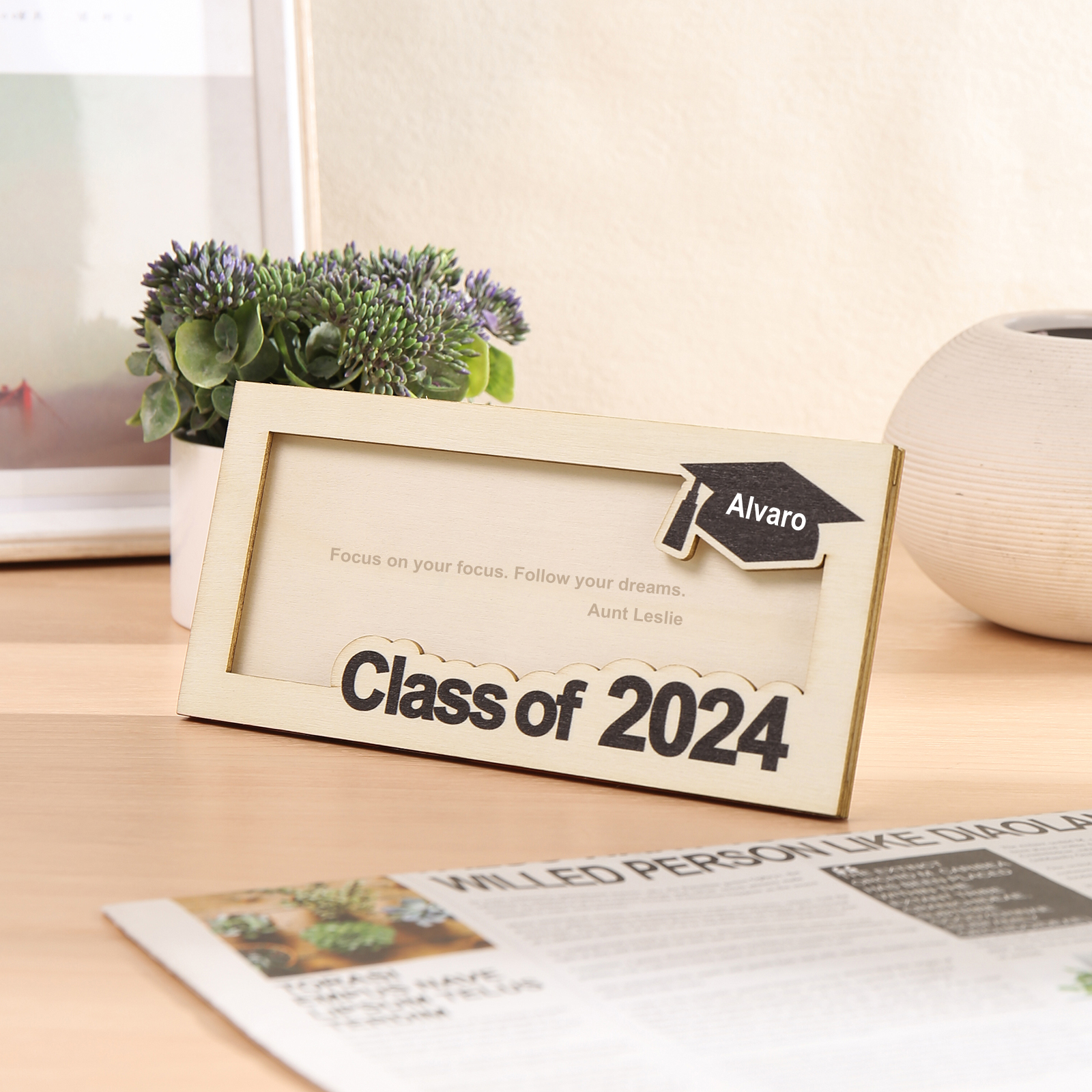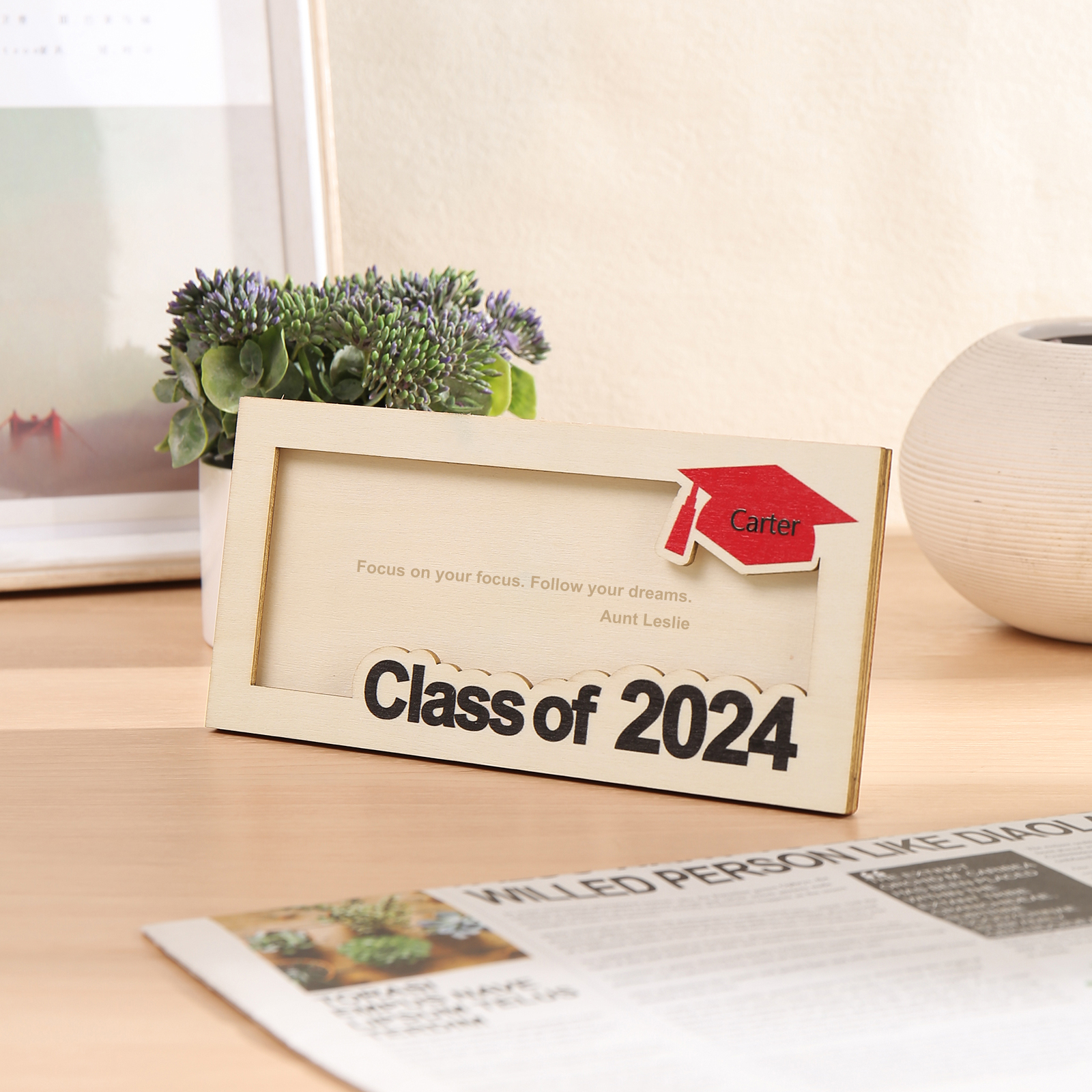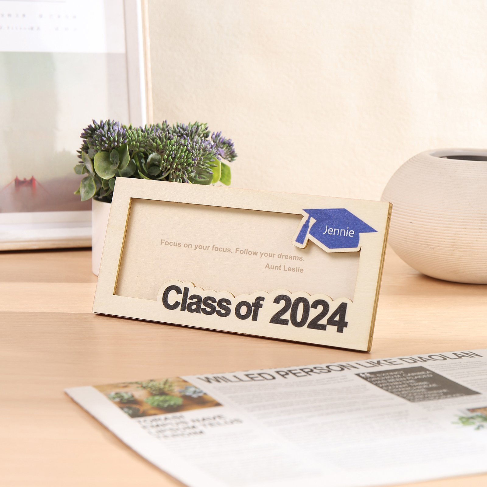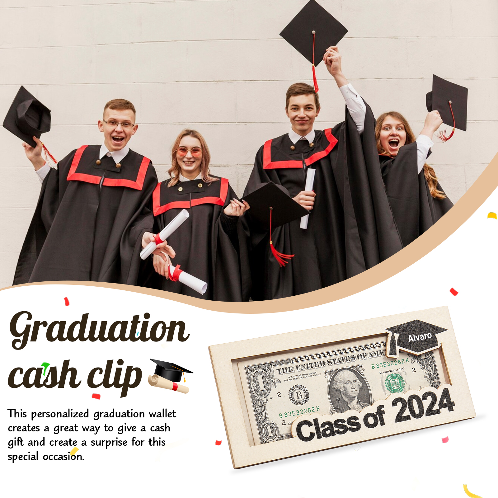 Graduación-Tarjetero para moneda de madera personalizado con 1 nombre y 1 texto