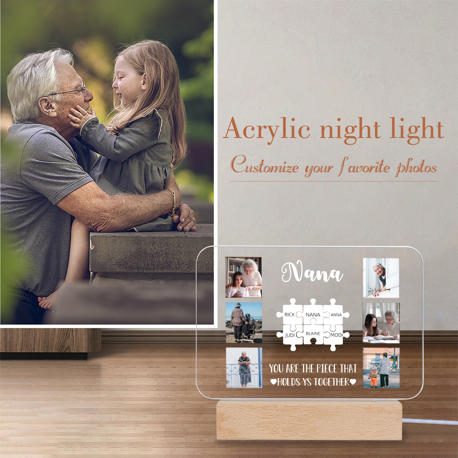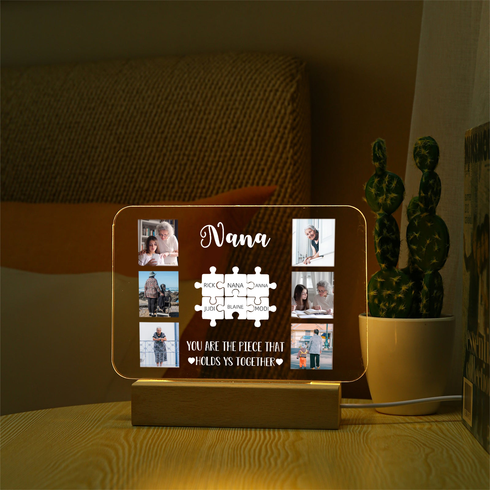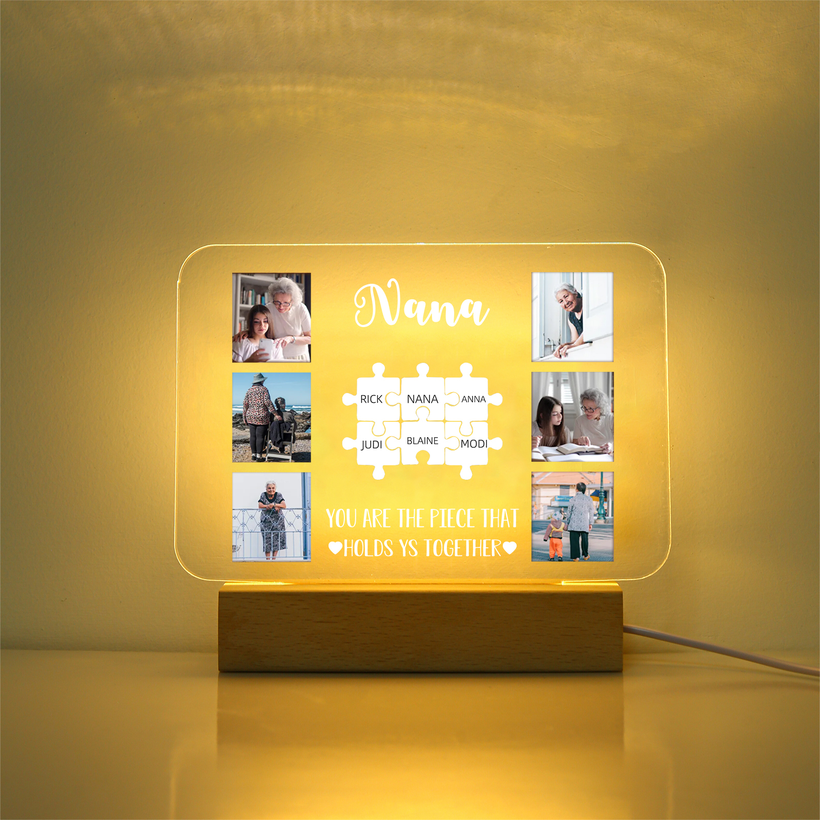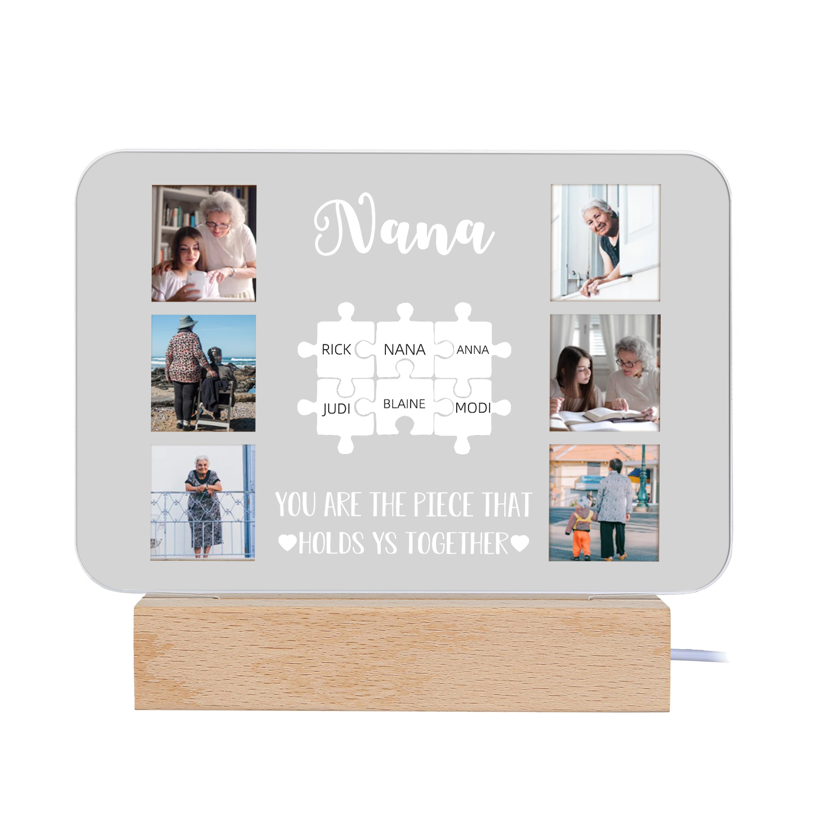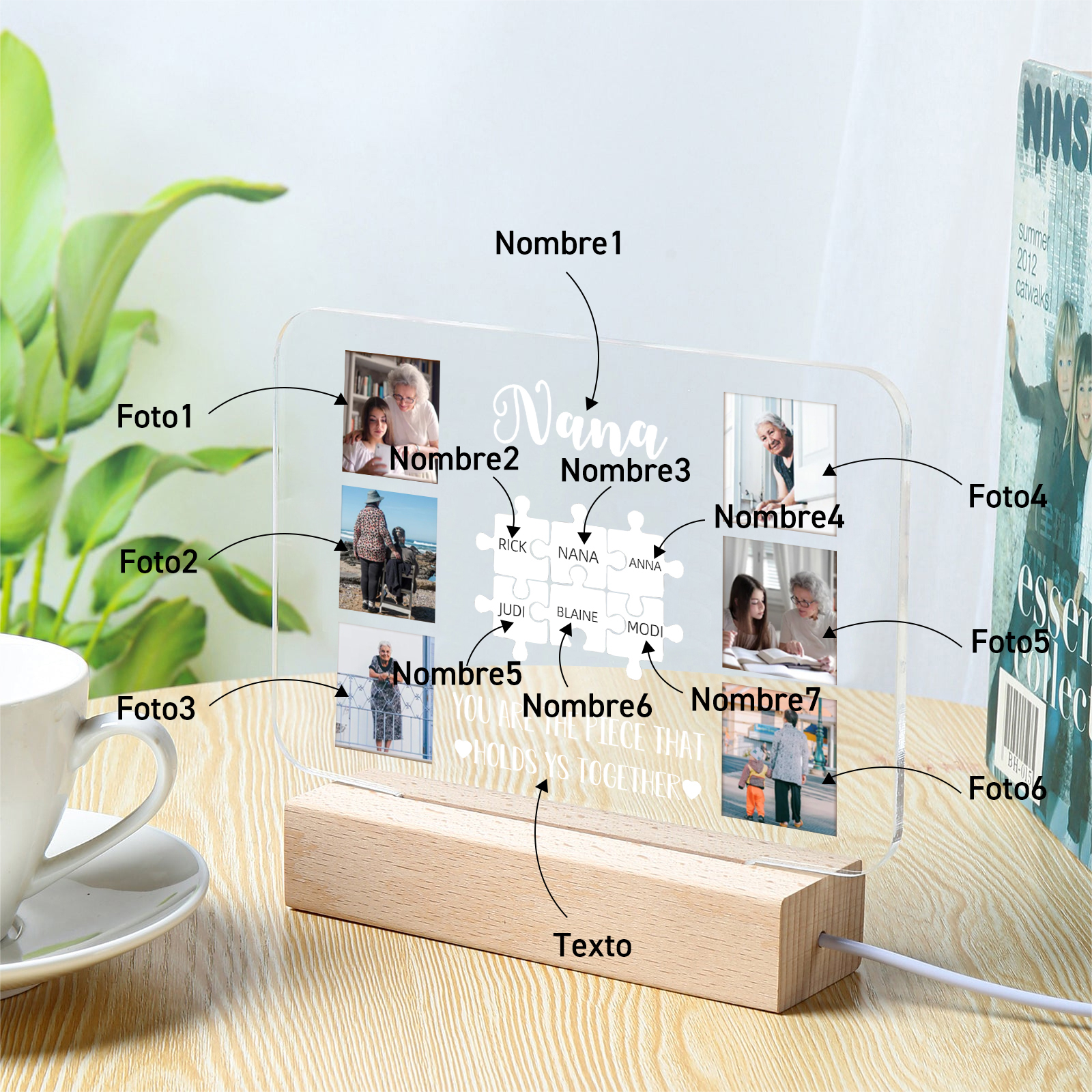 Lámpara de noche LED 6 fotos cariñosas con 1 texto y 7 nombres personalizados en rompecabezas