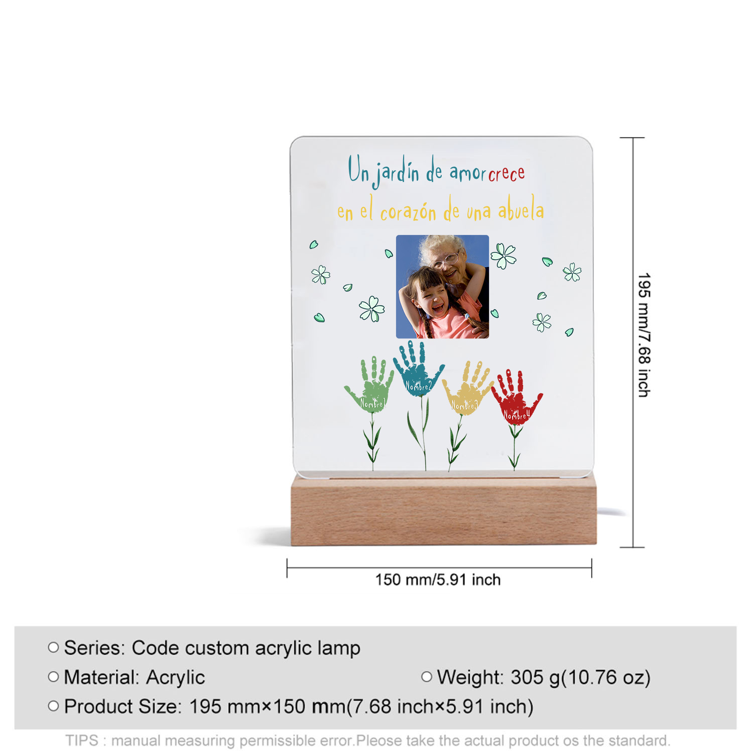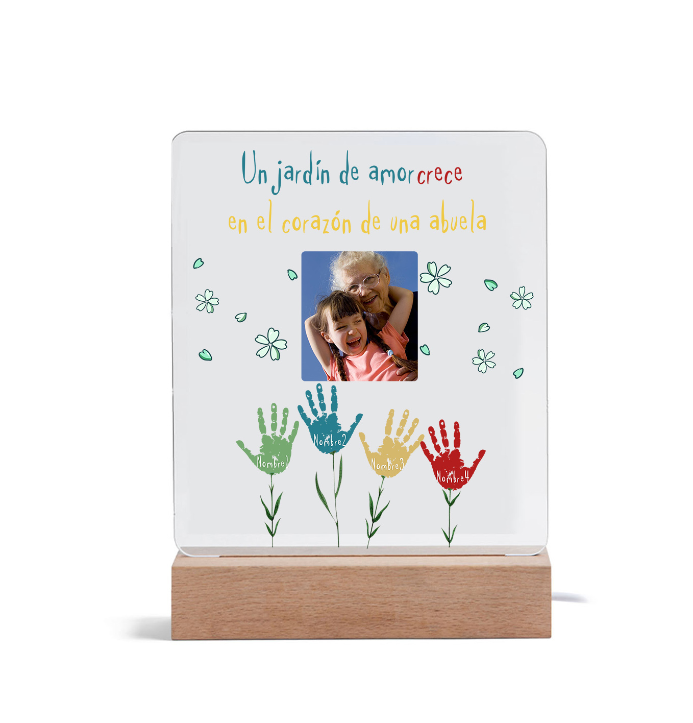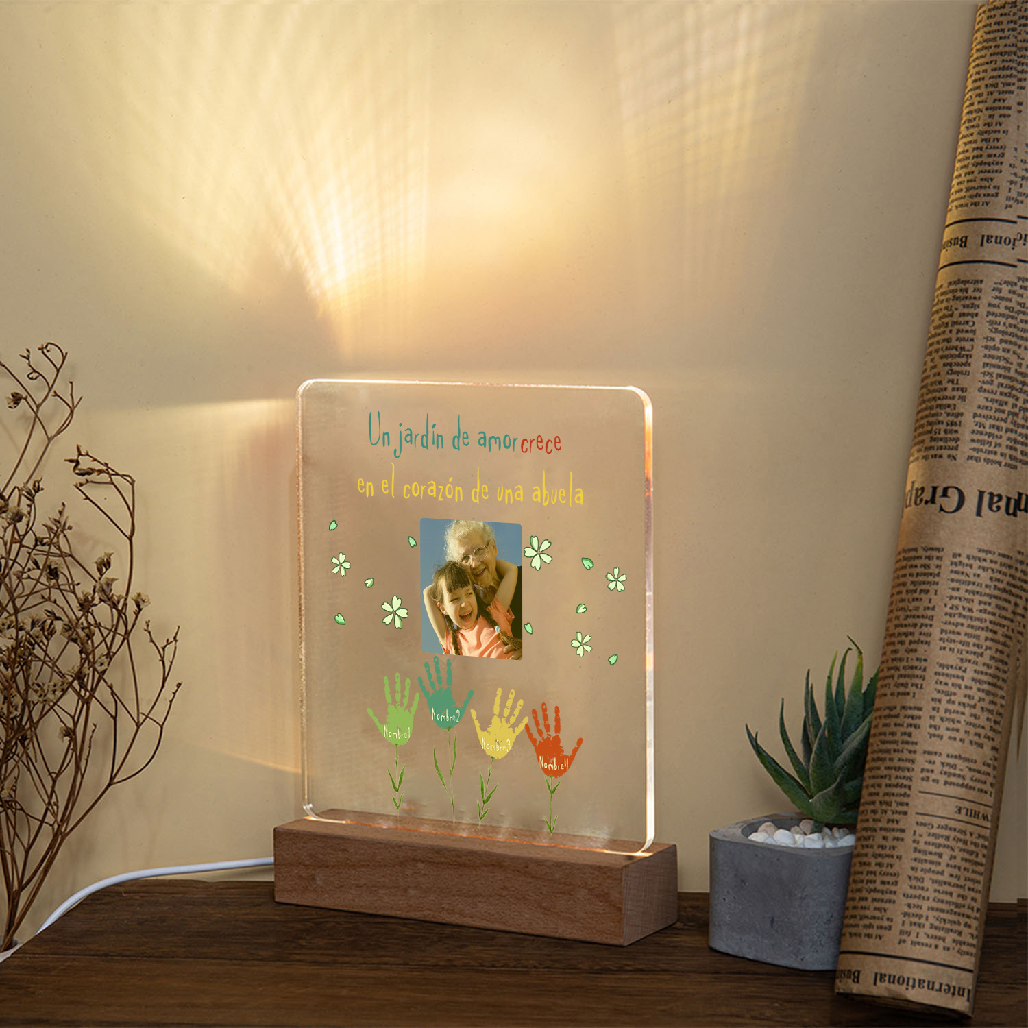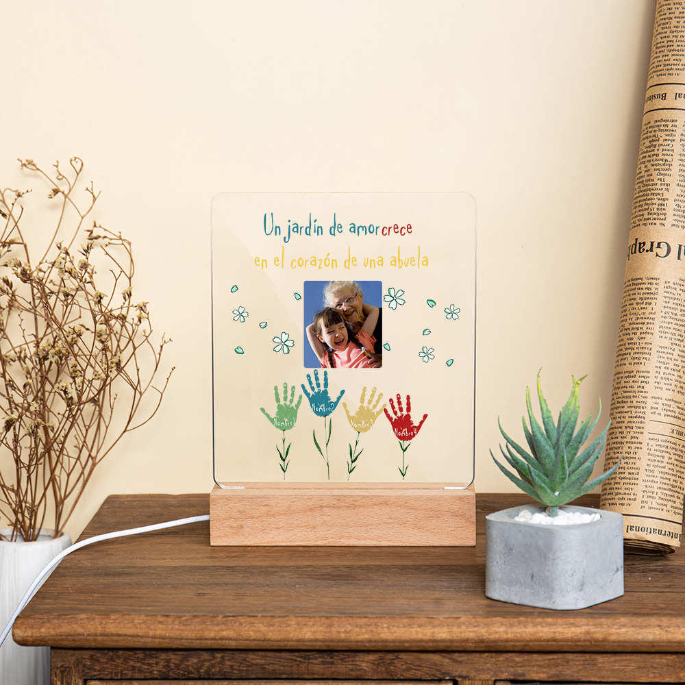 Lámpara de noche LED huella de mano foto cariñosa con 1 texto y 4 nombres personalizados