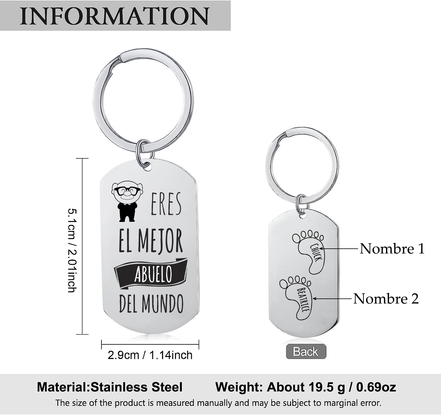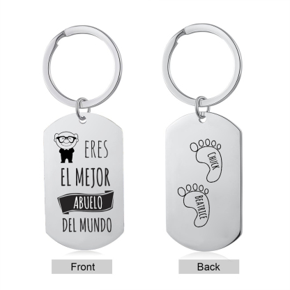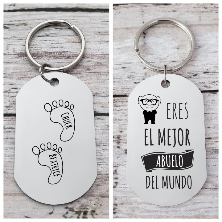 Llavero cariñoso con nombre para regalar a un abuelo por sus nietos en cualquier ocasión; como el día del padre, el día de los abuelos, por su cumpleaños etc... .Está elaborado en acero, es ideal para personalizar por la parte trasera con los nombres de los niños en las pisadas, el grabado está incluído en el precio del llavero. El proceso de grabado cuidadoso asegura un diseño personalizado nítido y duradero.