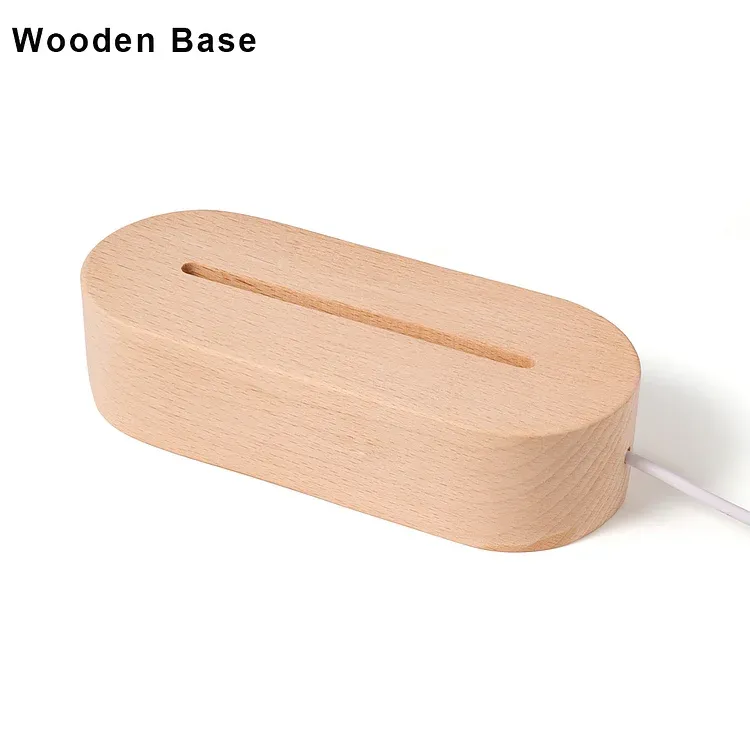 Nuestras luces nocturnas tienen una hermosa base ovalada/redonda de haya con luces LED cálidas y una parte superior de acrílico transparente con impresión UV. Estas luces son seguras de usar ya que no se calientan al tacto, y el color y la intensidad de las luces se pueden ajustar con los botones.