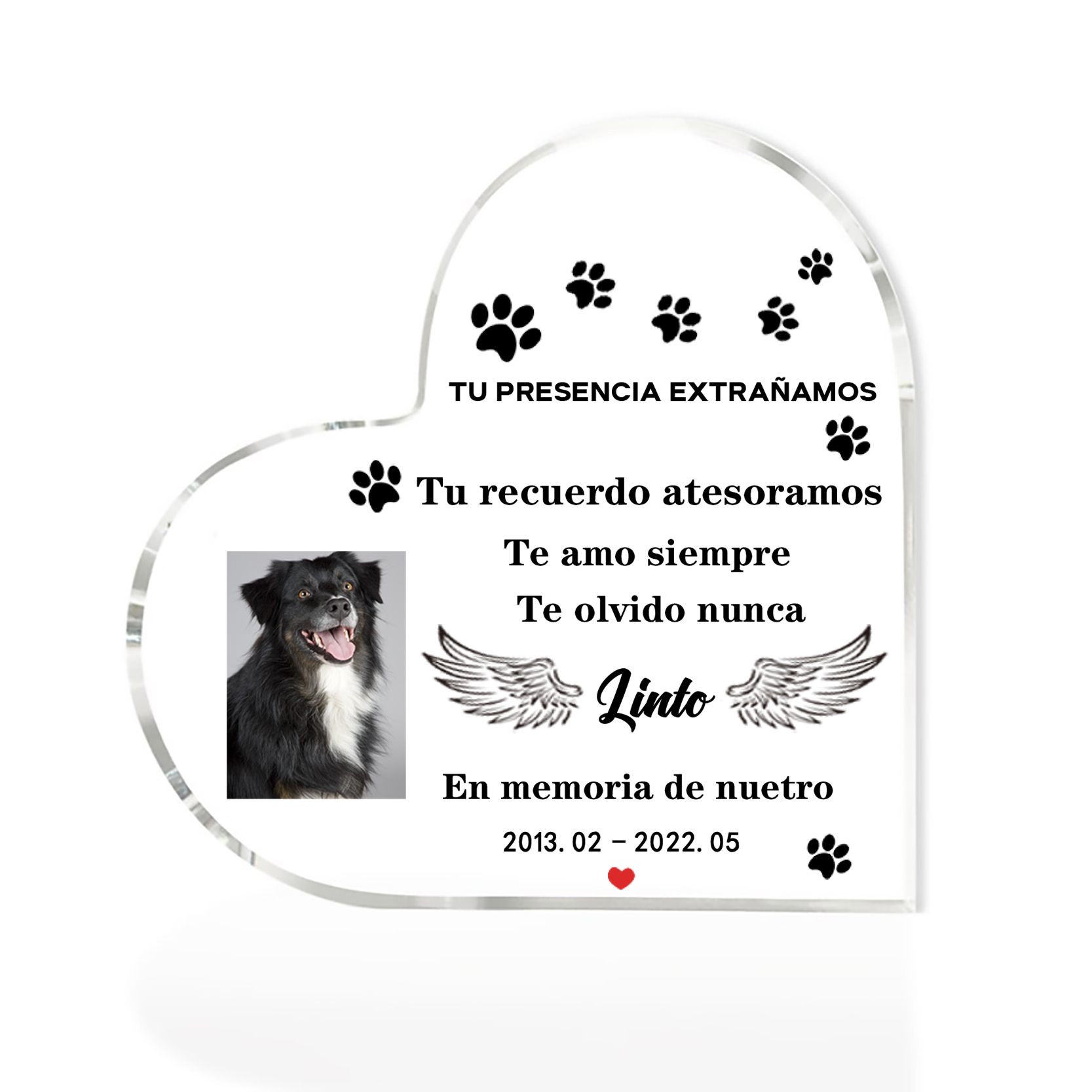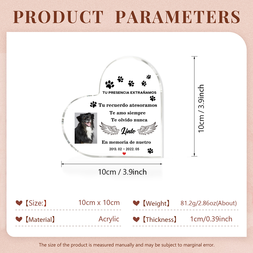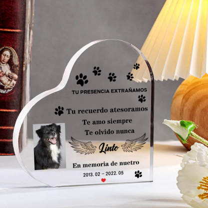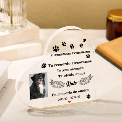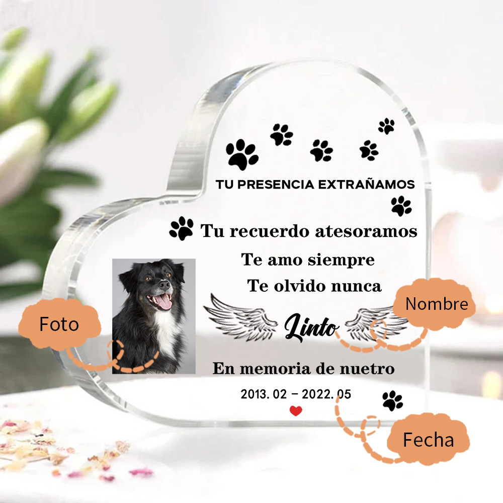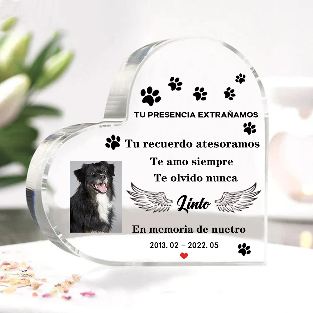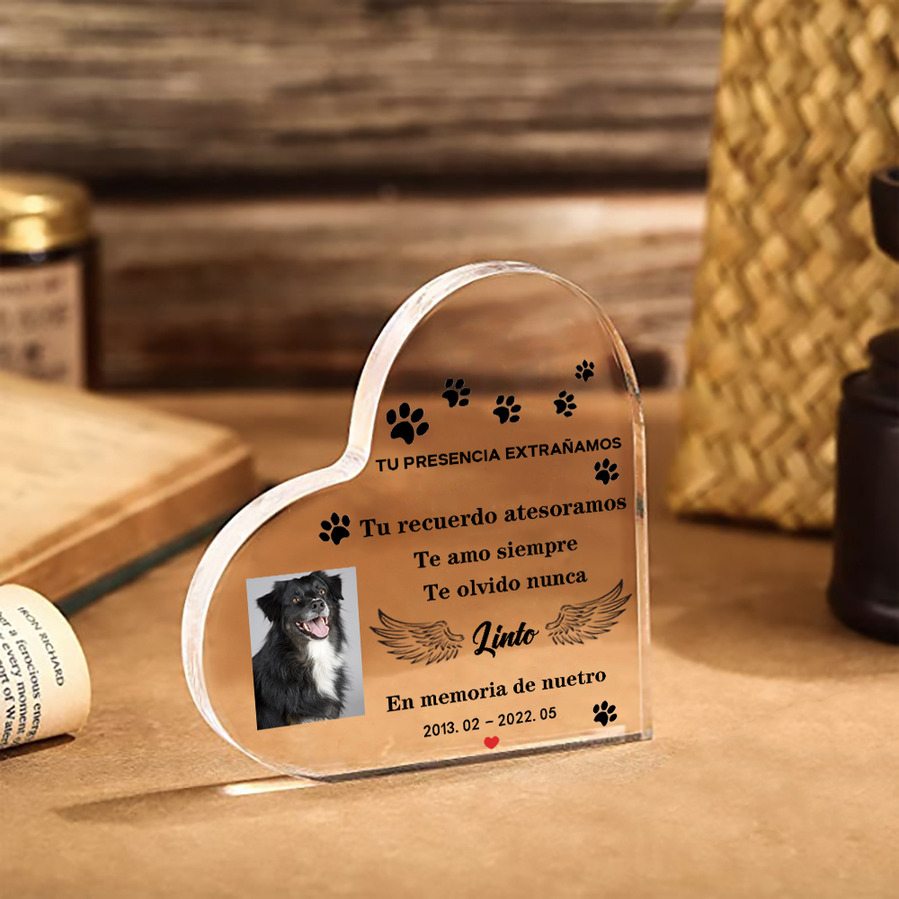 Placa de acrílico en forma de corazón con 1 foto, 1 nombre y año personalizados para conmemoración a mascota