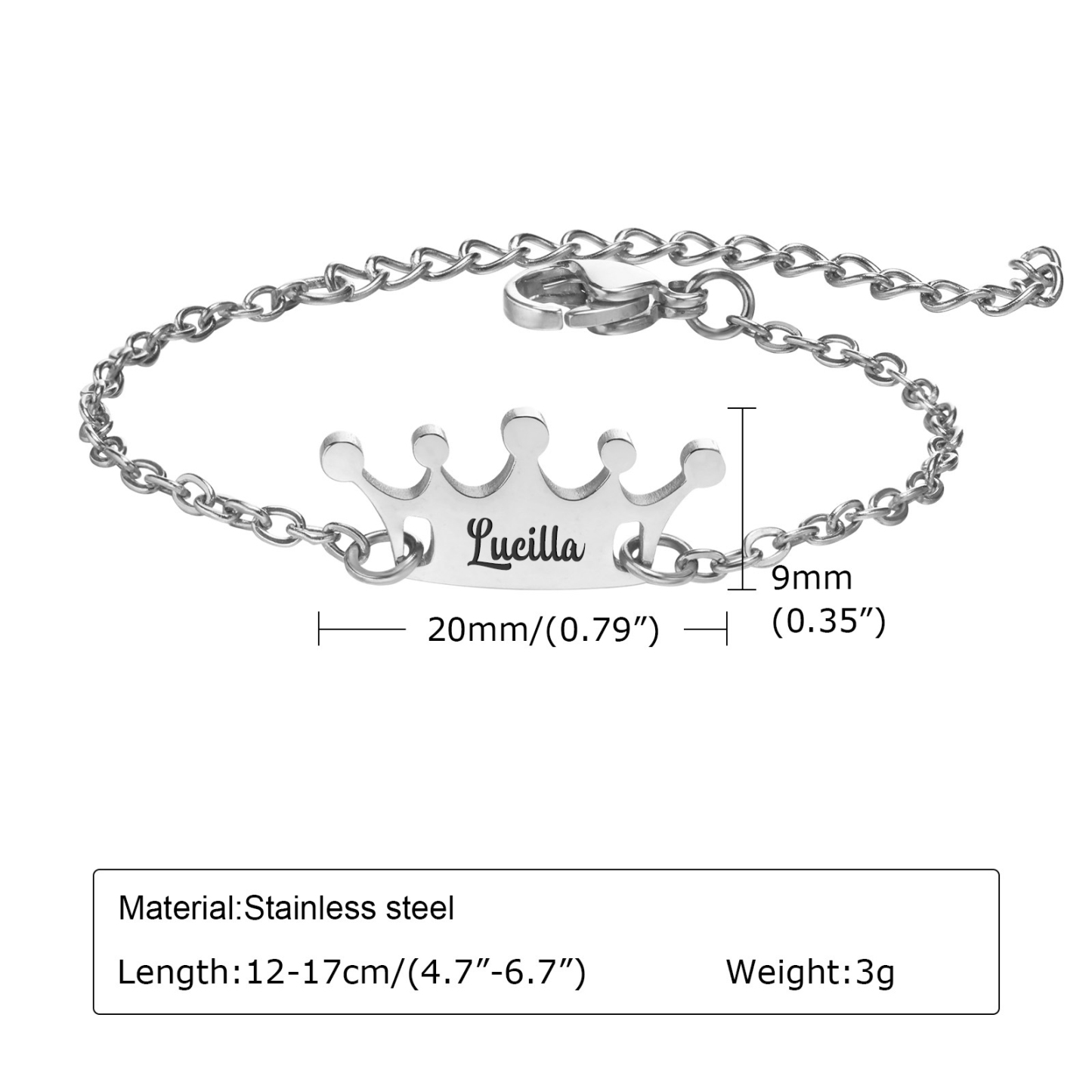 Pulsera ajustable con 1 nombre personalizado en una placa de corona