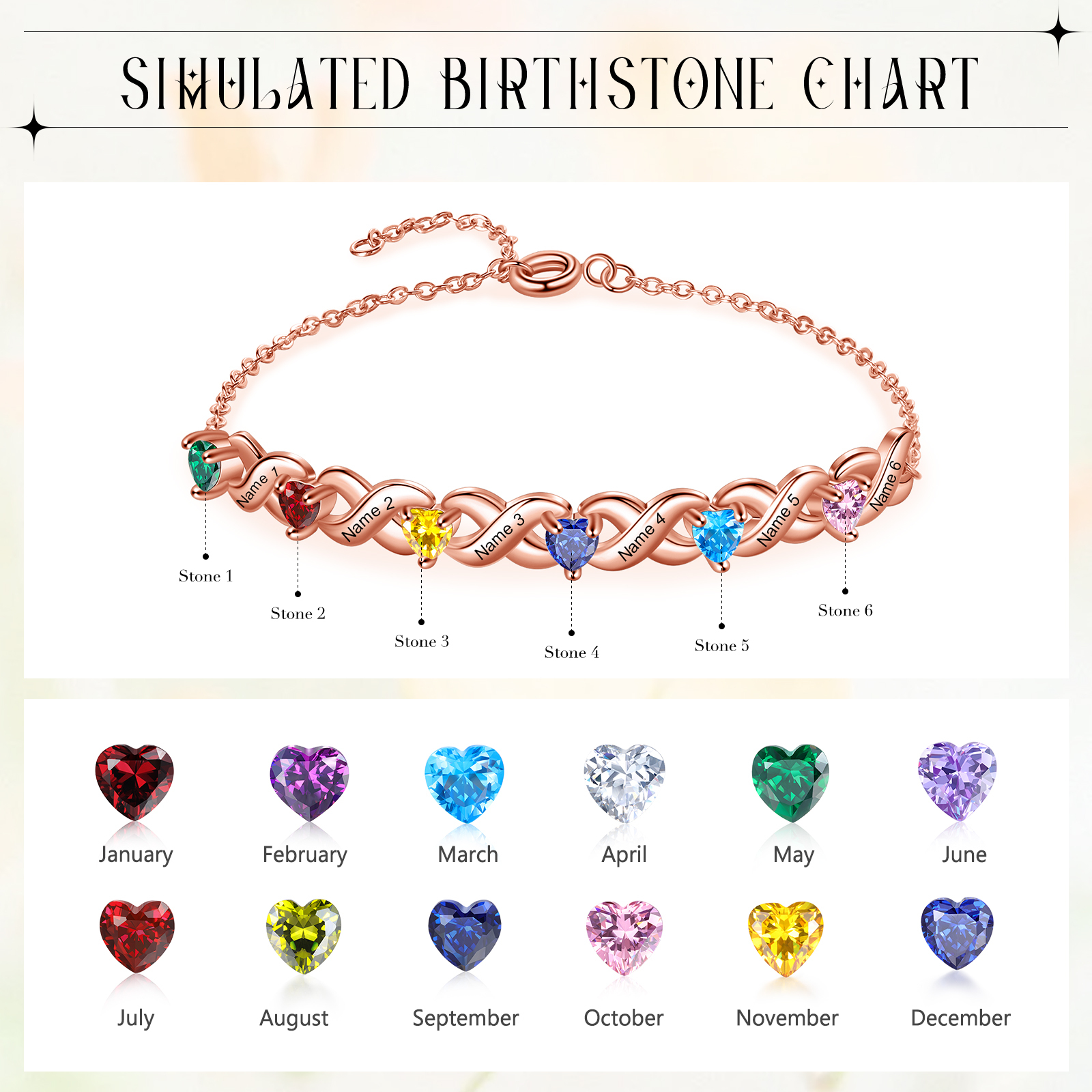 Pulsera para mujer infinito personalizada con 6 nombres y 6 piedras de nacimiento de corazón